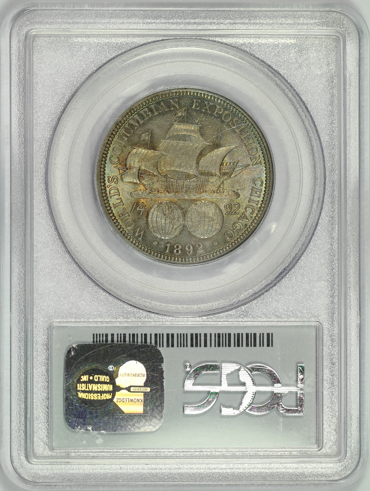 | The World's Columbian Exposition Commemorative Half Dollars are widely accepted as the first U.S. commemorative and the first in the widely collected classic commemorative series. However, some argue that the 1848 CAL. quarter eagles were really the first U.S. commemoratives. The Columbian Exposition Half Dollars were also the first United States coin of regular issue to depict an actual historical person, Christopher Columbus. The silver used to coin many of the Columbian Half Dollars came from the melting of then uncurrent coins which were pulled from circulation and held by the Treasury, many of which were half dimes last minted in 1873. The Columbian Half Dollars were minted for two years, 1892 and 1893. This example is an 1892 Columbian Half Dollar which has been graded MS65 by PCGS. This Columbian half is attractively toned on both sides with a golden-orange toning towards the center of each side that transitions into a blue-green toning towards the rims. The coin also has strong original Mint luster and some light marks and hits on the high points of the obverse and reverse. Note that the plastic holder has several light scratches that unfortunately show in the close up photos. An eye appealing above-average gem Columbian half dollar. |