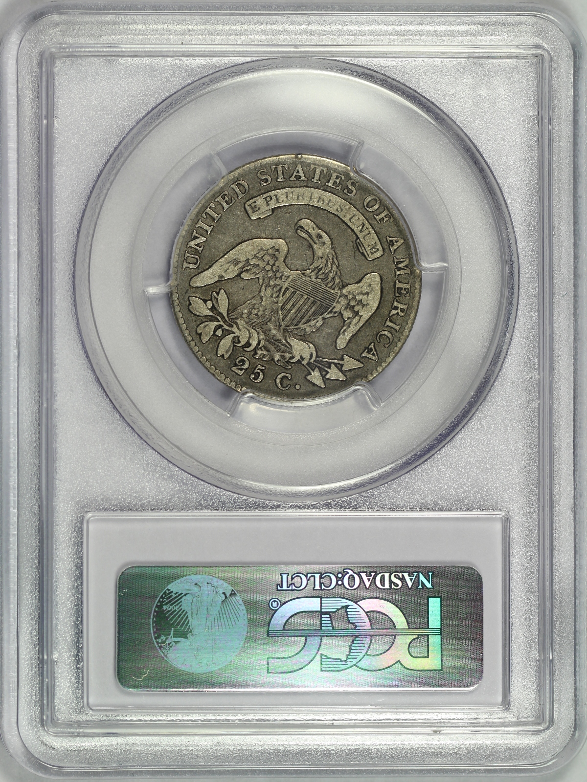 | The 1825/4/(2) Capped Bust Quarter is a popular overdate in the series. This example of the 1825/4/(2) Capped Bust Quarter has been graded VG10 by PCGS and is encapsulated in a newer-style edge-view holder. The coin has also been attributed by PCGS as being the Browning 2 die pairing. The coin has wonderful eye appeal with its medium grey fields and lighter devices, making for a circulated cameo effect. The coin has no major hits, scratches or other distractions and appears to be a very strong example for the grade. A hint of the under digits of the date can be seen as well, despite being well circulated. A very cool looking early quarter. |