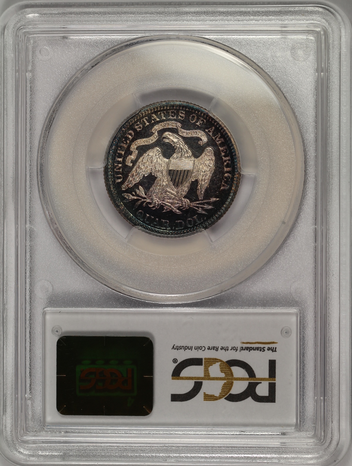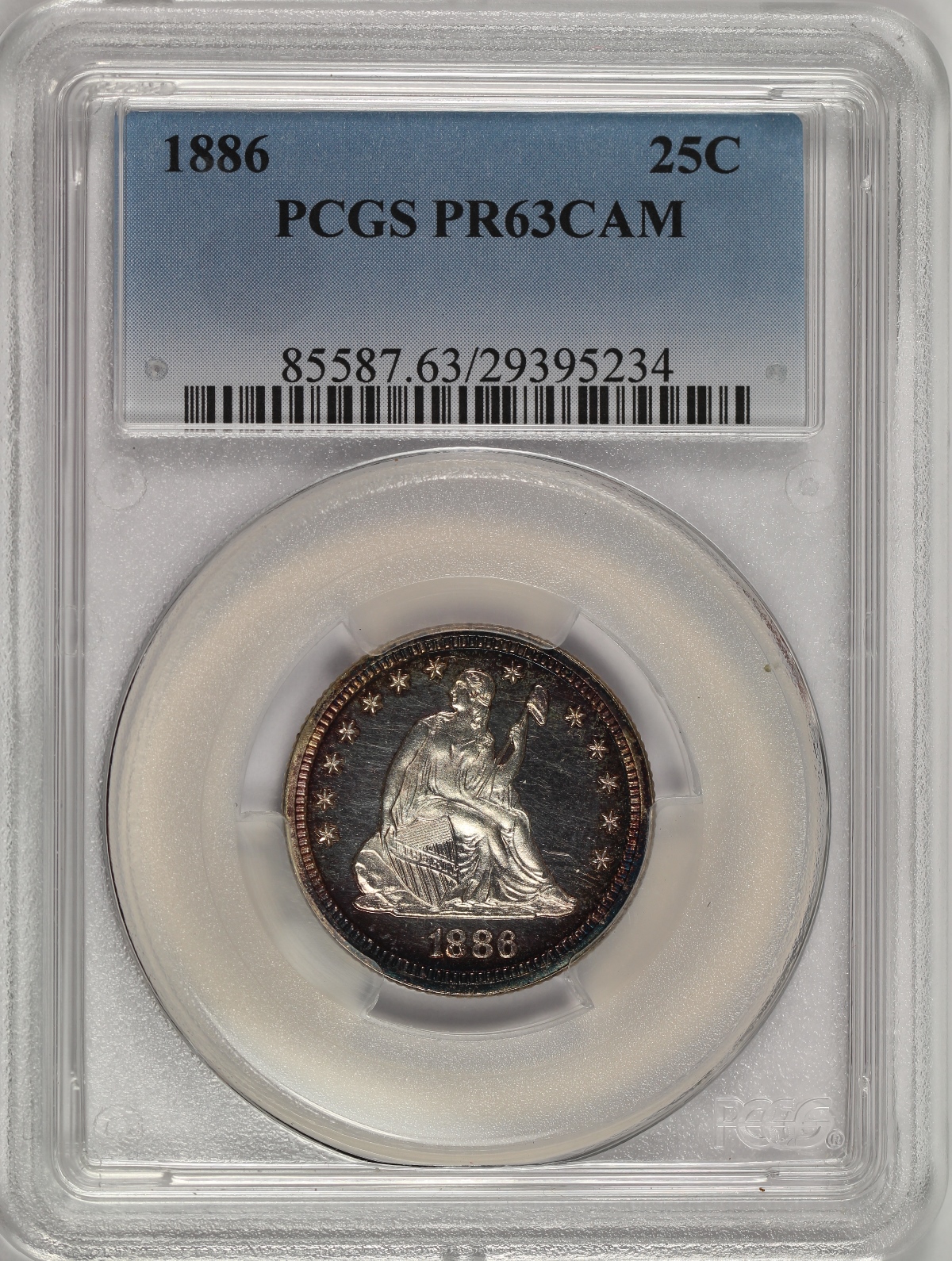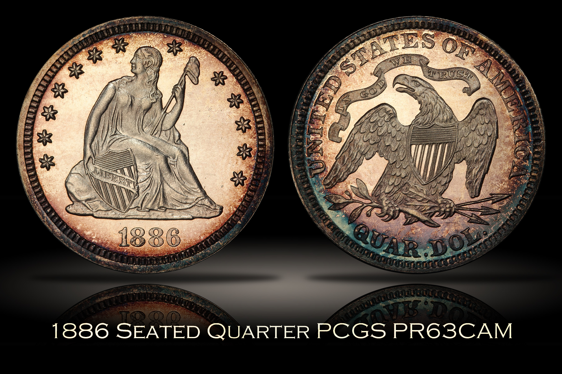 Check out this 1886 Proof Seated Liberty Quarter which has been graded PR63CAM by PCGS and is encapsulated in a newer-style edge-view holder. A TrueView photo was taken by PCGS which captures the beauty of this coin in the best light. With an ultra low mintage of only 886 coins, this coin is scarce in any condition, but it is especially nice to have an attractive example of that low mintage. Both sides of the coin exhibit strongly mirrored proof fields with some light hairlines present in the fields. The devices on both sides exhibit bright frost and extraordinary detail. A bit of colorful toning along the rim, particularly on the lower reverse, adds further to the overall eye appeal of this scarce proof Seated Liberty Quarter. |