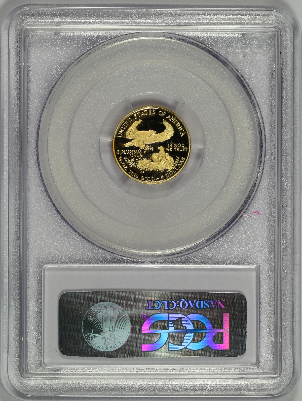 | This 1989-P $5 1/10 oz. Gold Eagle has been graded PR70DCAM by PCGS and is encapsulated in a newer-style edge-view holder. As the perfect grade suggests, the coin is virtually flawless. The only possible flaw to note is that the coin does have some light orange toning on the far left edge of both the obverse and reverse that is difficult to see in the images. Please note that given the mirrored surfaces of the coin, some reflections of minor marks on the plastic holder show in the photos, particularly on the image of the reverse, but are not on the coin itself. For reference, the current PCGS Price Guide value of this coin in PR70DCAM is $650. A really nice proof gold eagle with a perfect grade. |