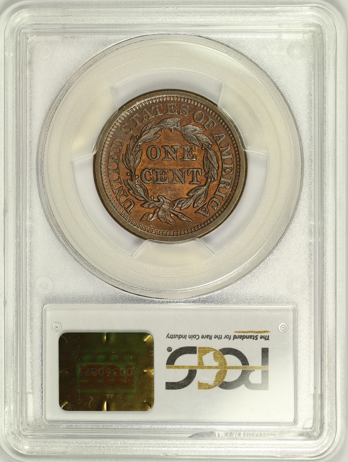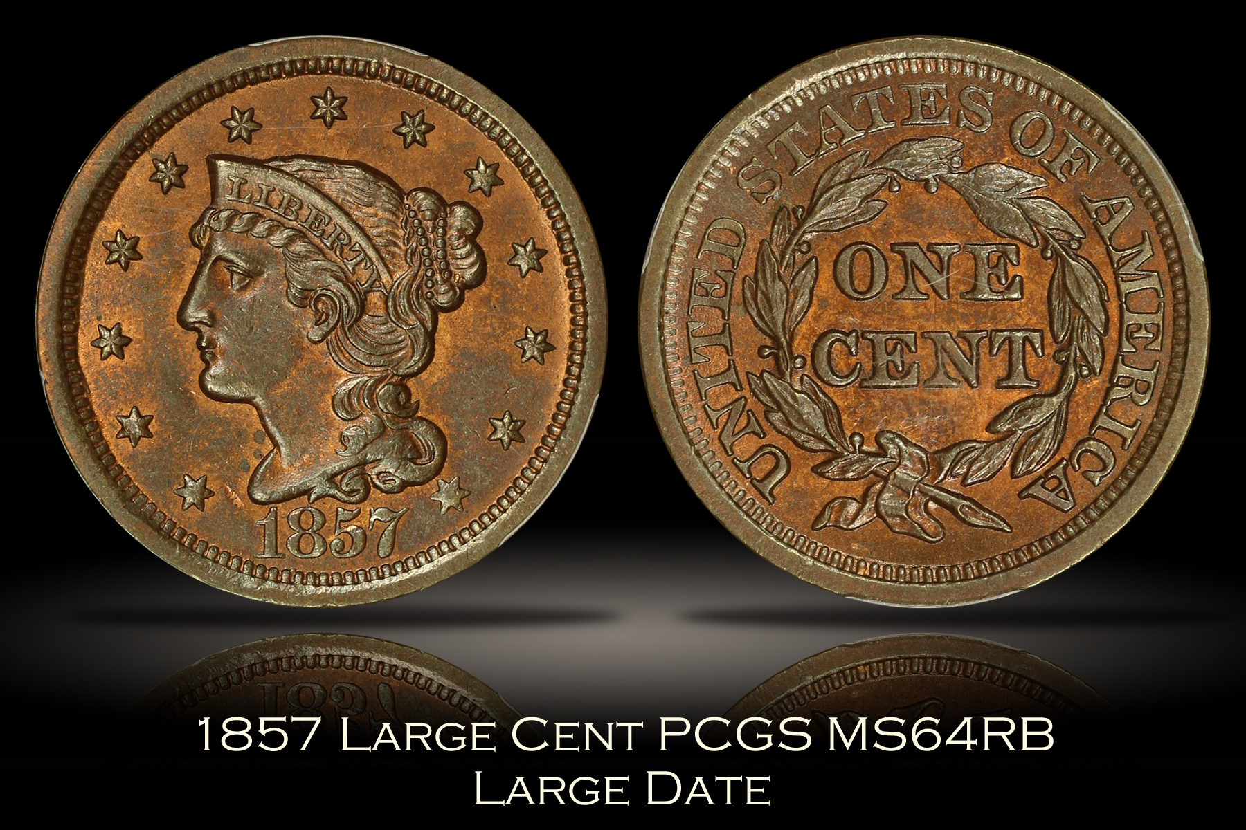This 1857 Large Date Large Cent has been graded MS64RB by PCGS and is encapsulated in one of the newer-style edge-view holders. The color of the coin is an even and pleasant red-brown color that is free of spotting or distracting discolorations. There are a few marks on the coin which keep it from the gem grade including one to the left of the date and some