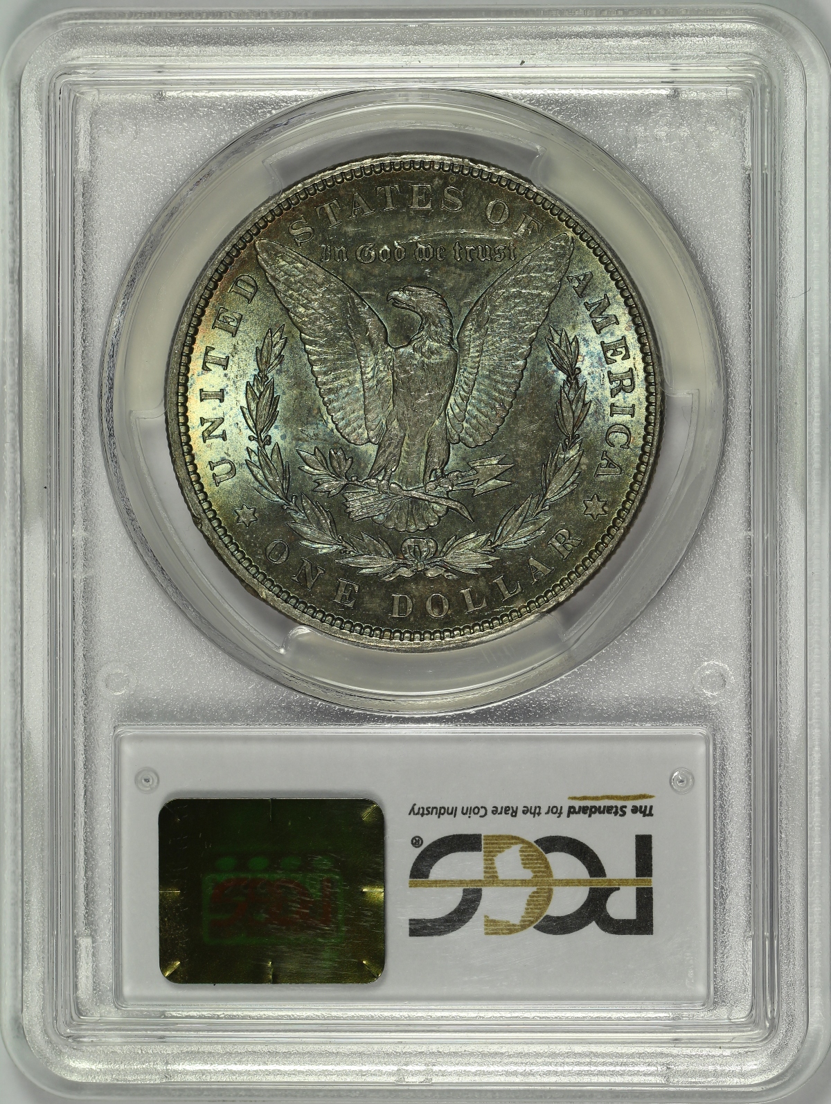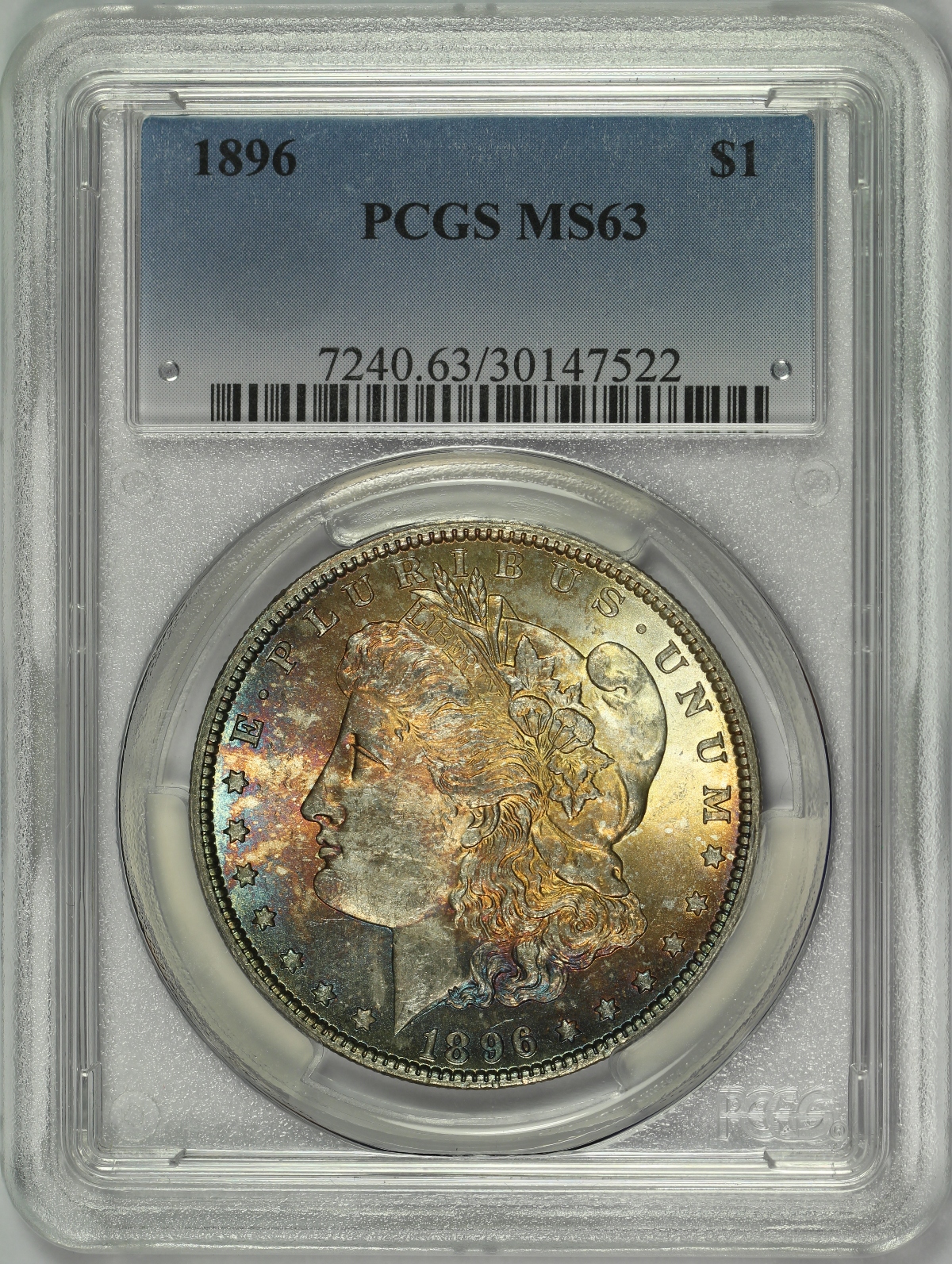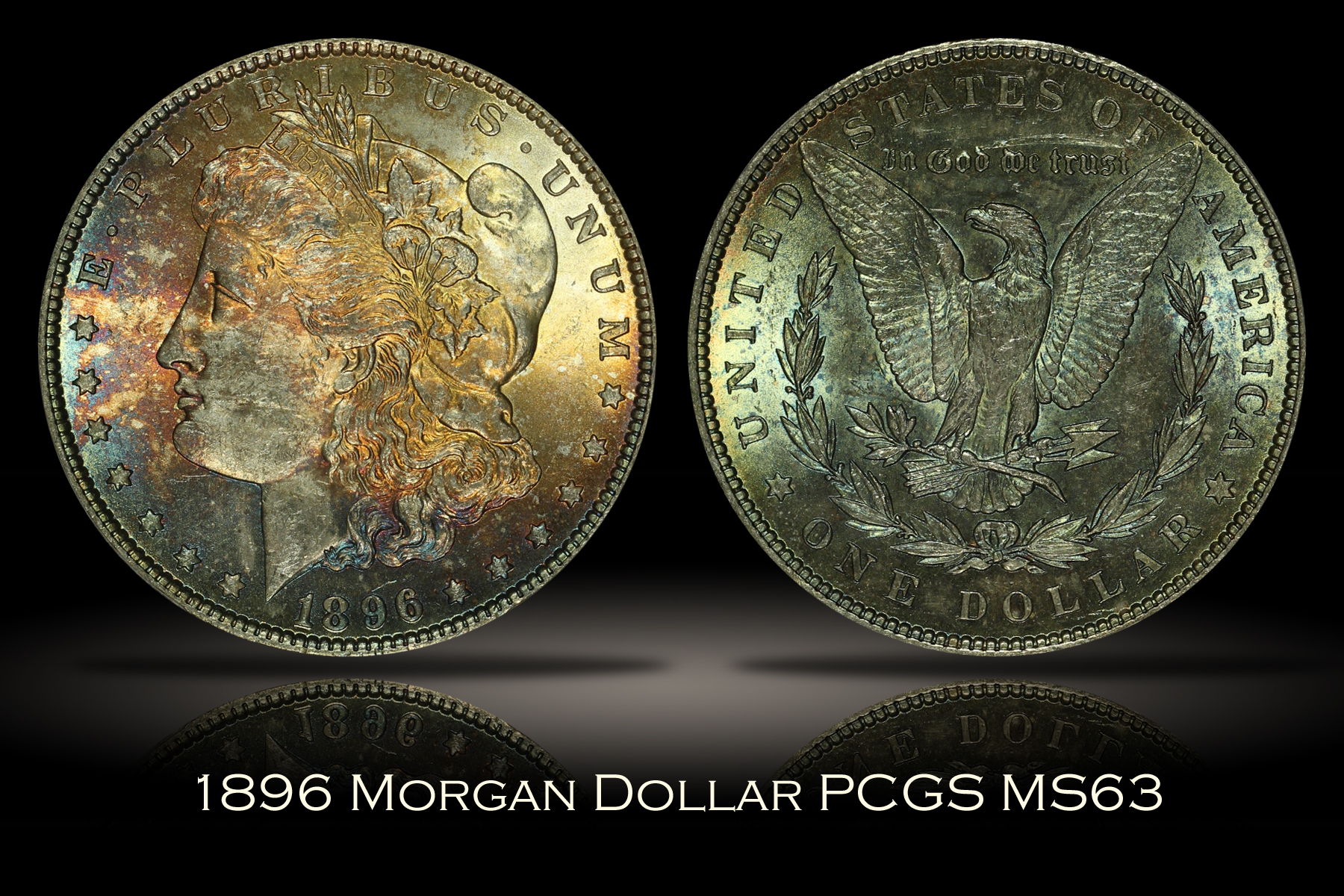 | This 1896 Morgan Silver Dollar has been graded MS63 by PCGS and is encapsulated in the newer-style edge-view holder. The coin has very strong cartwheel luster on both sides and is a great looking piece. The toning of the coin is particularly attractive with the obverse nearly fully toned with golden, orange, red and blue colors. The reverse is also fully toned in a mostly teal or seafoam green color. There are several minor marks on the obverse, but much less than you normally see on an MS63 graded dollar. The reverse of the coin has one significant mark above the motto which clearly limited the overall grade of the coin, keeping it from grading a grade or two higher. That said, this is a beautiful Morgan Dollar that gives you lots of eye appeal for the money. |