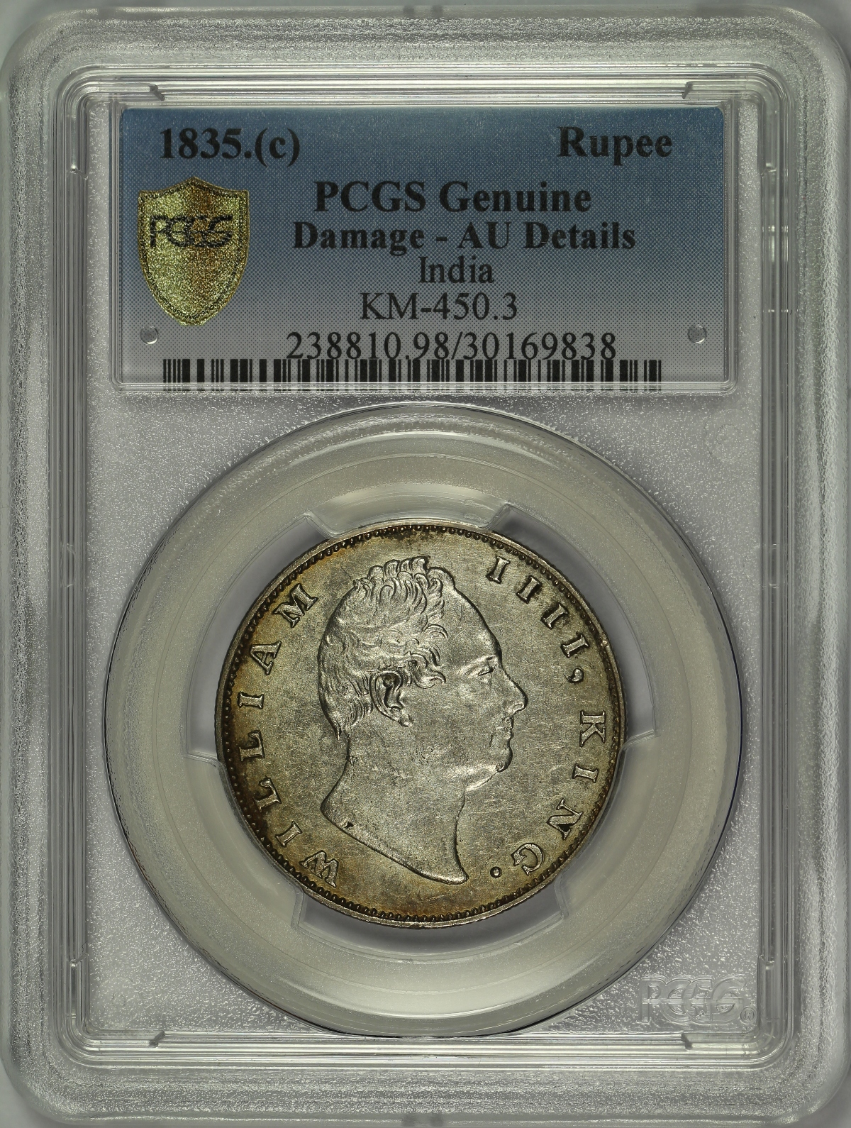 Here is an 1835.(c) British India Silver Rupee which has been certified by PCGS as having AU Details. This is the variety with the “F” incused at the bottom of the obverse bust and is cataloged as KM# 450.3 in the Krause Standard Catalog of World Coins. Please note that PCGS did not assign a numerical grade to this piece because of damage to the coin. The reverse of the coin unfortunately has a deep scratch between the N and E of ONE which prevents a numerical grade. That said, the coin exhibits strong details on both sides with minimal circulation wear. The coin also has decent luster and some light toning along parts of the rims. The surfaces of the coin show several small marks and light hairlines on both sides, but nothing as significant or distracting as the deep scratch on the reverse. Despite that damage to the reverse it is a well-detailed example of the type. |