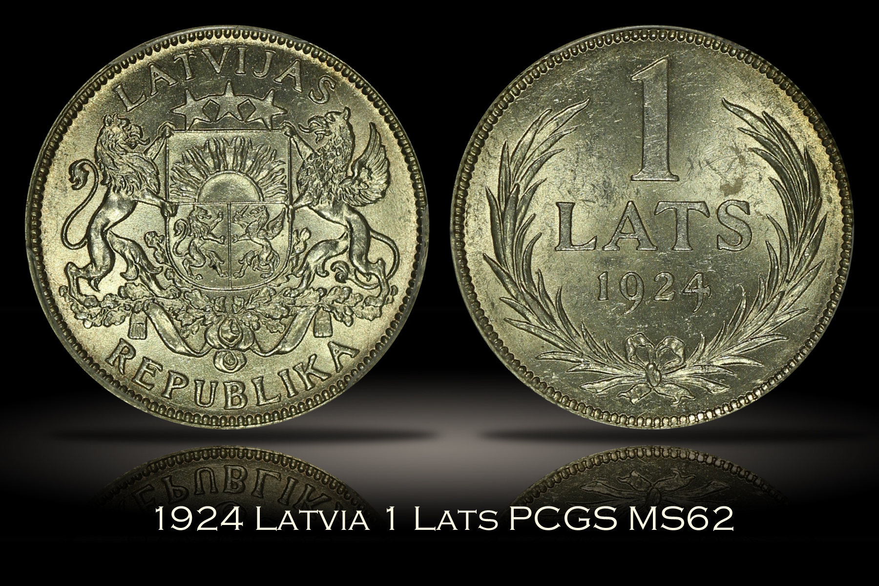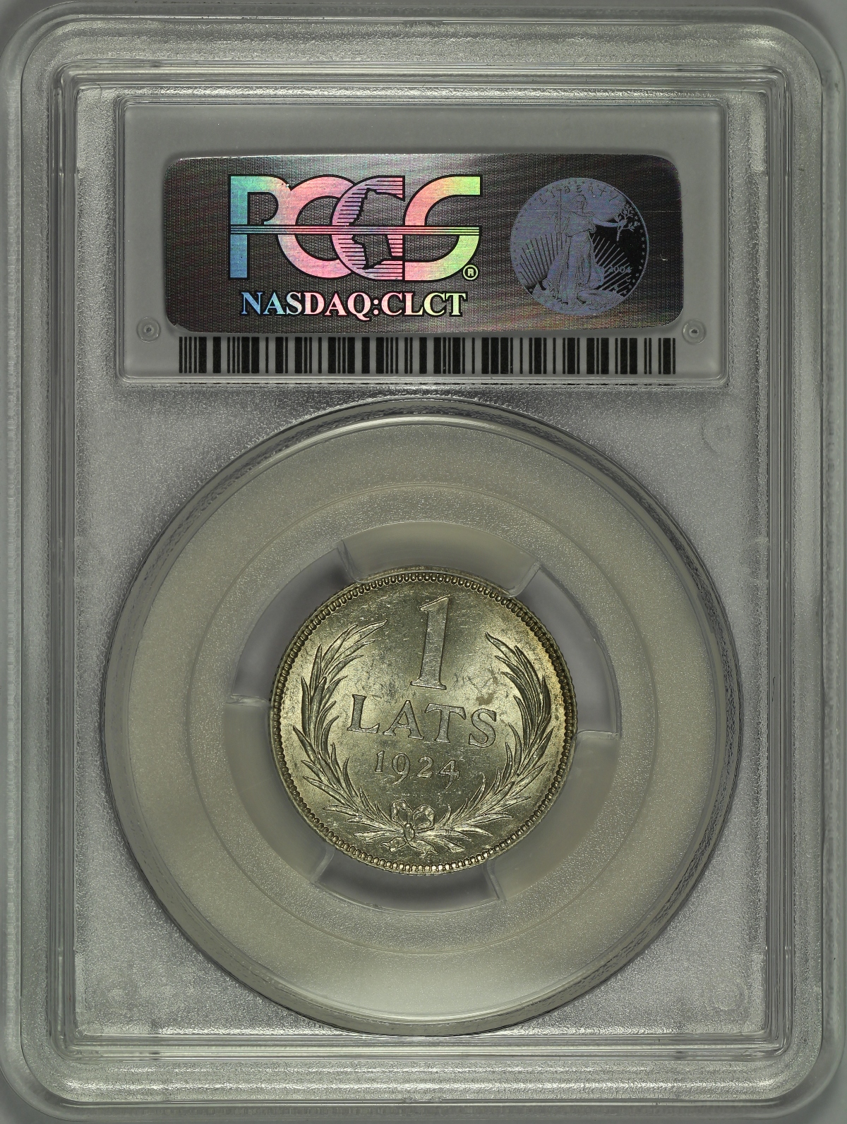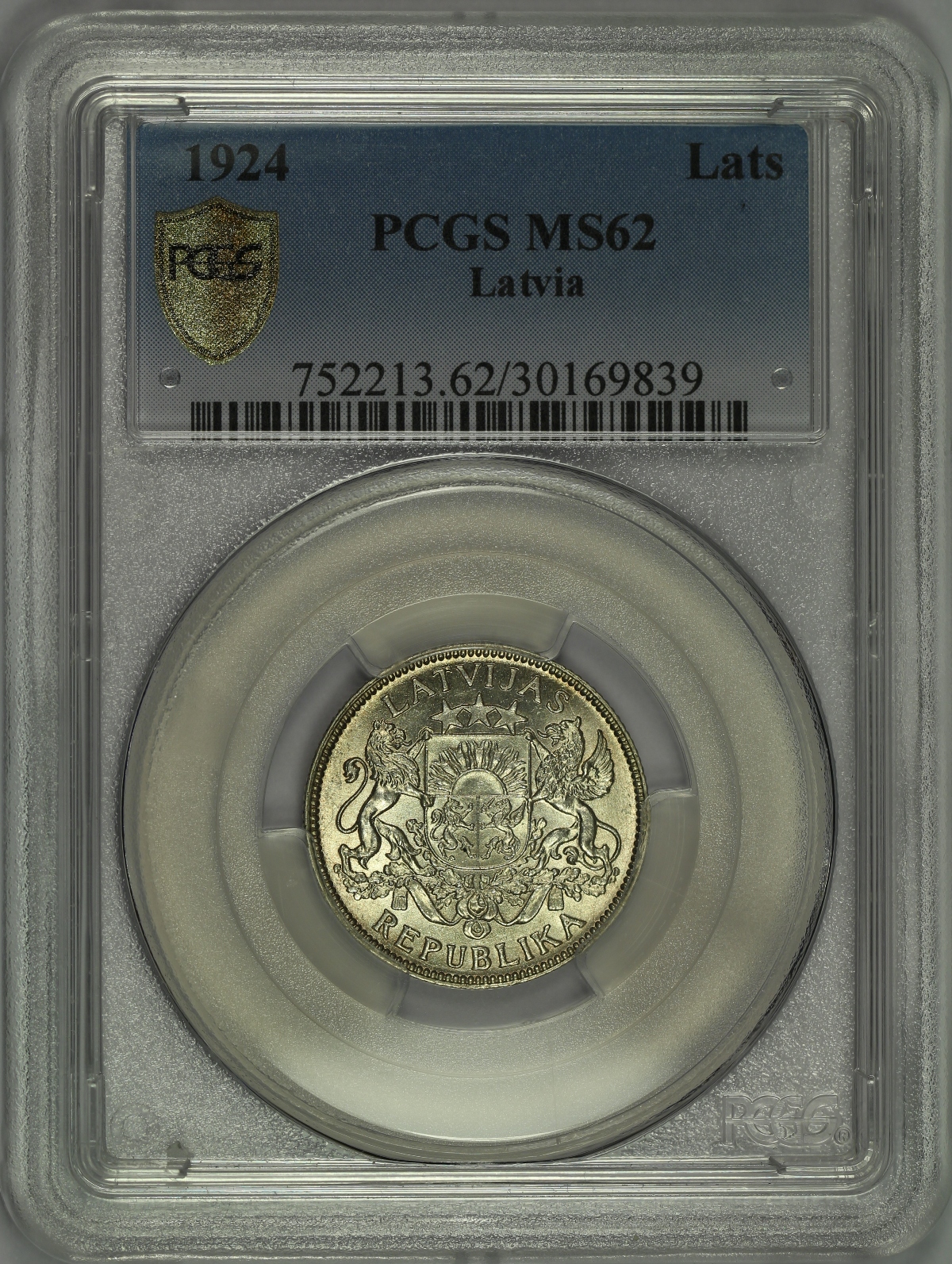 This 1924 Latvia 1 Lats has been graded MS62 by PCGS and is encapsulated in the newer-style edge-view holder. This is a beautiful coin that is struck from .835 pure silver. The obverse design is boldly struck and wonderfully detailed. The coin is bright white and has strong luster, particularly on the obverse which is nicer in appearance than the assigned grade suggests. The reverse of the coin is also bright white and lustrous, but also exhibits a good amount of light marks in the fields and on the devices which seemingly have limited the grade of the coin to MS62. That said, the coin has no other major issues of note and is a very nice example of the type. |
