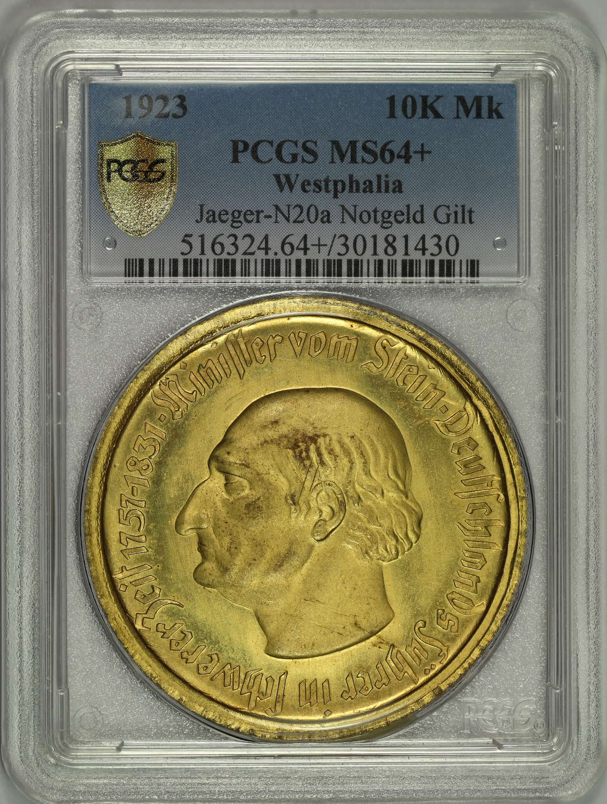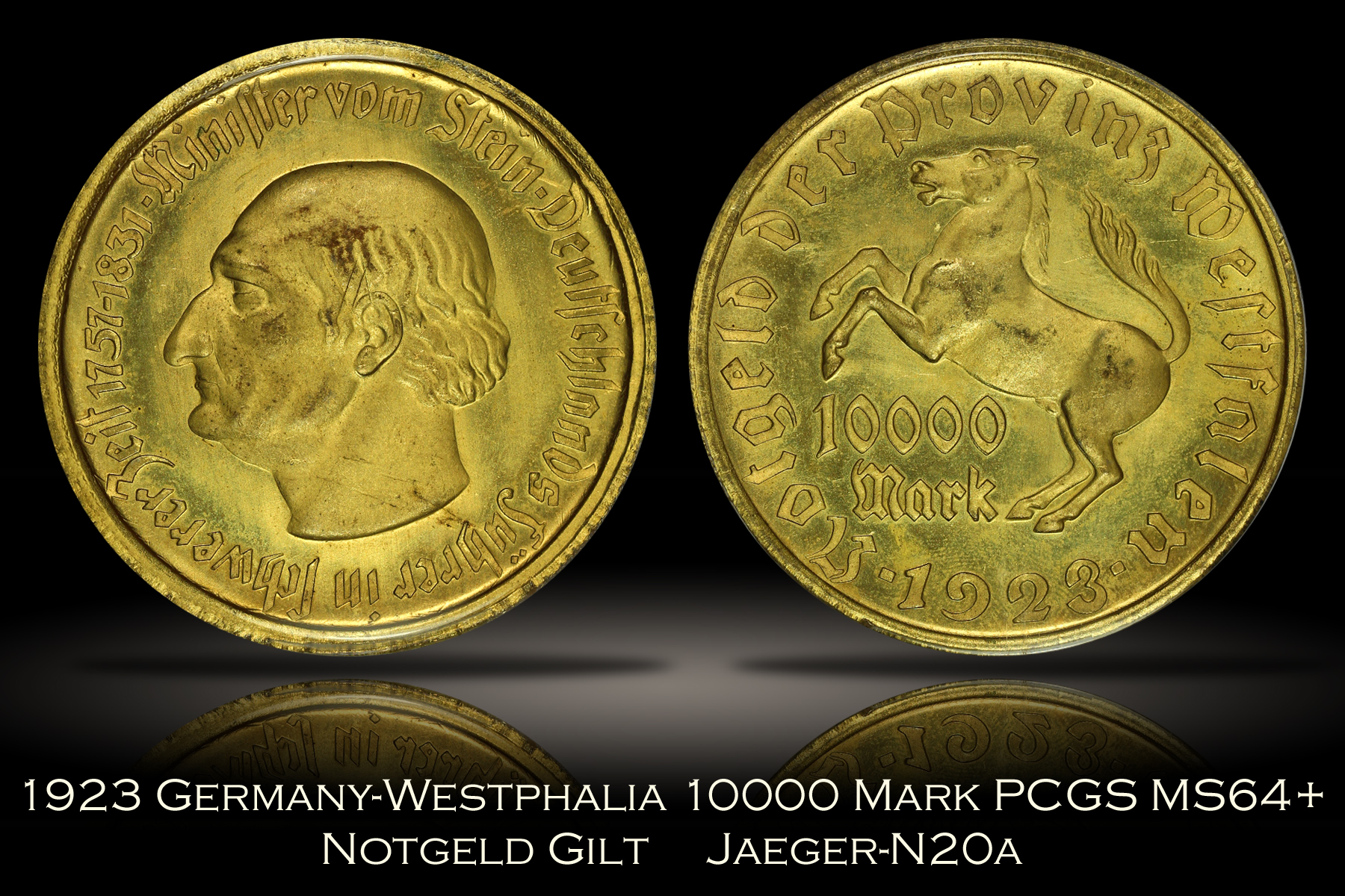 | Generally, “notgeld” is money issued during a time of economic or political crisis, often by an institution without official sanction from the government, at a time when money is not readily available from the government central bank. Most commonly, notgeld were issued in Germany from World War I through the period of hyperinflation in the early 1920s. Notgeld was often in the form of paper money, but was also issued in coins of various compositions. The notgeld piece offered here is a 1923 Westphalia Germany 10000 Mark gilt coin which has been graded MS64+ by PCGS and is encapsulated in the newer-style edge-view holder. The coin has been cataloged as Jaeger-N20a and the reference has been noted on the PCGS label. For the type, this is a very nice looking high-grade specimen with wonderful gold color with only slight discolorations on the high points of the design. The coin otherwise has no major hits or marks of note. The coin also has decent luster and slightly prooflike fields which do not show in the photos provided. An overall great looking near-gem notgeld piece. |