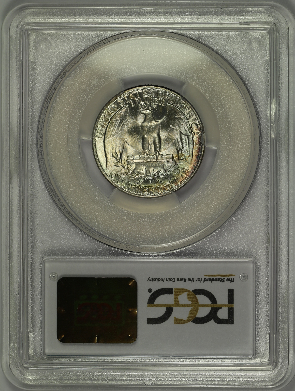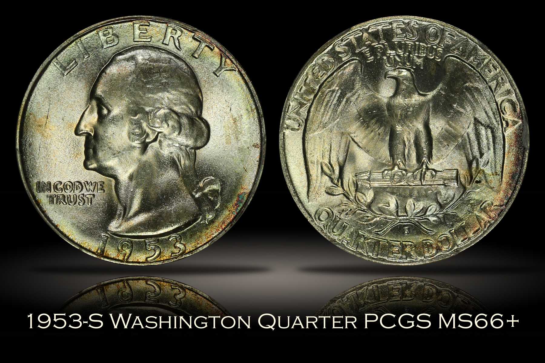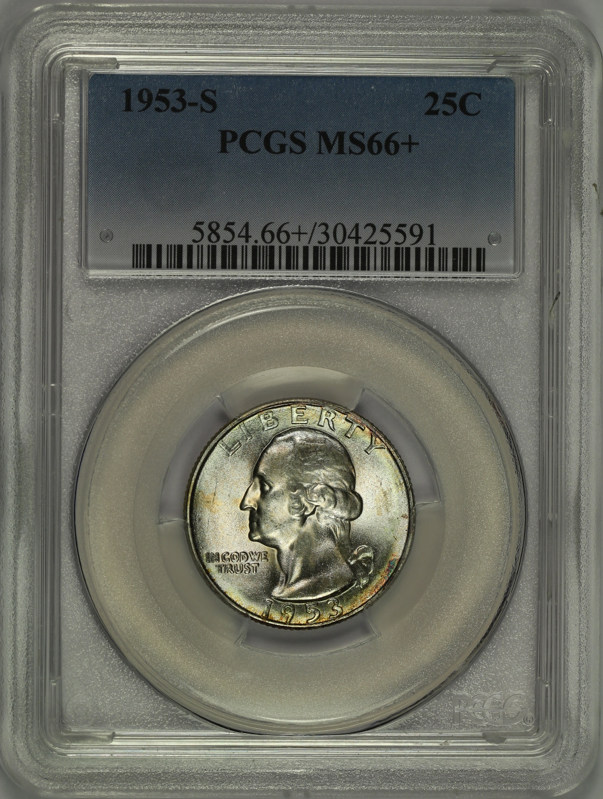 | Here is a 1953-S Washington Quarter that has been graded MS66+ by PCGS and is encapsulated in a newer-style edge-view holder. The coin is bright and very lustrous and has relatively few marks as the grade suggests. There is also a small amount of colorful toning focused along the rim, particularly at the lower obverse rim. Overall, this is an eye appealing high-grade example of the silver Washington Quarter. |