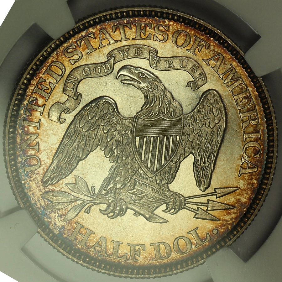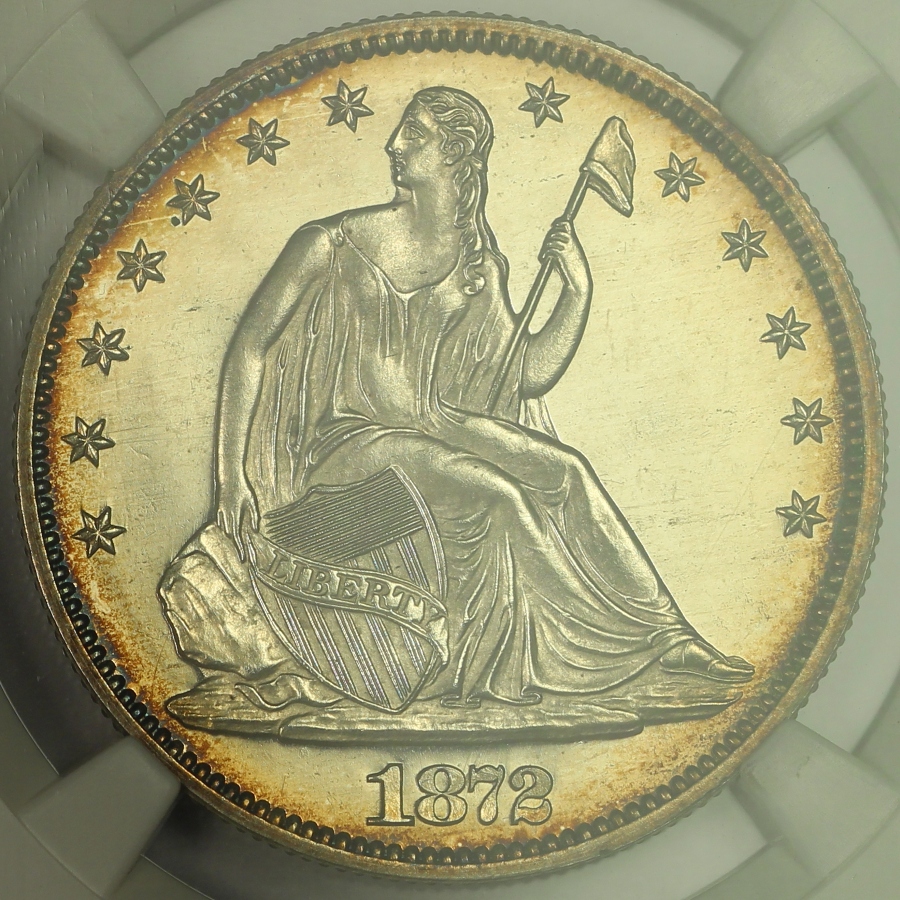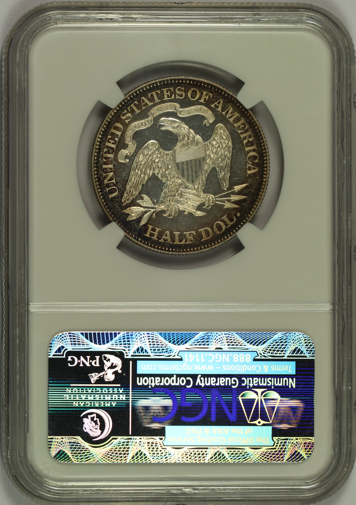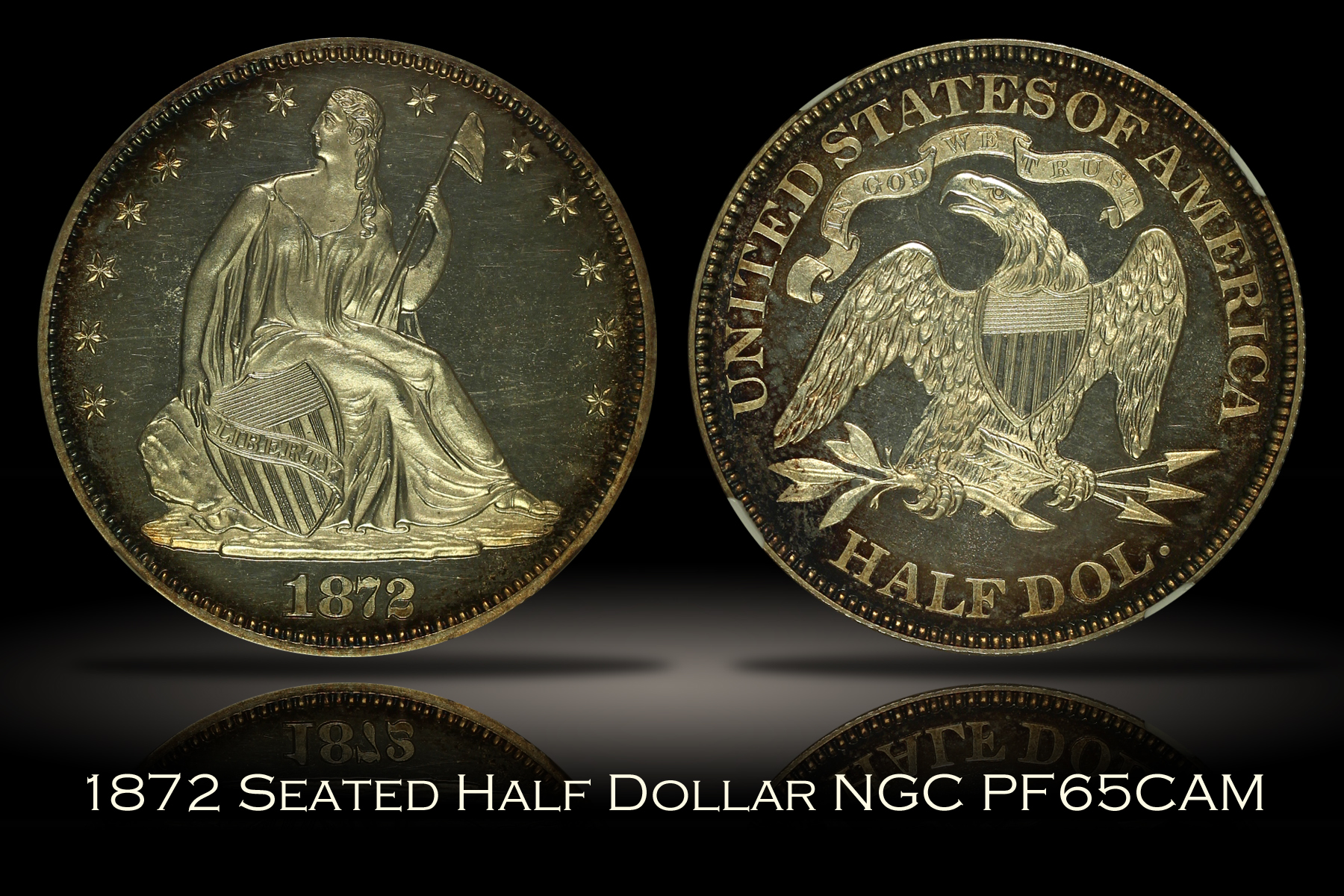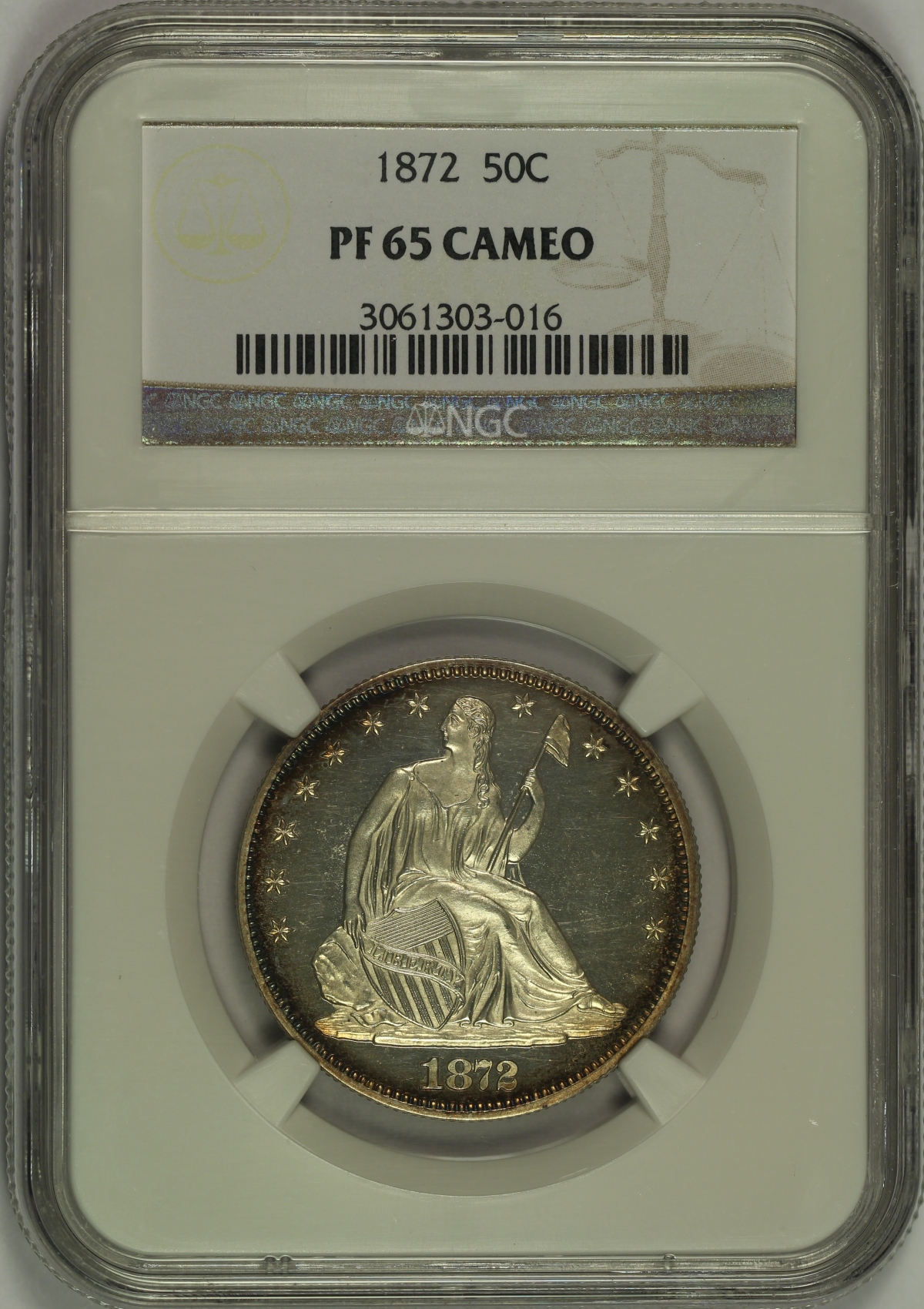 Here is an amazing 1872 Proof Seated Liberty Half Dollar which has been graded PF65CAM by NGC and is encapsulated in a newer-style edge-view holder. With a mintage of only 950 coins, this coin is scarce in any condition, but is likely one of the better surviving examples from that original mintage. The coin is very well preserved and quite eye appealing. The mirrors are slightly hazy, but are still relatively deep with devices that contrast with bright frostiness. There are some minor marks noticeable in the fields under magnification, but nothing significant. The piece also exhibits orange, red and blue rim toning that encircles both sides of the coin. A wonderful gem example of the Proof Seated Liberty Half Dollar.
