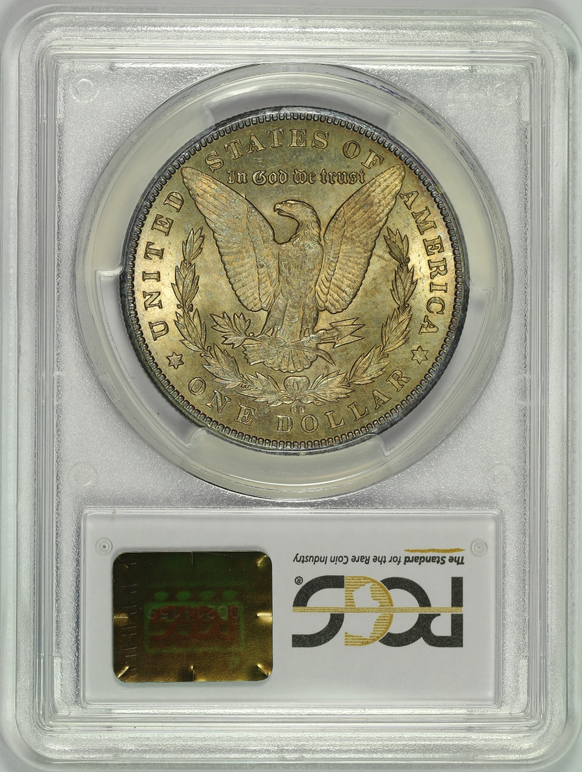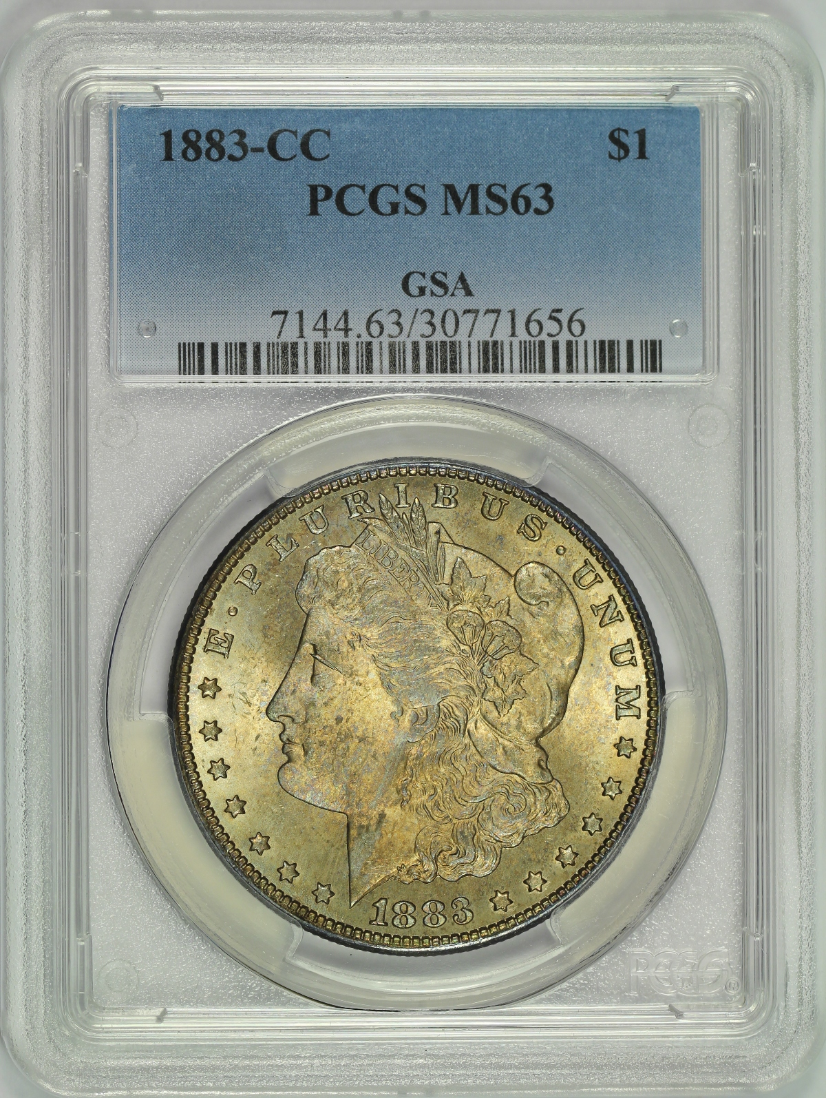 | Here is an 1883-CC Morgan Silver Dollar which has been graded MS63 by PCGS and is encapsulated in the newer-style edge-view holder. The PCGS label indicates the coin was part of the GSA Hoard, but as you can see the coin was freed from the original GSA black holder and is now in a PCGS slab. The coin is not your typical bright white Carson City Silver Dollar, but instead is toned a very attractive medium gold color on both sides. The coin also has nice cartwheel luster which is somewhat hidden in the photos. There are several small marks on the obverse of the coin and a few on the reverse too, including one larger hit on the eagle’s breast, yet the coin still appears to be a strong example for the assigned grade. An eye appealing toned example of a Carson City Morgan Silver Dollar |