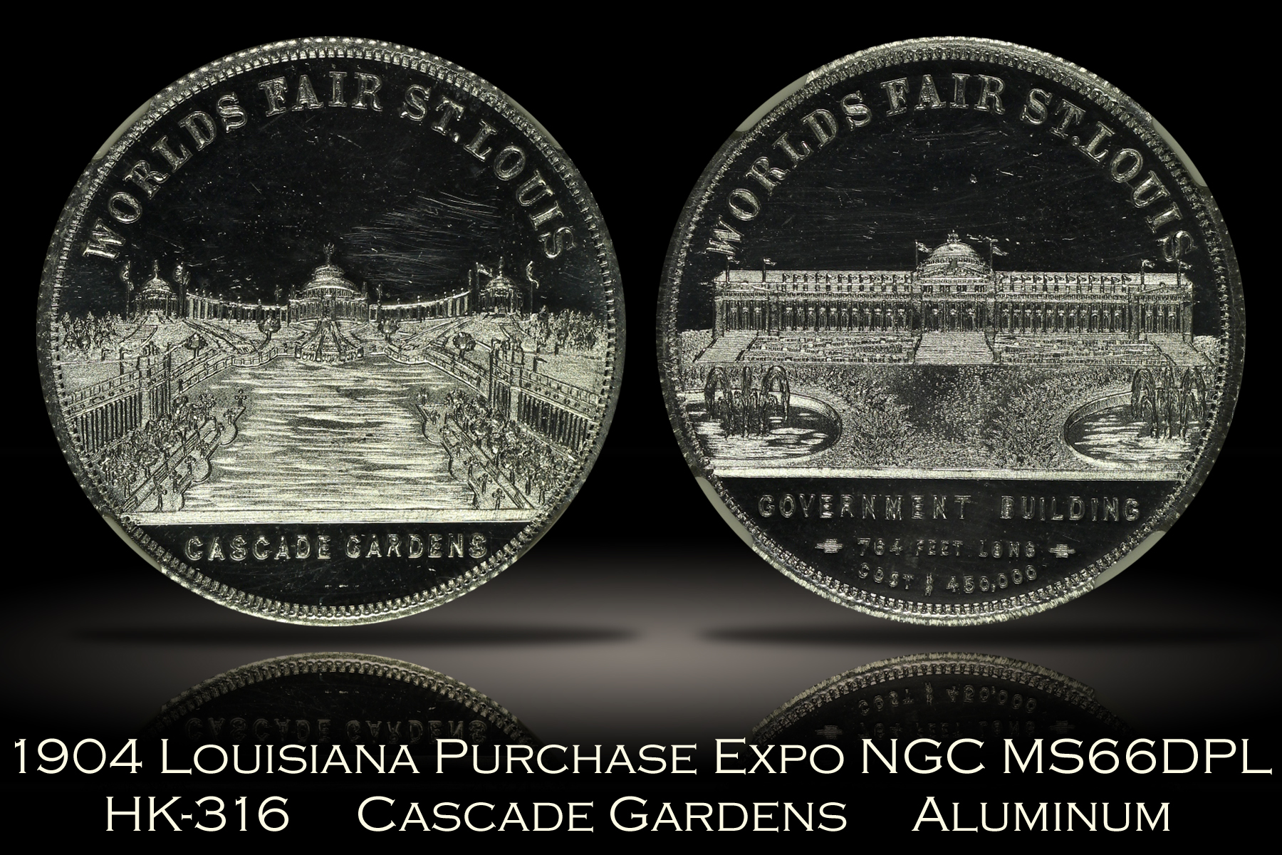 | The 1904 Louisiana Purchase Exposition was a major World’s Fair that was held in St. Louis, Missouri. As part of the World’s Fair, the 1904 Summer Olympics were also held in St. Louis. Several medals were produced in connection with the 1904 World’s Fair. This is one of the so-called Exhibition Palace Dollars from the Louisiana Purchase Exposition featuring the Cascade Gardens and the Government Building which is listed as HK-316 in the Hibler-Kappen book on So-Called Dollars and has been graded MS66DPL by NGC and is encapsulated in a newer-style edge-view holder. The obverse features a detailed rendition of the Cascade Gardens. The reverse is a detailed rendition of the Government Building with notes that it was 764 feet long and cost $450,000. This piece is bright white and very lustrous. The piece also has strong prooflike mirrored fields with frosty devices. This piece is by far the finest known example of the HK-316 graded by NGC as the only MS66DPL; the next closest specimens are a few MS64DPL examples and a couple of MS64PL pieces. An opportunity to get the finest known example of this so-called dollar. |