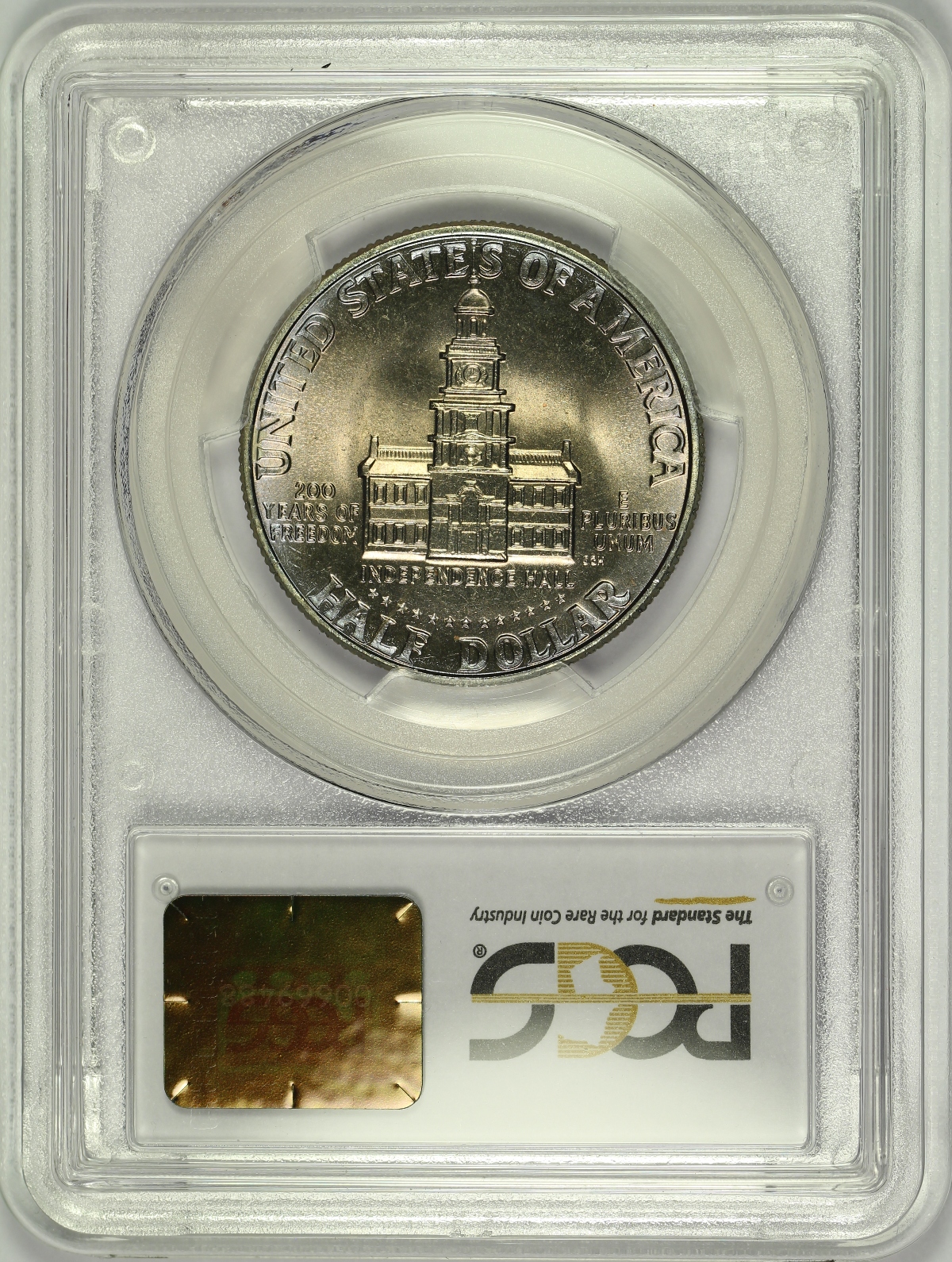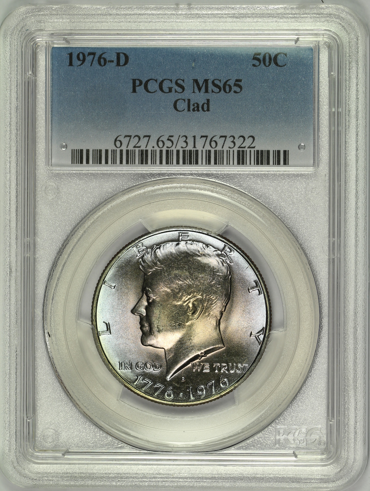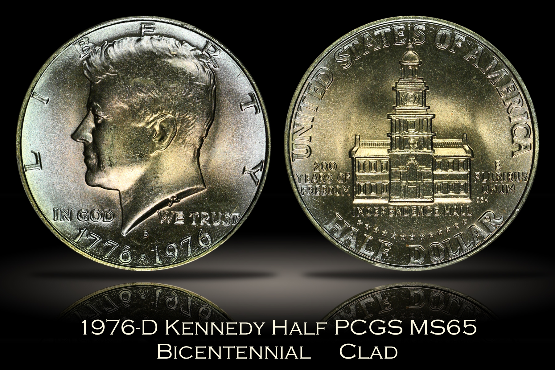 | Here is a 1976-D Kennedy Half Dollar with the Bicentennial Reverse which has been graded MS65 by PCGS and is encapsulated in one of their newer-style edge-view holders. This dual-dated 1776-1976 half dollar with the special bicentennial reverse of Independence Hall is a fairly common coin, even in gem condition. However, the eye appeal of this particular example is exceptional. The coin has amazingly beautiful purple and golden toning on both sides which is not totally captured by the photos. There are a few light hits on Kennedy’s cheek which limit the technical grade of the coin and keep it from grading higher, but in terms of overall eye appeal, this bicentennial half dollar would be difficult to beat. |