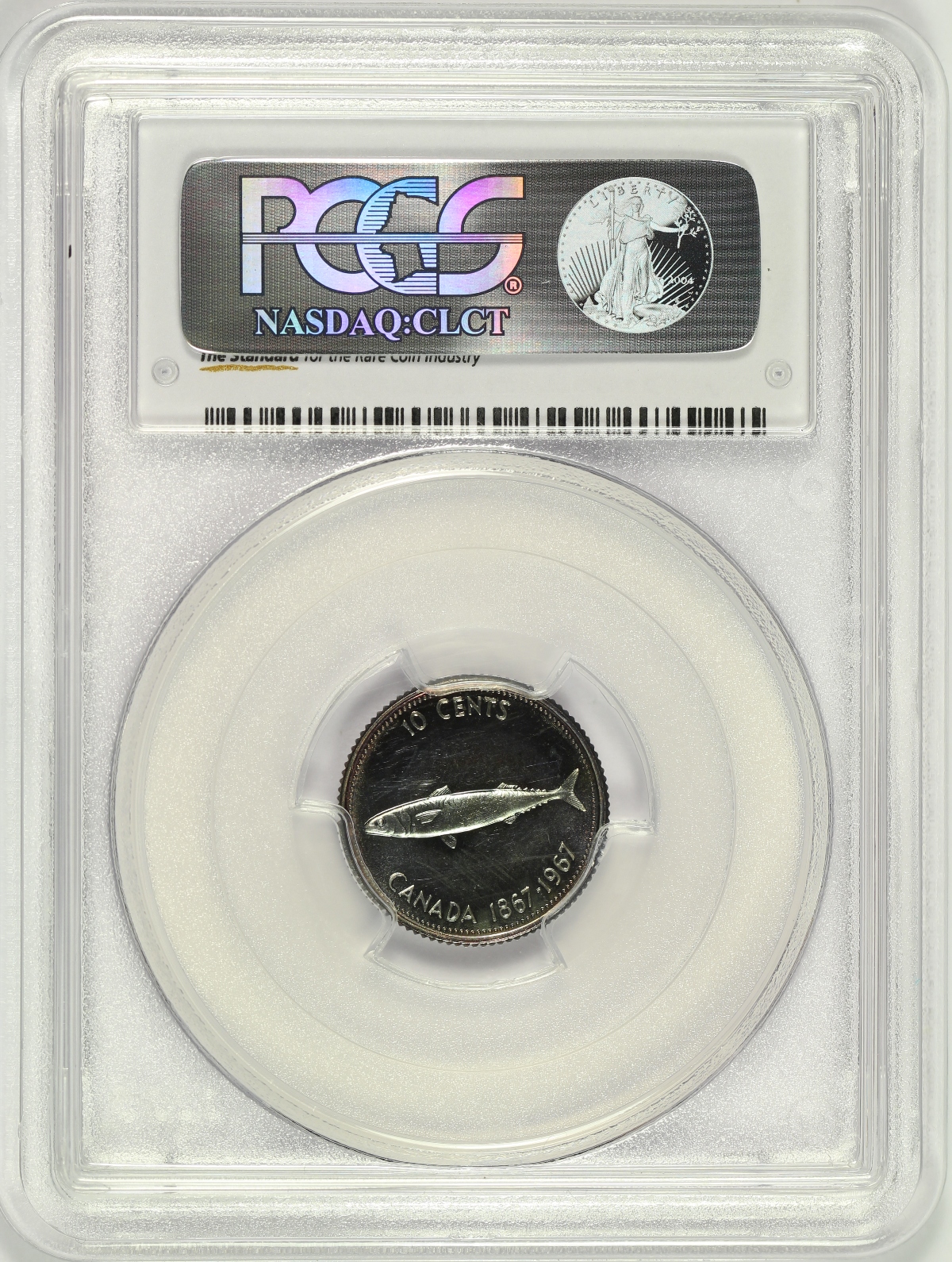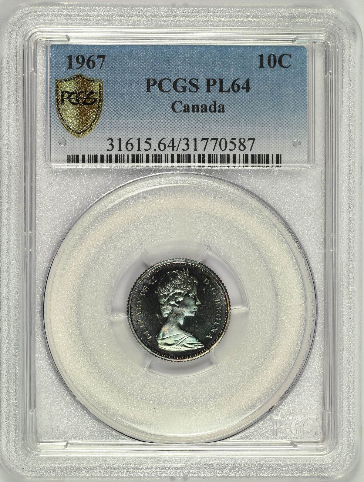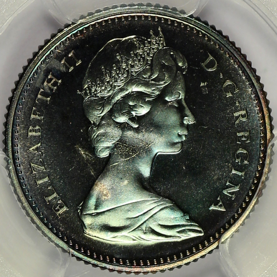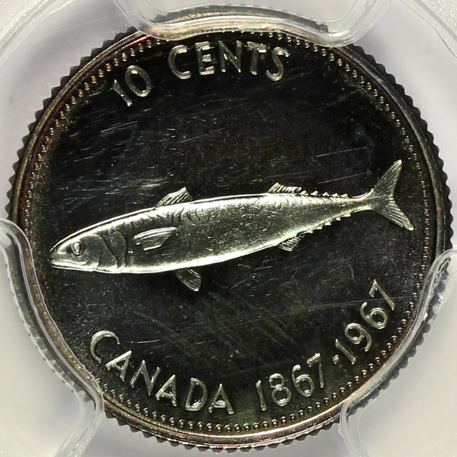 | This 1967 Canada 10 Cents has been graded PL64 by PCGS and is encapsulated in one of the newer-style edge-view holders. Deeply toned on each side with purple and blue colors. Unfortunately, was not able to capture the full look of this piece in the photos. A few small marks on each side kept the coin from grading higher. |