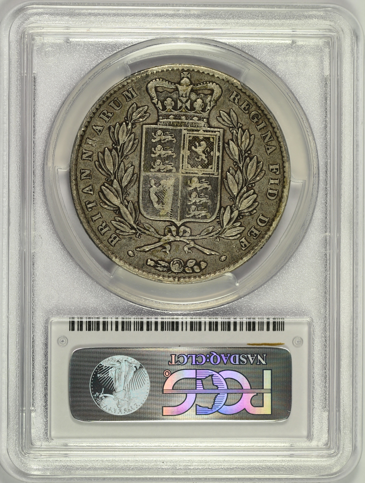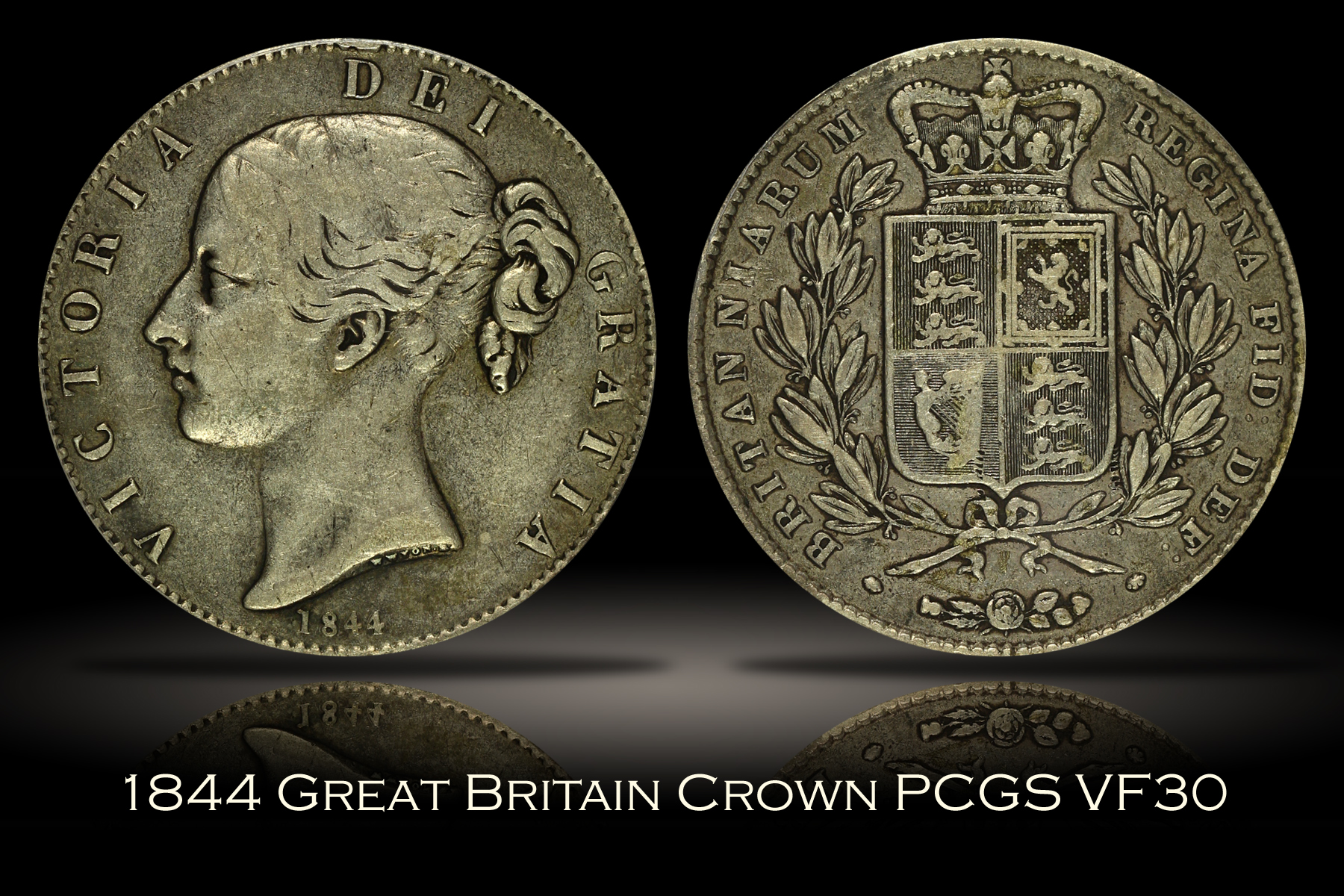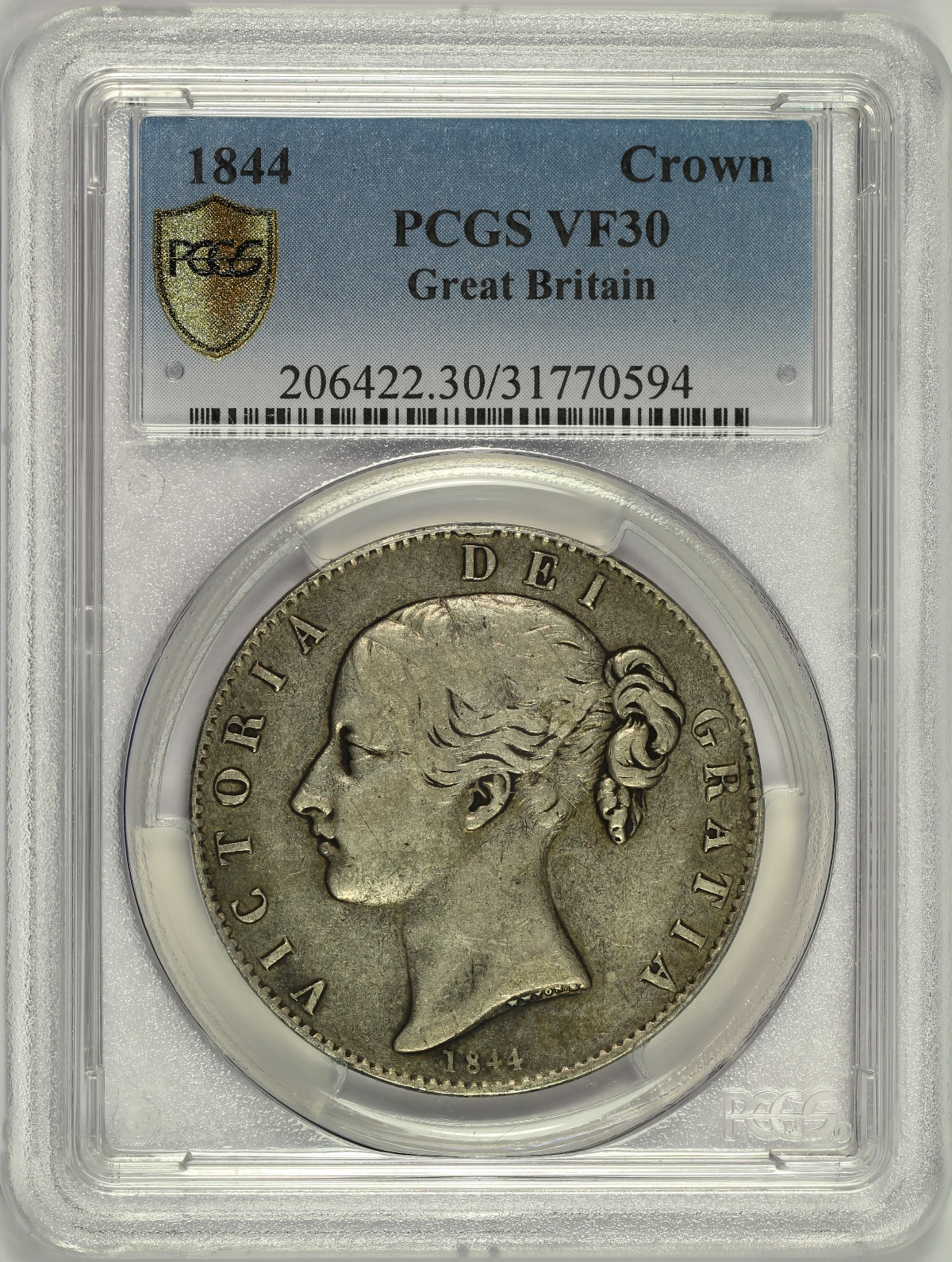 | This 1844 Great Britain Queen Victoria Silver Crown has been graded VF30 by PCGS and is encapsulated in one of their newer-style edge-view holders. The piece shows moderate, but very even, circulation wear which results in an attractive overall look. The color of the piece is also quite attractive with somewhat darker grey fields and somewhat lighter devices. Some minor handling marks can be found under a close inspection, but there is nothing major or distracting of note. The 1844 Crown is the first regular issue crown featuring the young Queen Victoria and with a mintage of only 94,000 pieces, it is an issue that is in high demand in all grades. |