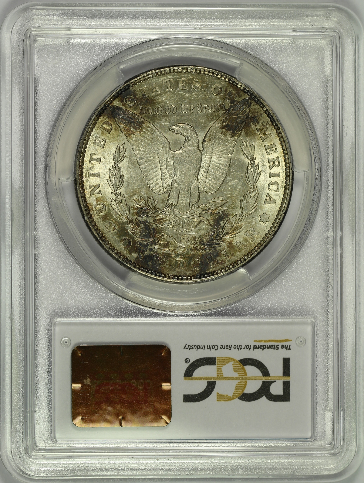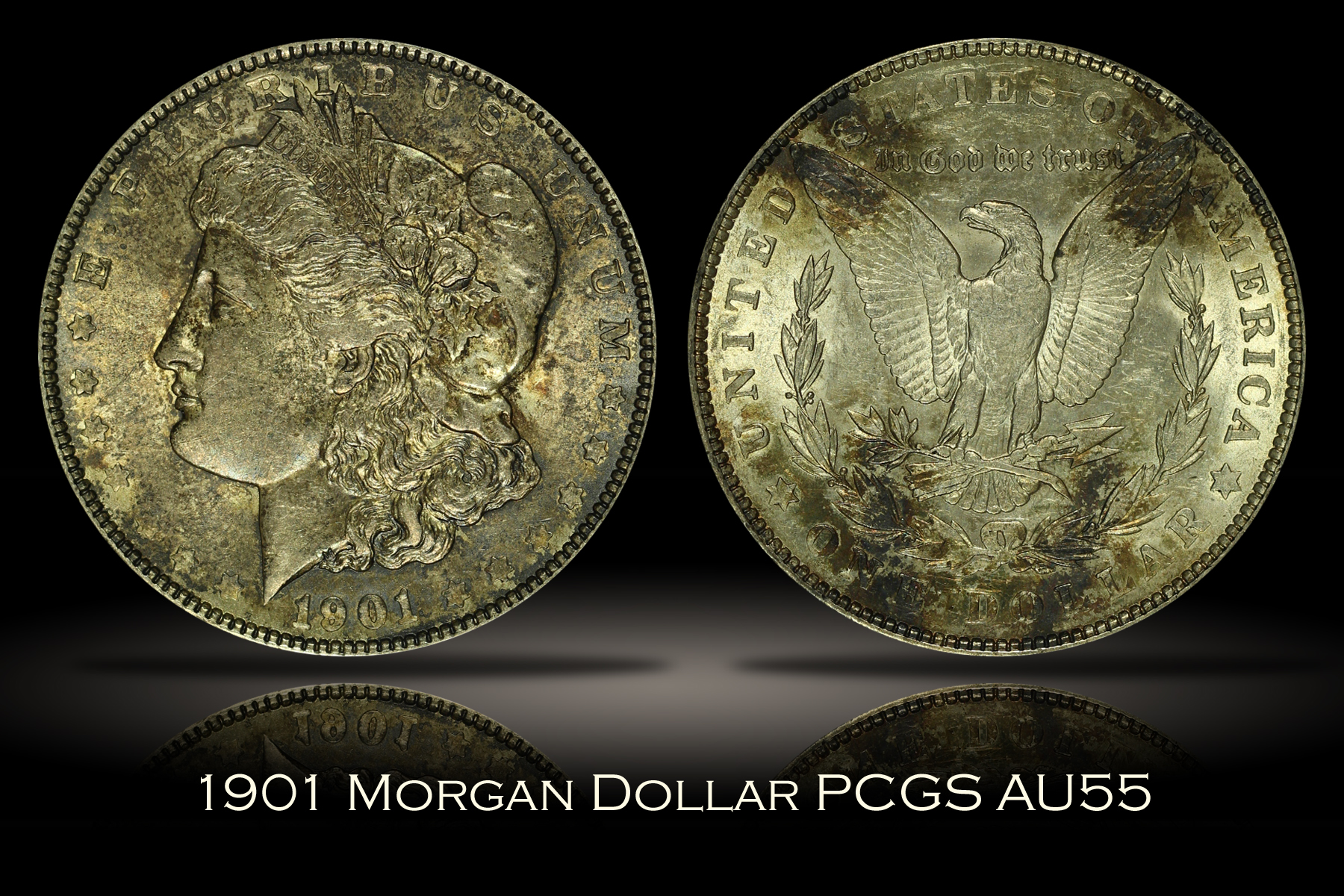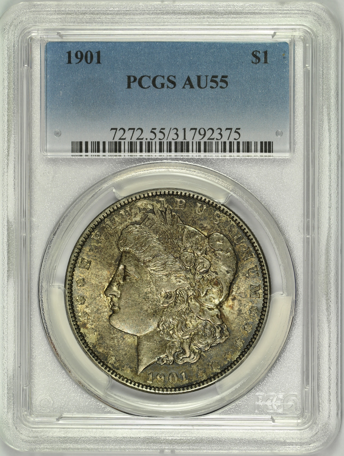 | This 1901 Morgan Silver Dollar has been graded AU55 by PCGS and is encapsulated in one of their newer-style edge-view holders. This lightly circulated better date silver dollar has medium to dark golden brown toning that completely covers the obverse. Despite the thick toning, the coin is quite flashy and the luster is strong. Evidence of light circulation is present and some small hits and marks can also be found on the high points of the design, although they are somewhat hidden by the toning. The reverse is less toned, but with similar medium-dark golden brown colors, though trace amounts of brighter more vibrant colors are present upon close inspection near the denomination at the lower reverse although they do not show in the somewhat dark photos. A very original looking lightly circulated better date Morgan Dollar. |