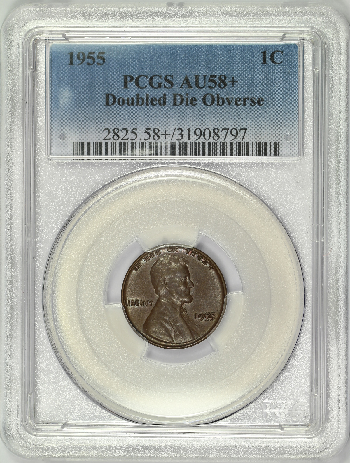 | The 1955 Doubled Die Obverse Lincoln Cent is one of the most popular varieties in all of numismatics with amazing spread between all of the lettering on the obverse. This example of the 1955 Doubled Die Obverse Lincoln Cent has been graded AU58+ by PCGS and is encapsulated in one of their newer edge-view holders. To date, only a few examples of the 1955 DDO cent have been graded with the plus grade in AU58. As you would expect with a coin given that plus designation, this coin is very nice for the grade and looks like a higher-grade mint state coin at first look. However, under a very close inspection, the coin appears to maybe have just the slightest touch of wear on the highest points, limiting the technical grade of the coin to AU58+ despite the coin having the appearance of a coin a few points higher. This coin has an even chocolate brown color and nice original mint luster on both sides. The coin has no major issues or distractions of note except for a few tiny marks scattered about, nothing you would not expect on a coin of this grade. Please note there is a scratch in the plastic holder which shows on the reverse photo, but the coin is not affected. An impressive example of this popular king of all of the doubled dies.