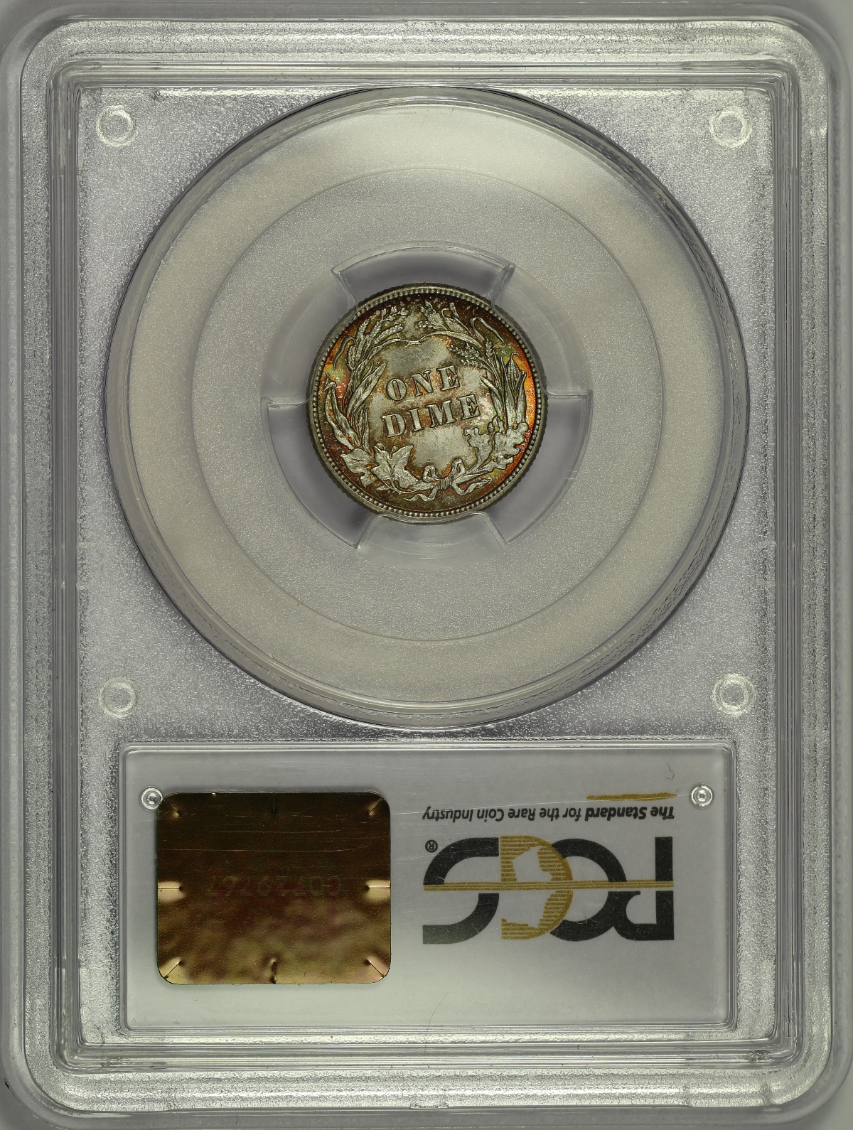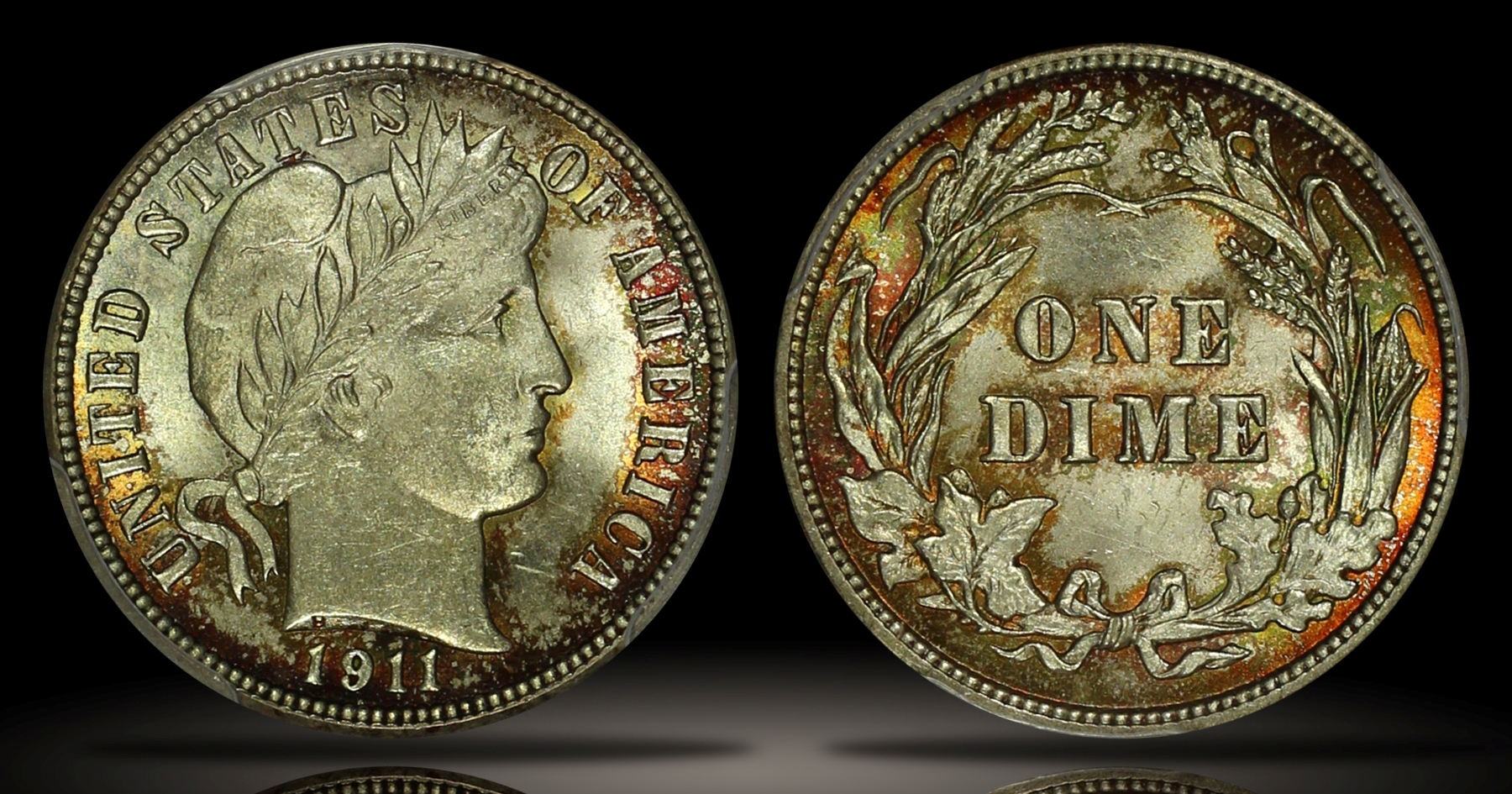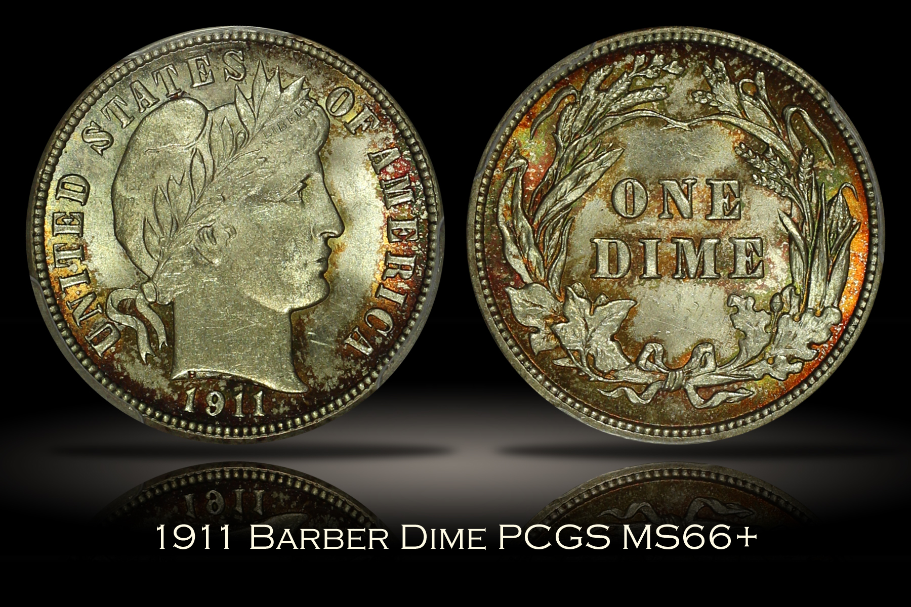 Here is a 1911 Barber Dime which has been graded MS66+ by PCGS and is encapsulated in a newer-style edge-view holder. This high-grade dime is very well struck and quite lustrous. The coin has light toning on the obverse which is mostly concentrated around the rim with vibrant yellow and red colors. The toning on the reverse is stronger with similar fiery yellow and red colors but with also some hints of green color present. A couple of tiny marks can be found under magnification, but none are significant. The coin is certainly deserving of the high plus grade awarded by PCGS. A beautiful high-grade and attractive example of the type. |