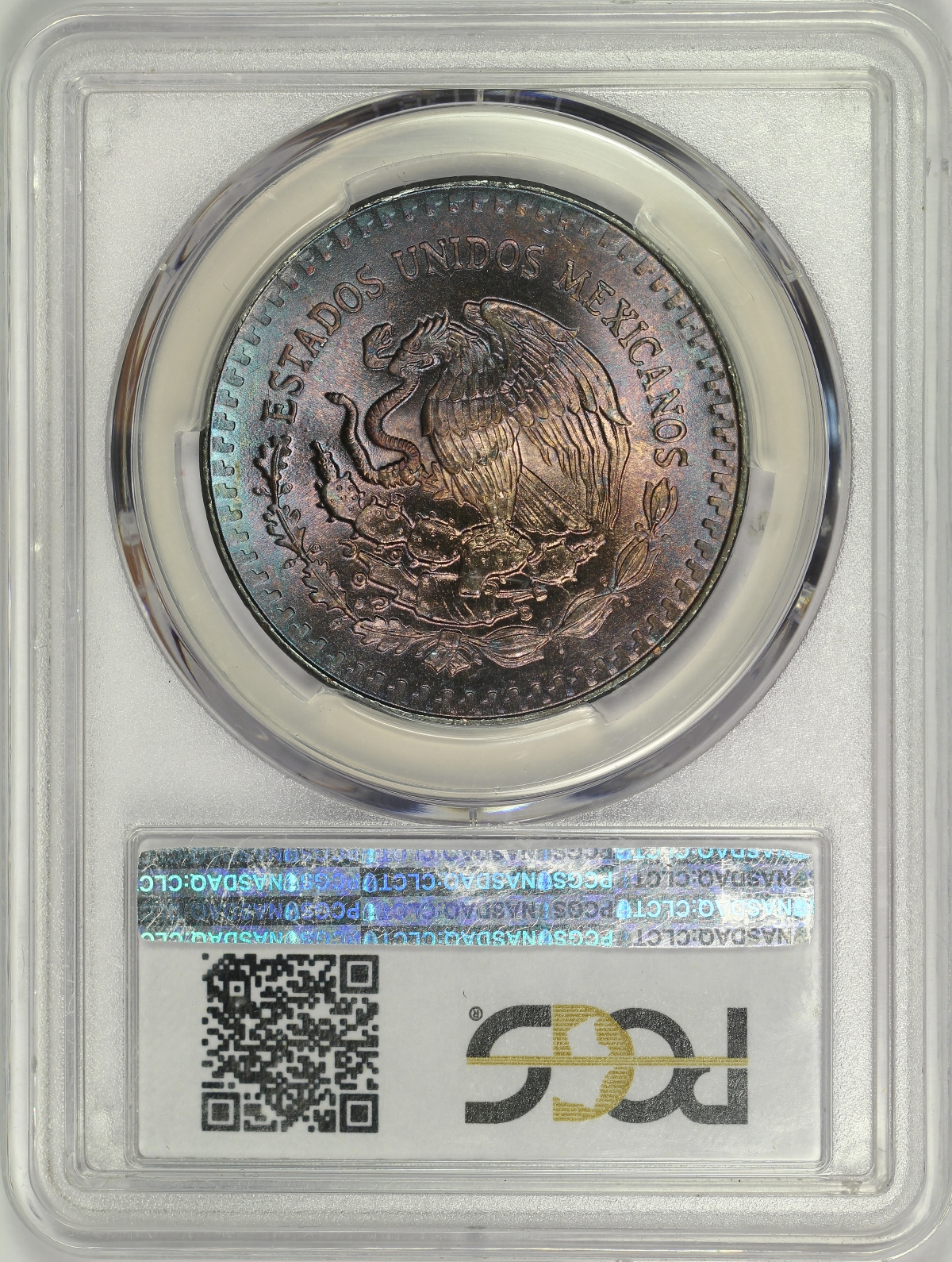 | This 1985-Mo Mexico Silver Onza has been graded MS66 by PCGS and is encapsulated in the newer-style edge-view holder. This is a beautiful example of the type with deep blue and purple toning on both sides with just a touch of pink and orange color towards the center of the coin. The coin also has excellent mint luster which further adds to the extraordinary eye appeal. A few light marks are present on each side, but they are difficult to locate given the impressive toning. A beautiful Mexican Silver Onza. |