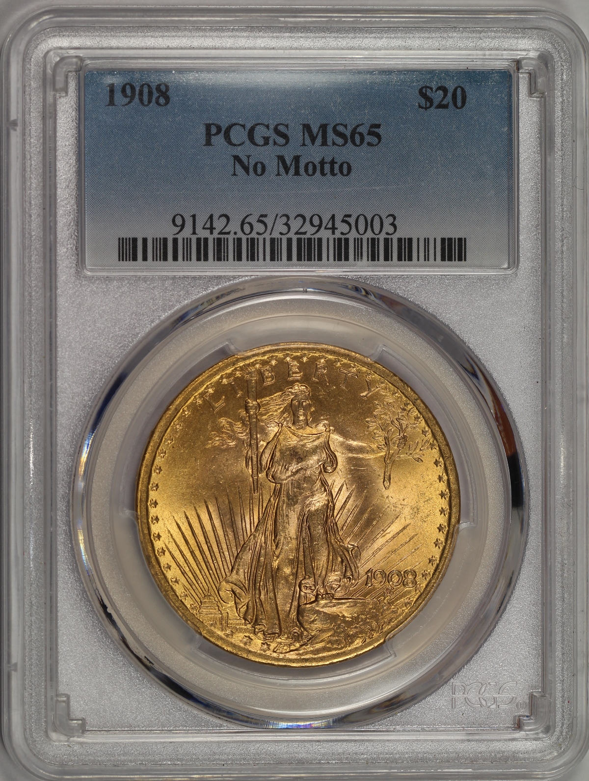 1908 $20 No Motto St. Gaudens Gold PCGS MS65 |