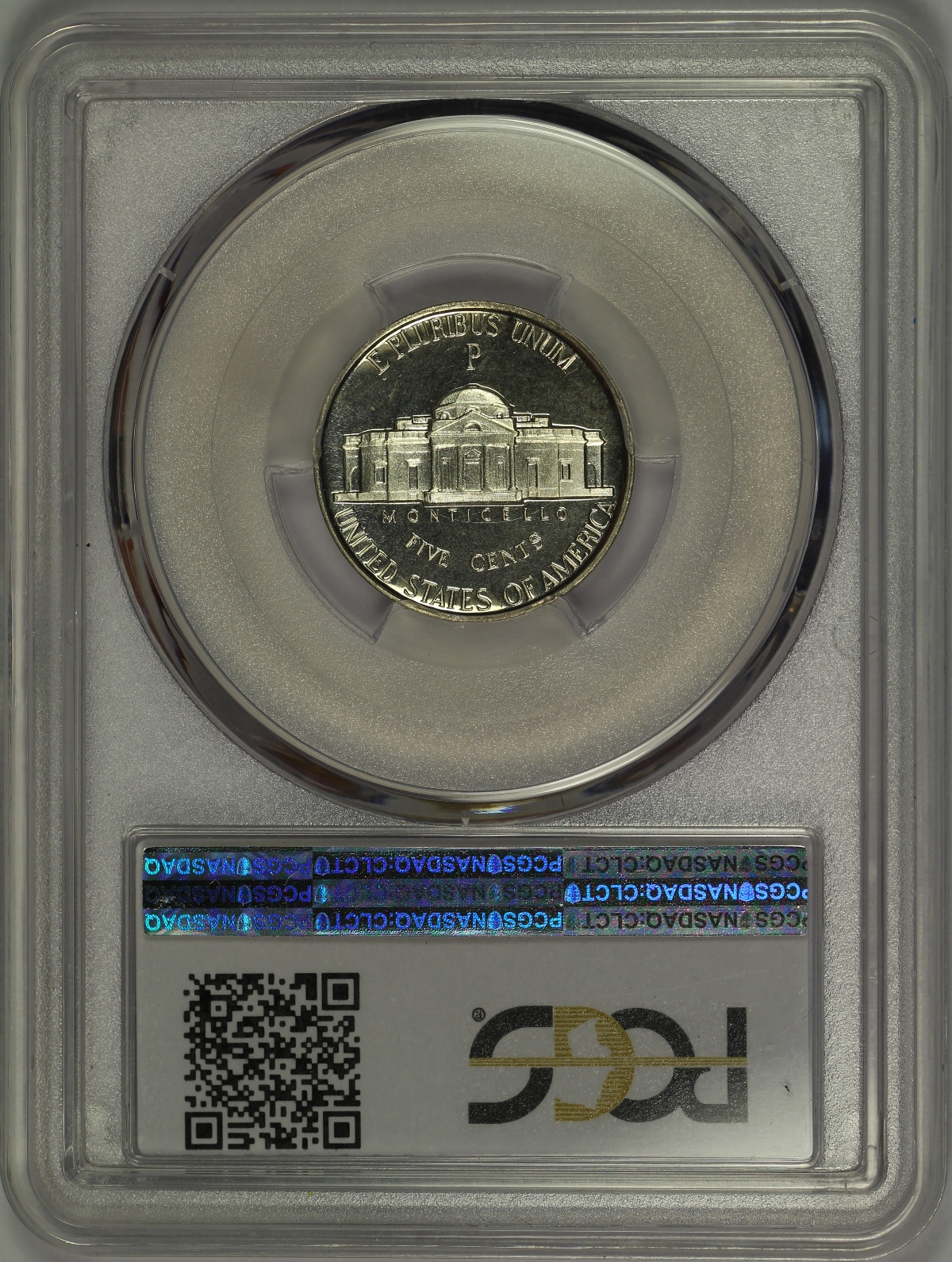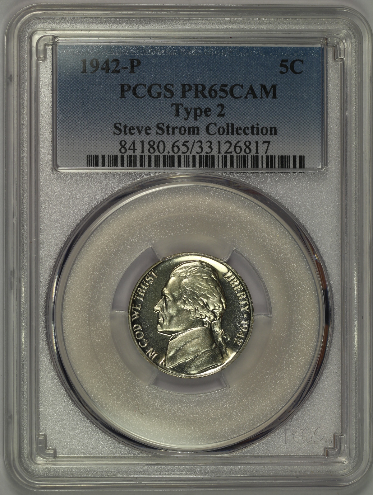 | In 1942, two types of proof Jefferson Nickels were minted. The first type was the traditional 75% copper-25% nickel alloy used to make nickels for many years. With the outbreak of World War II, nickel was a vital resource for the war effort so much so that the Mint changed the composition of the nickel to 56% copper-35% silver-9% manganese during 1942 and the so-called silver "war nickel" was born. 1942 was the only time that War Nickels were available in proof finish and not very many were made. Only 27,600 Type 2 proof nickels were minted in 1942 with the wartime silver alloy. This example of the 1942-P Proof Jefferson War Nickel has been graded PR65CAM by PCGS and is encapsulated in one of the newer-style edge-view holders. The coin was also professionally imaged by PCGS for their CoinFacts service. Despite the low mintage, high grade proof war nickels are not rare as many were saved and proofs of any type rarely circulate. However, finding an example in any grade with strong cameo contrast is extremely difficult. To date, over 5000 proof war nickels have been graded by PCGS; of those, only thirteen (13) examples have received the cameo designation, including the coin offered here. The coin has wonderful overall eye appeal and is free of toning. The coin has just a few light marks, but nothing significant or distracting and the coin appears to be quite strong for the assigned grade. An amazing example of the type with unusually strong cameo contrast.