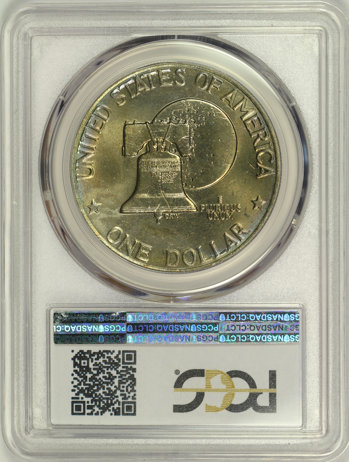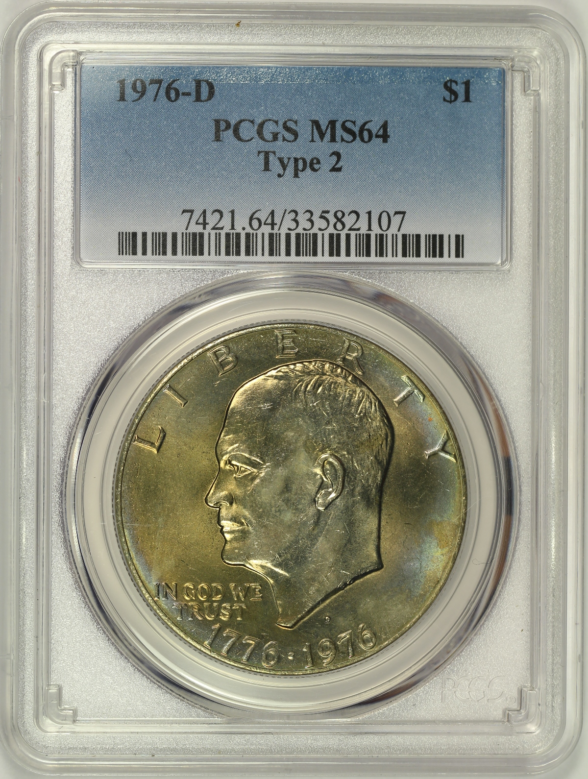 | There are two major varieties of the 1976 Bicentennial Eisenhower Dollars. Among other minor differences, the Type 1 variety has much thicker lettering on the reverse than the more common Type 2 variety. This 1976-D Type 2 Bicentennial Eisenhower Dollar has been graded MS64 by PCGS. Although this coin is the more common of the bicentennial dollar varieties, the colorful toning on this coin is not common. The toning is mostly a golden color but there is a more vibrant blue color that is concentrated around the rims on both sides. In hand, this piece is not quite as dark as the photos show; unfortunately the photos seem to hide some of the color of the coin. There are some light marks and hits on both sides of the coin as the relatively low mint state grade would suggest, but nothing too distracting, especially since the attractive toning is what draws your eye on this one. |