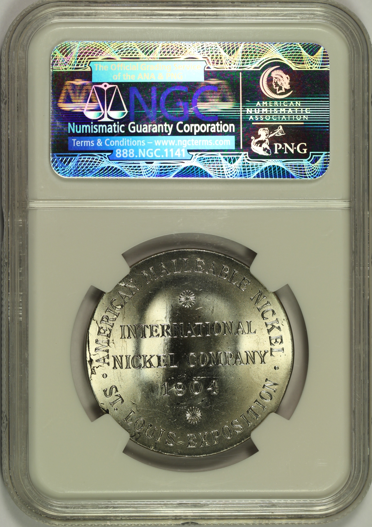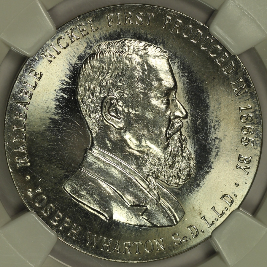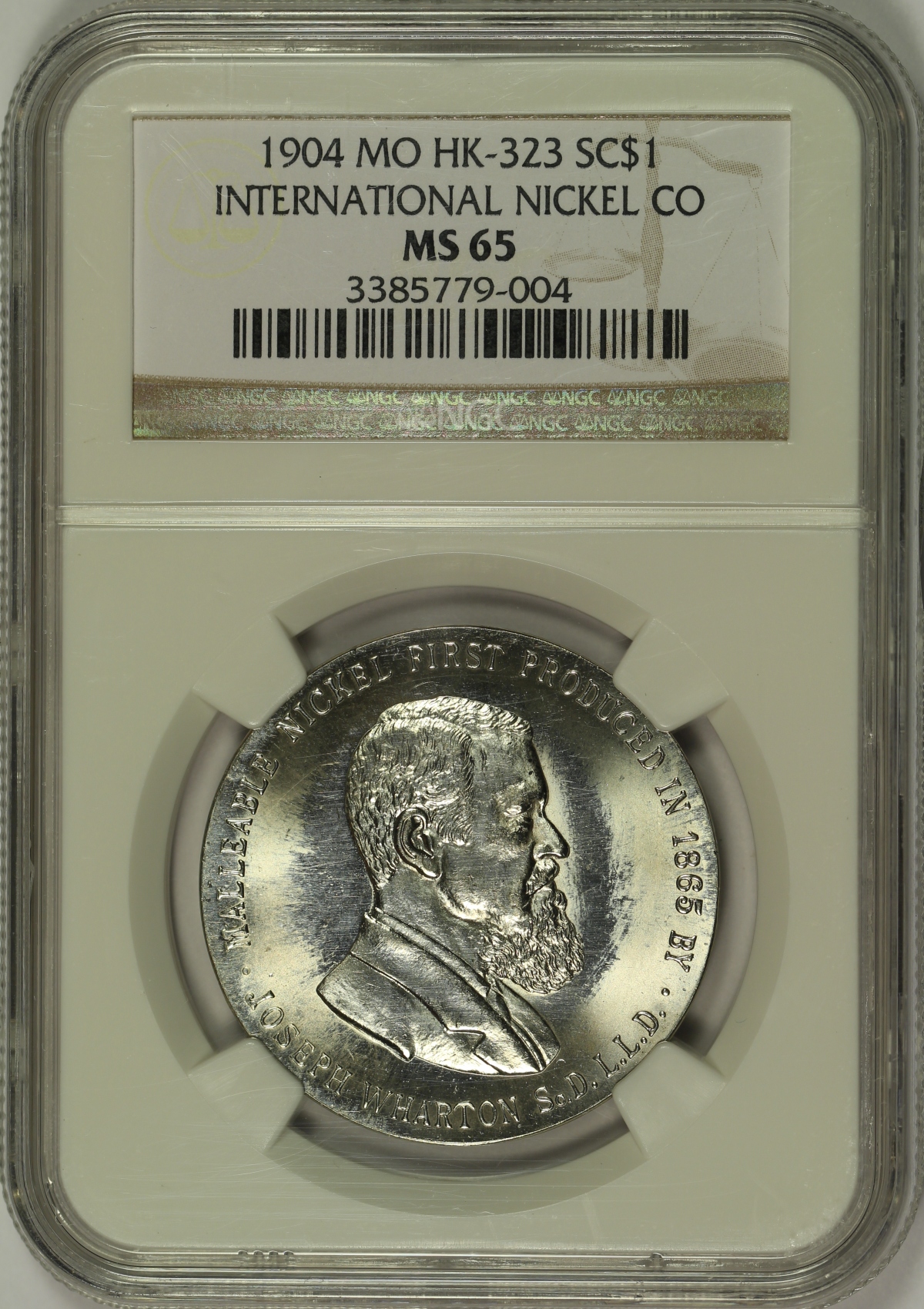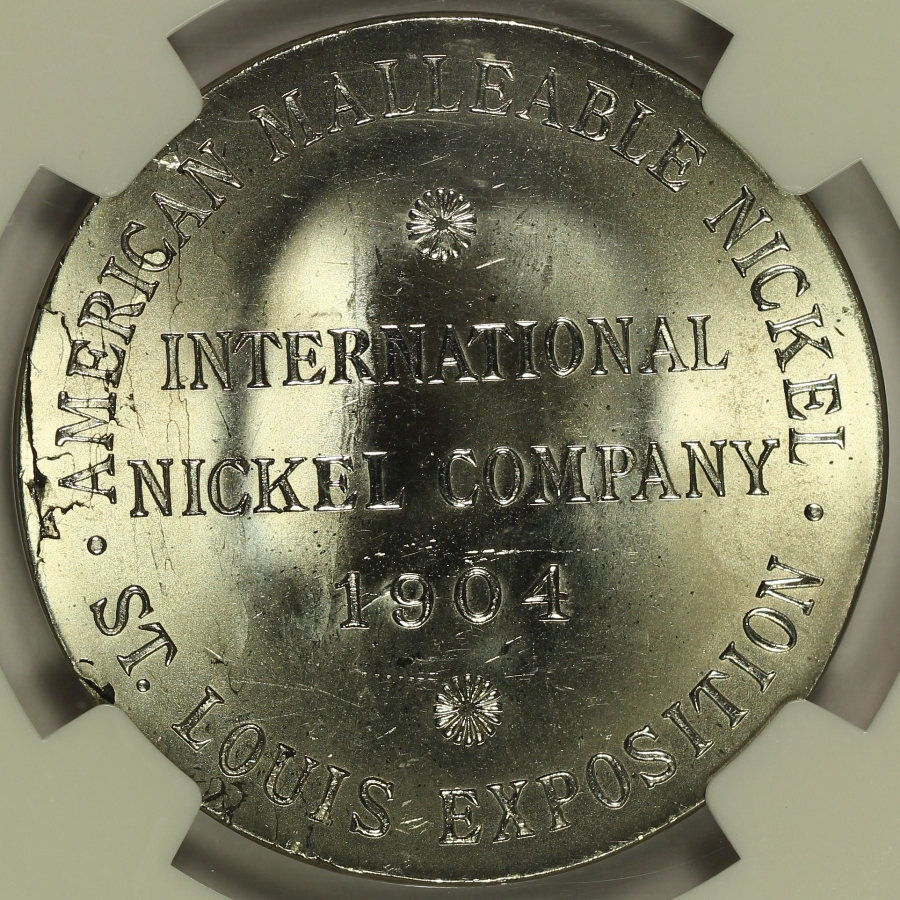 The 1904 Louisiana Purchase Exposition was a major World’s Fair that was held in St. Louis, Missouri. As part of the World’s Fair, the 1904 Summer Olympics were also held in St. Louis. Several medals were produced in connection with the 1904 World’s Fair. This is one of the so-called International Nickel Company Dollars from the Louisiana Purchase Exposition which is listed as HK-323 in the Hibler-Kappen book on So-Called Dollars and has been graded MS65 by NGC and is encapsulated in a newer-style edge-view holder. The obverse features a detailed portrait of Joseph Wharton who made a good amount of his fortune in the nickel business and was the first to produce malleable nickel. Wharton is more famous today as the founder of the Wharton School of Business in Pennsylvania. This piece is very bright and extremely lustrous. Portions of the fields are also somewhat proof like which adds further to the flashiness of the piece. The reverse is also interesting as it shows several small cracks, particularly near the left edge. This piece is one of only ten (10) examples of the HK-323 graded at the gem MS65 grade by NGC. Only two (2) examples of the HK-323 have been graded finer by NGC, both grading only a point higher at MS66. A wonderful high-grade flashy gem example of this so-called dollar from the 1904 St. Louis World’s Fair. |