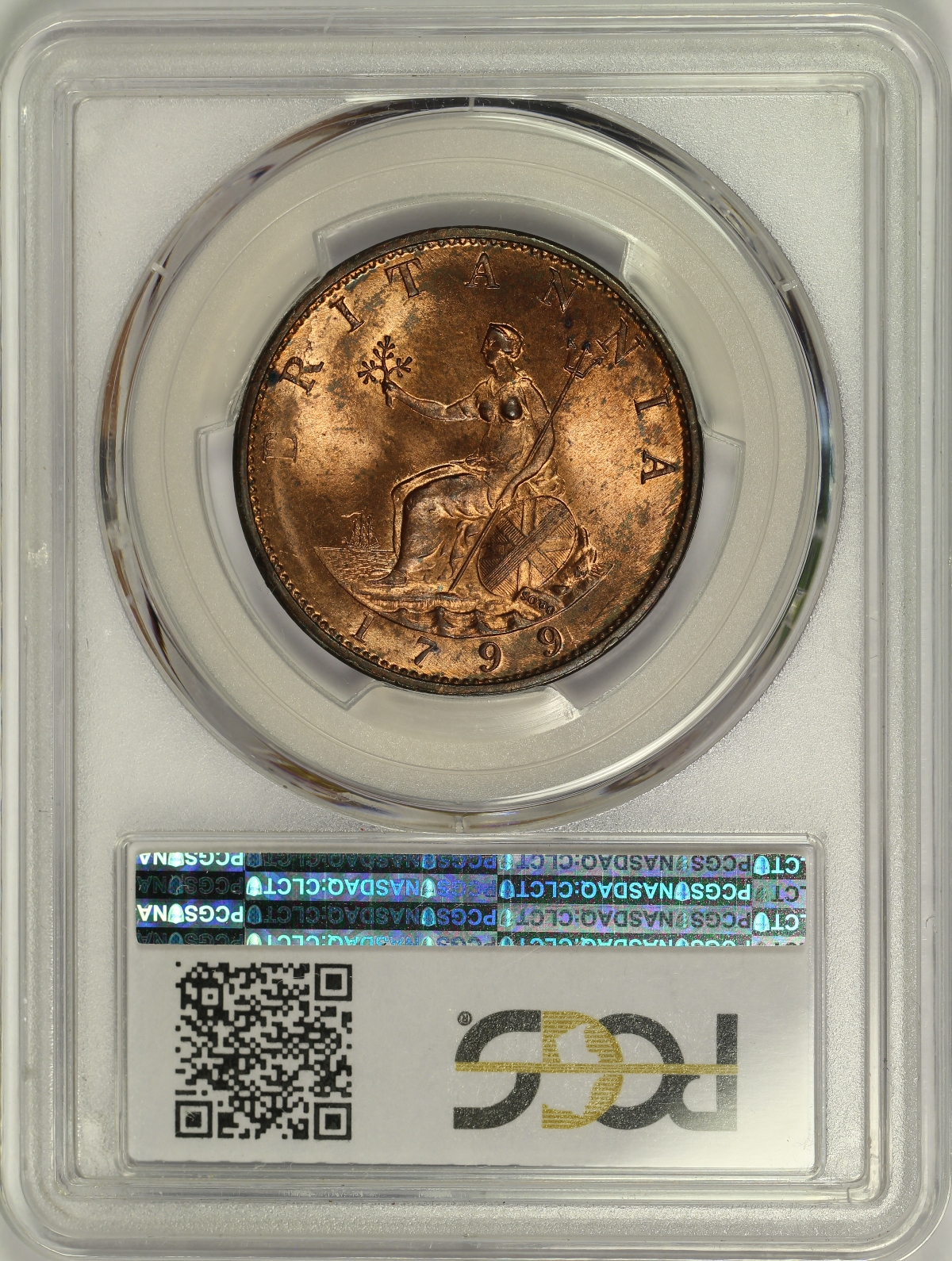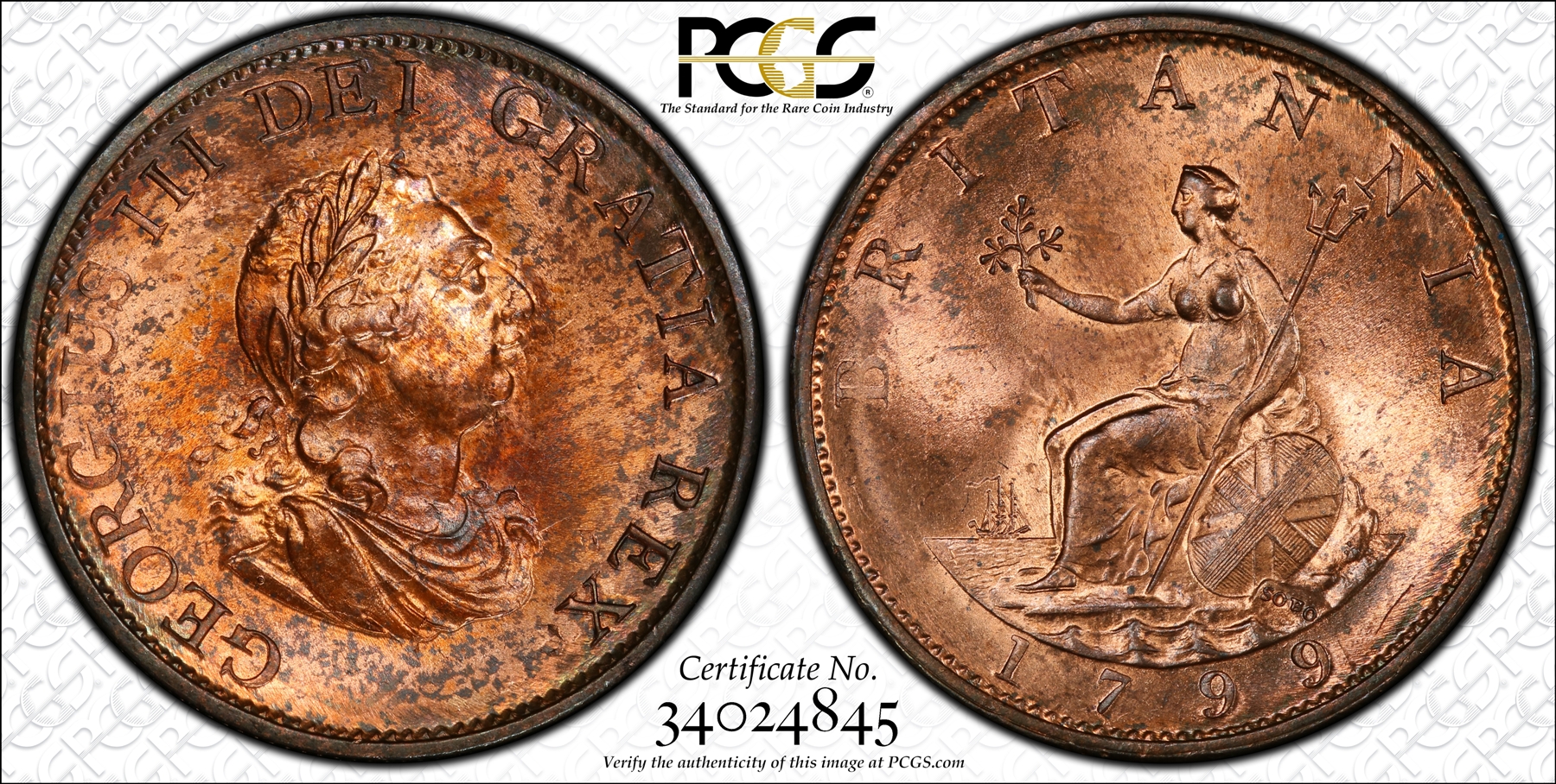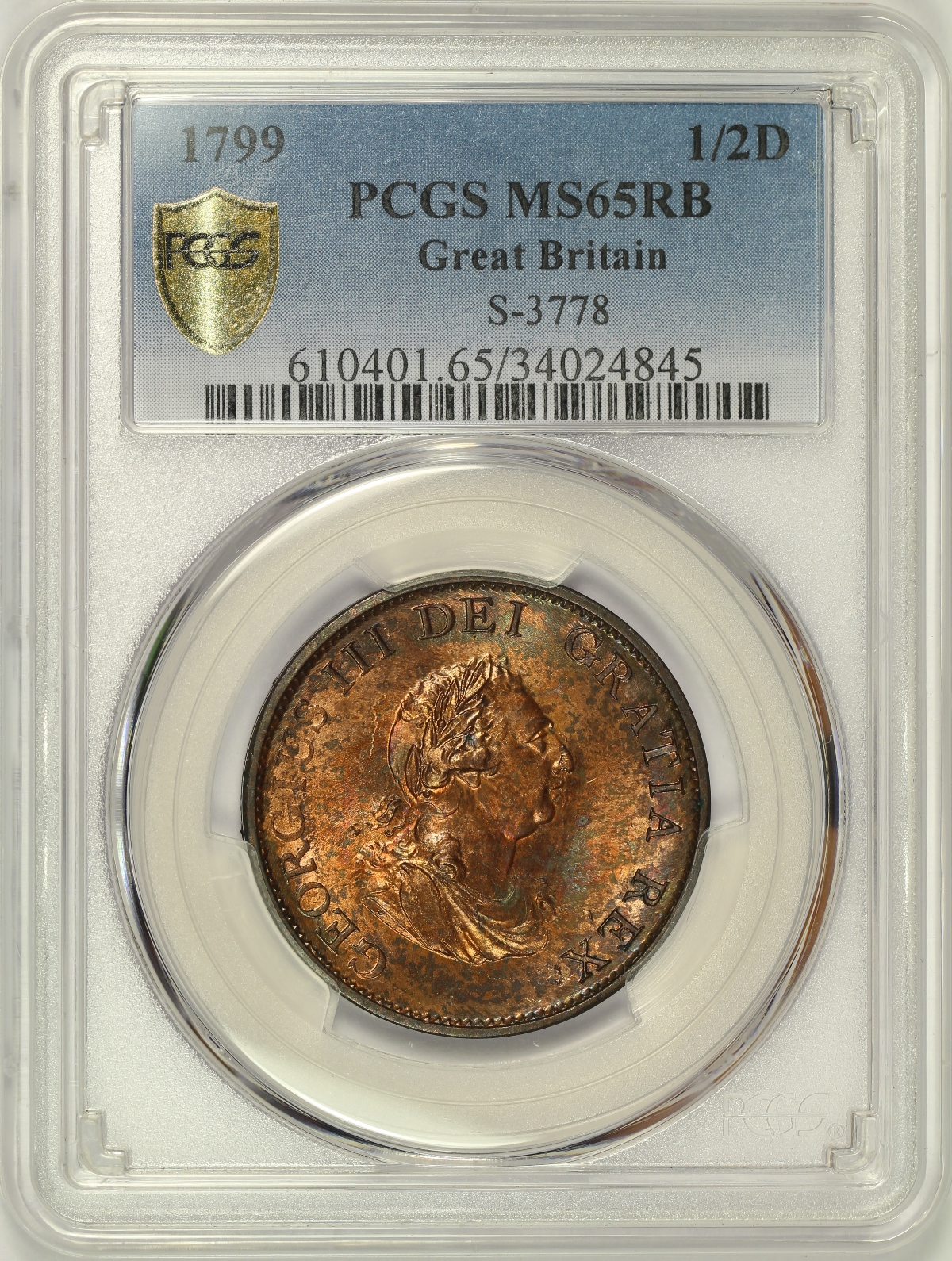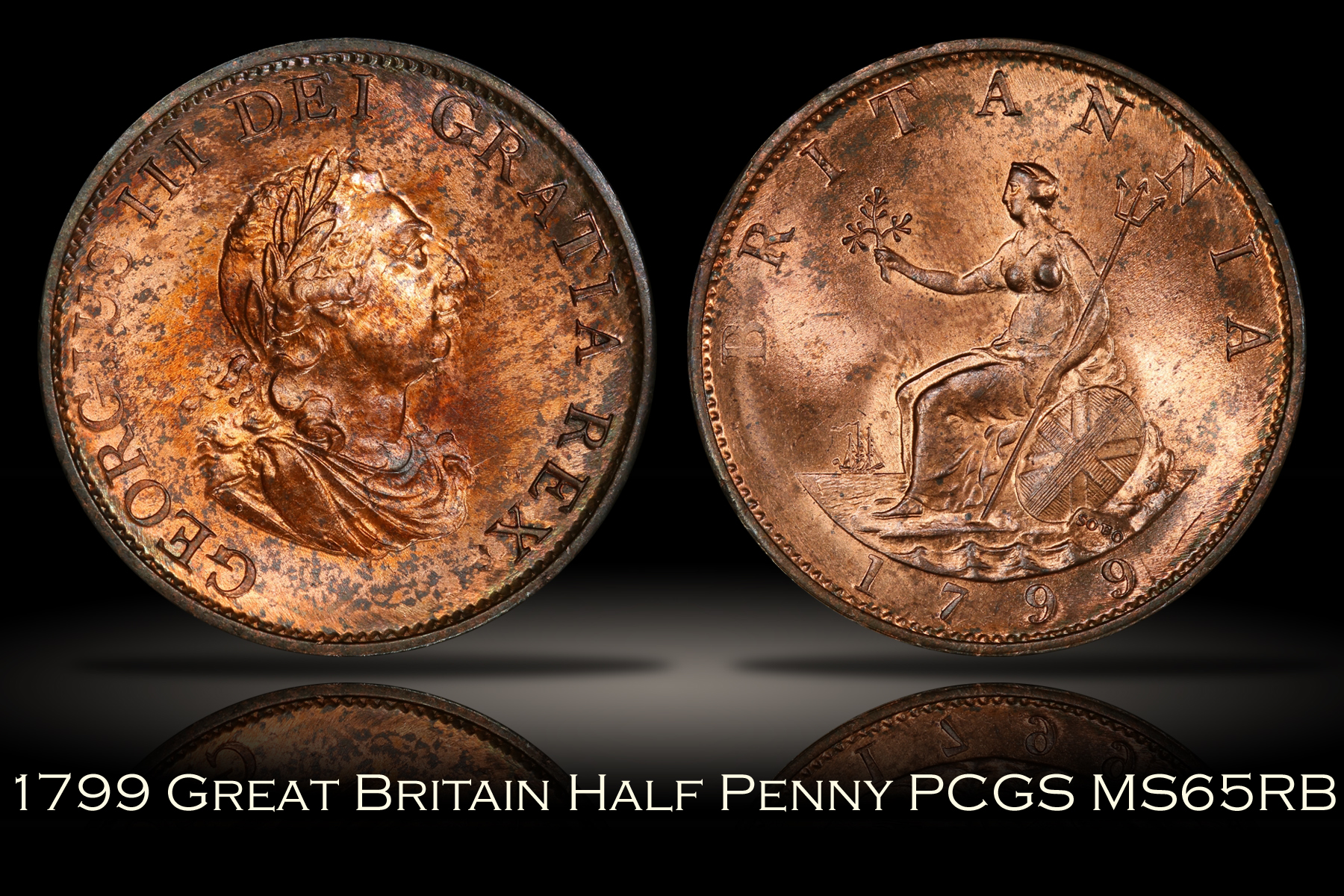 This 1799 Great Britain Half Penny has been graded MS65RB by PCGS and is encapsulated in the newer-style edge-view holder. A TrueView photo was taken by PCGS which captures the beauty of this coin in the best light. The coin has amazing overall eye appeal. The coin has strong cartwheel luster and tons of original red color. In addition, when in good light even more colors are revealed including green, blue and pink in the obverse toning. The obverse in particular, featuring George III, is very well struck and full of detail. No major spots, marks or other distractions of note. A wonderful example of the type. |
