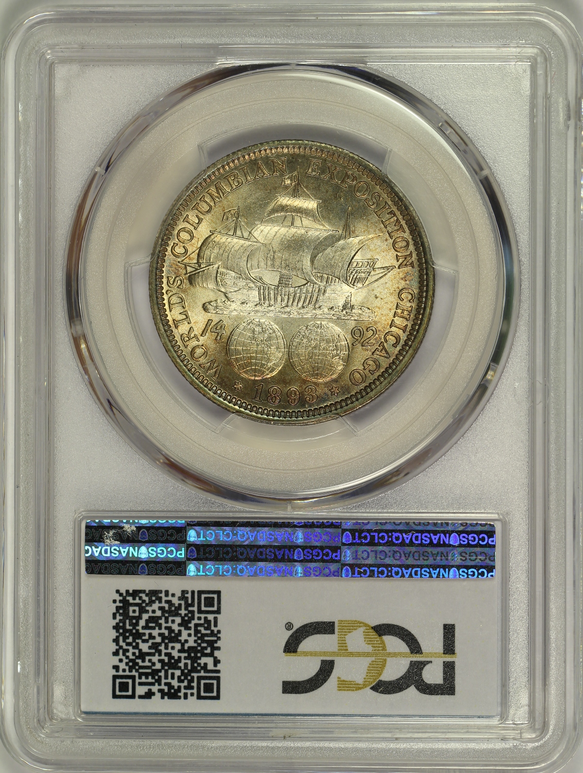 | The World's Columbian Exposition Commemorative Half Dollars are widely accepted as the first U.S. commemorative and the first in the widely collected classic commemorative series. However, some argue that the 1848 CAL. quarter eagles were really the first U.S. commemoratives. The Columbian Exposition Half Dollars were also the first United States coin of regular issue to depict an actual historical person, Christopher Columbus. The silver used to coin many of the Columbian Half Dollars came from the melting of then uncurrent coins which were pulled from circulation and held by the Treasury, many of which were half dimes last minted in 1873. The Columbian Half Dollars were minted for two years, 1892 and 1893. This example is an 1893 Columbian Half Dollar which has been graded MS66 by PCGS and is encapsulated in one of the newer-style edge-view holders. This coin has beautiful colorful toning which fully covers the obverse and is concentrated along the reverse rim. The luster is strong and there are just a couple of tiny marks that can be found after a very close look. An amazing example of the Columbian Half Dollar with strong eye appeal. |