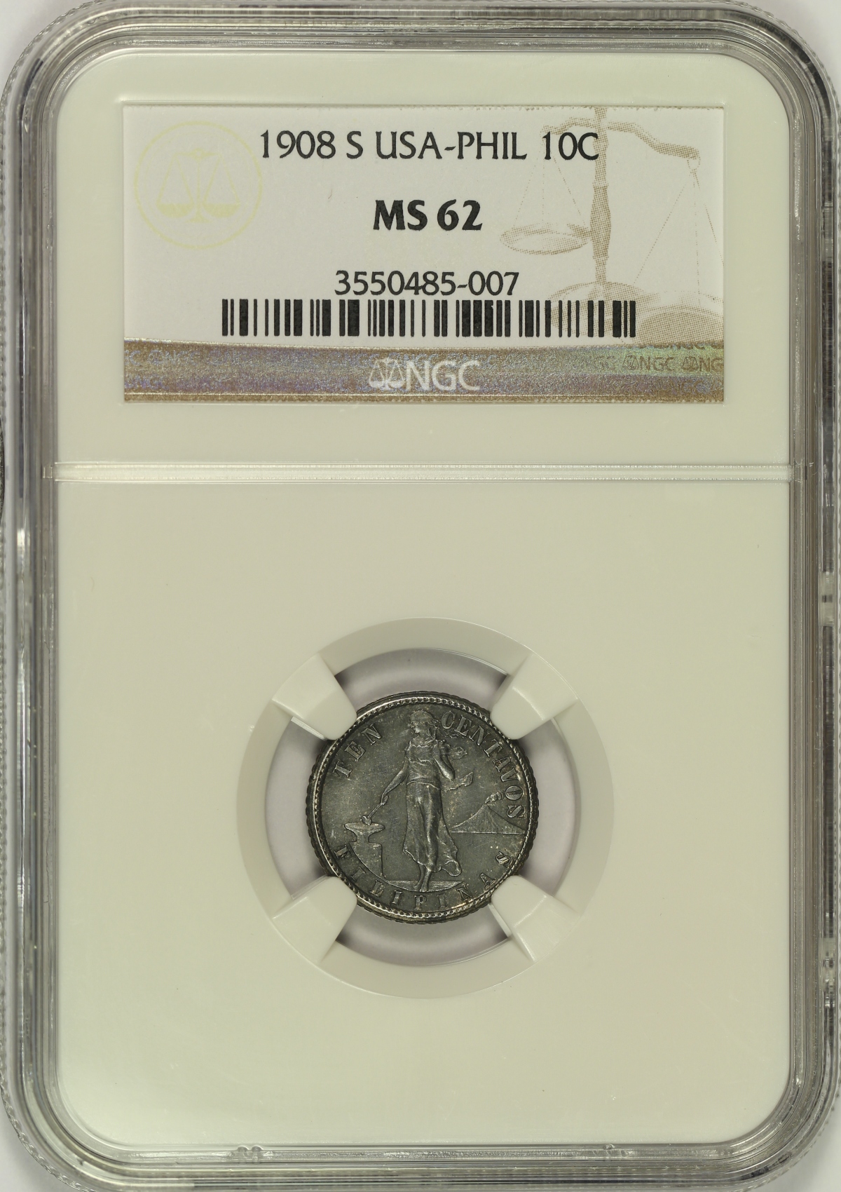 | 1908-S U.S.-Philippines 10 Centavos Inverted S Allen 8.04c NGC MS62 |