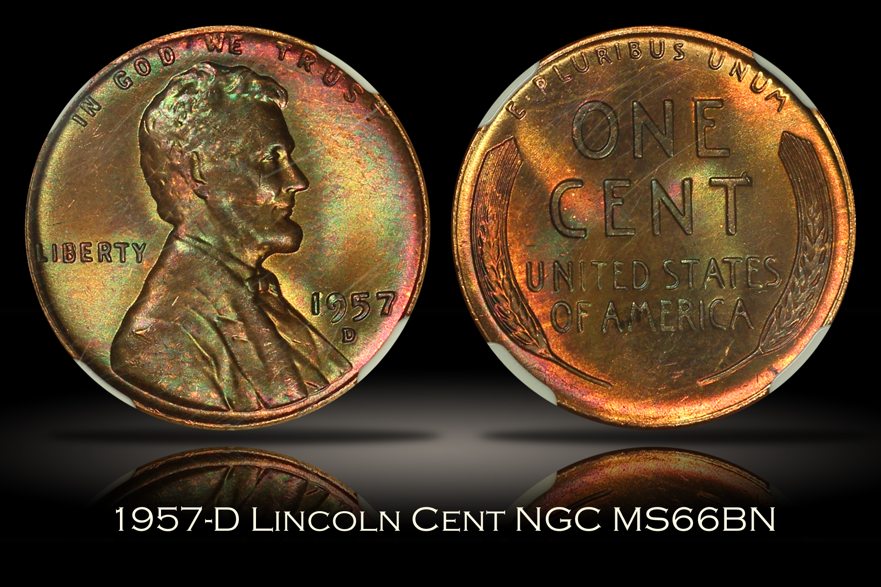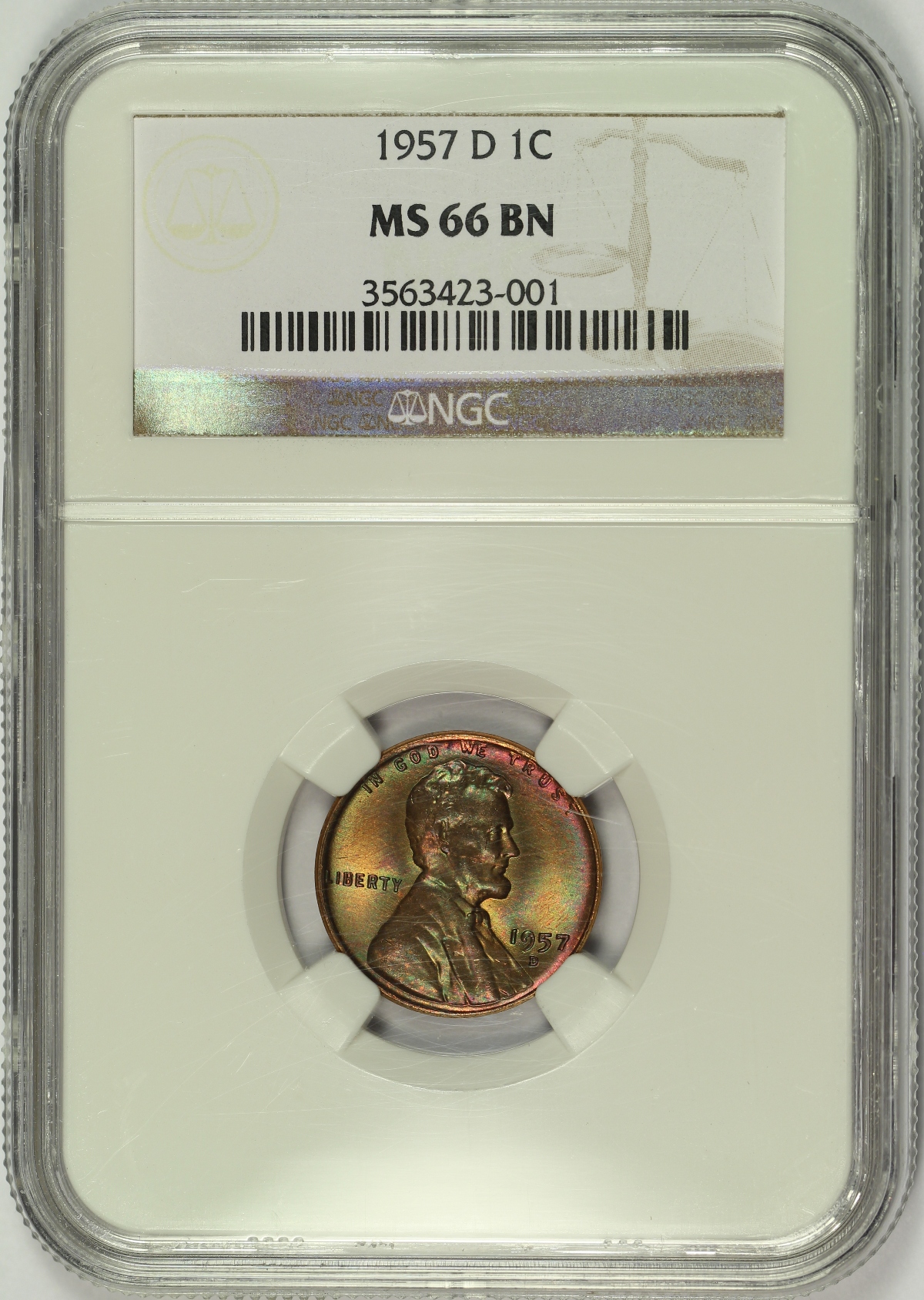 This 1957-D Lincoln Wheat Cent which has been graded MS66BN by NGC and is encapsulated in the newer-style edge-view holder. The coin has extraordinary original mint set rainbow toning on both sides and exhibits amazing overall eye appeal. Although the coin has been given a brown color designation, the coin has beautiful color on both sides. The 9 of the date also exhibits extra thickness which appears interesting. A few light marks and are noted under magnification, but are difficult to notice in hand as your eye is drawn to the color and luster of this beauty. A really pretty wheat cent.