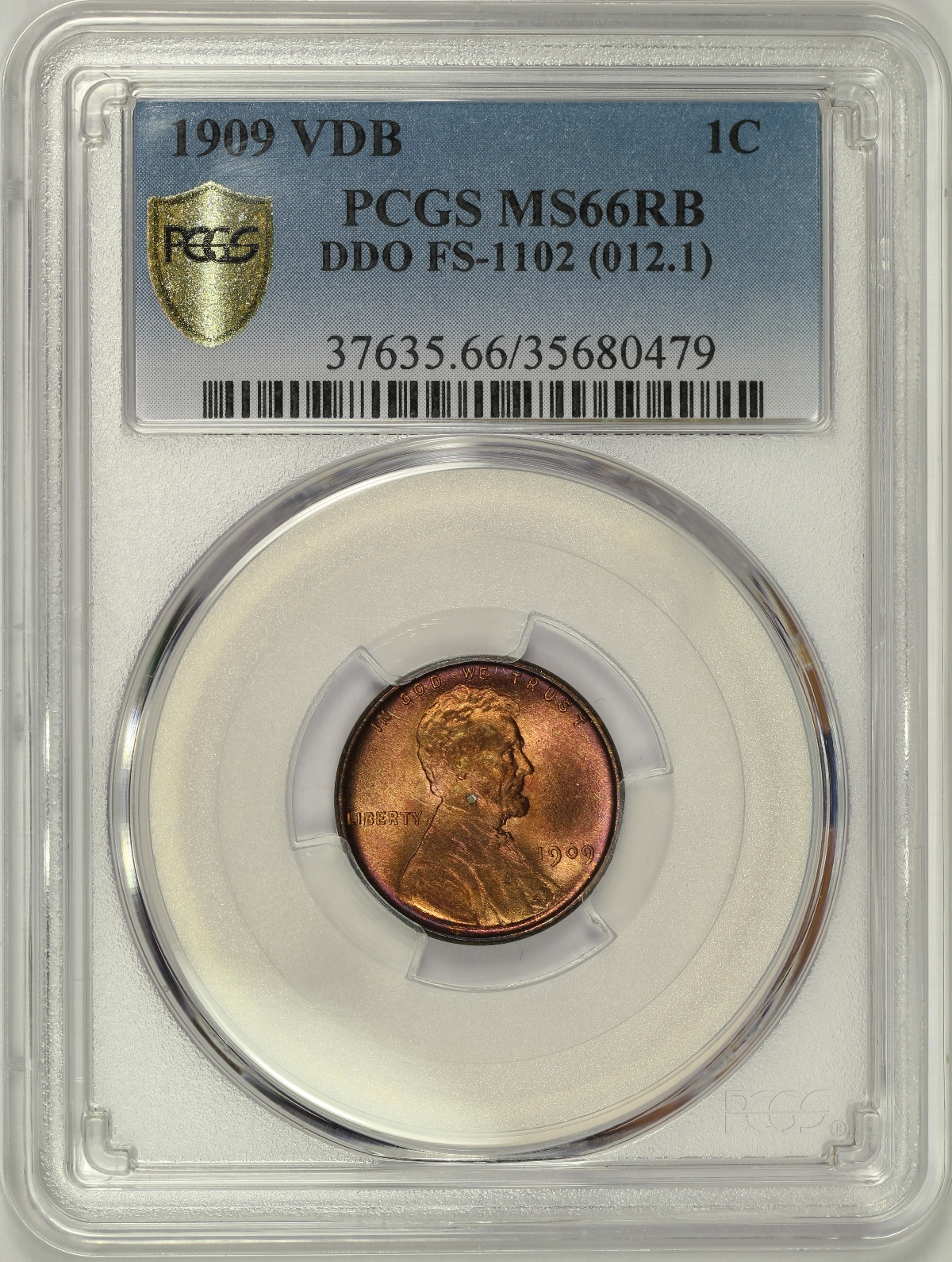 This example of the 1909 VDB Lincoln Cent Doubled Die Obverse FS-1102 (Die 2) has been graded MS66RB by PCGS and is encapsulated in one of the newer-style edge-view holders. A TrueView photo was taken by PCGS which captures the beauty of this coin in the best light. The FS-1102 DDO variety has been attributed by PCGS on the label as well. The coin has wonderful eye appeal with strong original luster and shows the doubled die obverse variety very well. The color is mostly red with some deepening of the color to a vibrant magenta along the rim. A small area of toning near the center of the obverse with green and aqua color is also present. Only a couple of minor marks are present on a very close look. Only two (2) examples of this variety have been certified at the MS66RB grade by PCGS with only a single MS67RB coin grading higher in this color designation. A beautiful high grade colorfully toned example of this popular first-year Lincoln Cent variety.