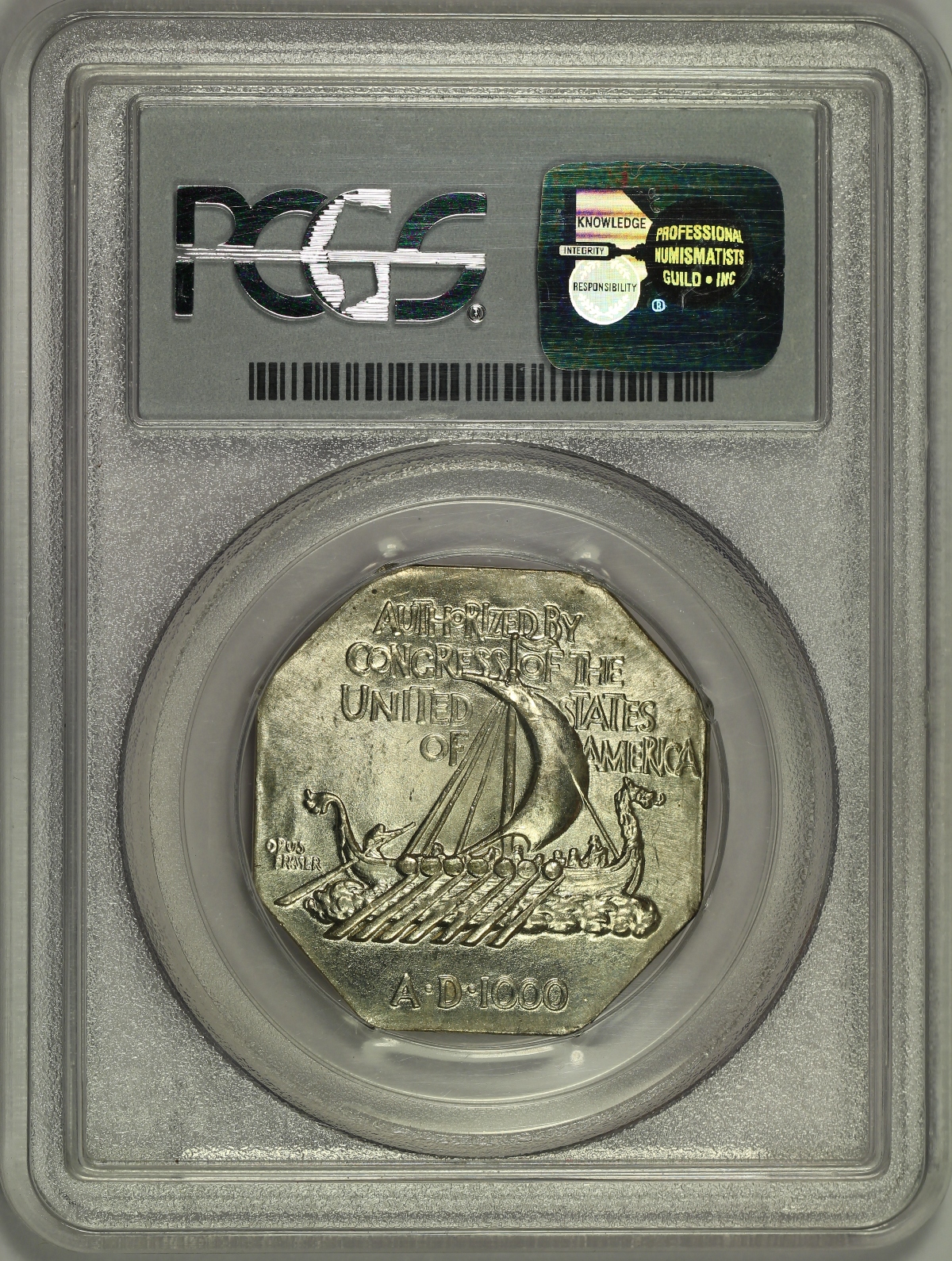collectors because of their eye-catching octagonal design. This example of the 1925 Norse Medal has been graded MS65 by PCGS and has been struck on a thick silver planchet. It is a bright white example free of toning with lots of original luster. A few scattered tiny marks can be found and a small light scratch near the right obverse edge is of note. An overall nice gem example of the Norse Medal. |