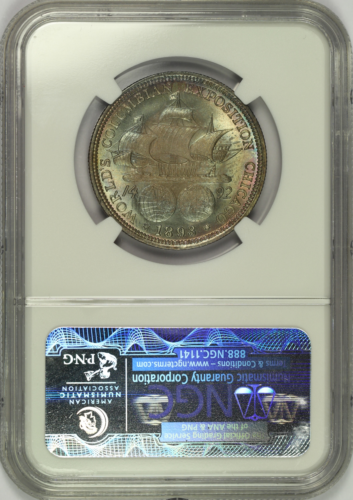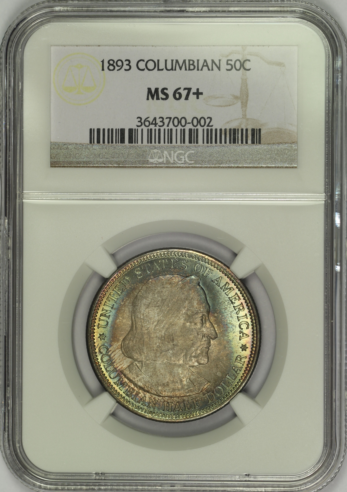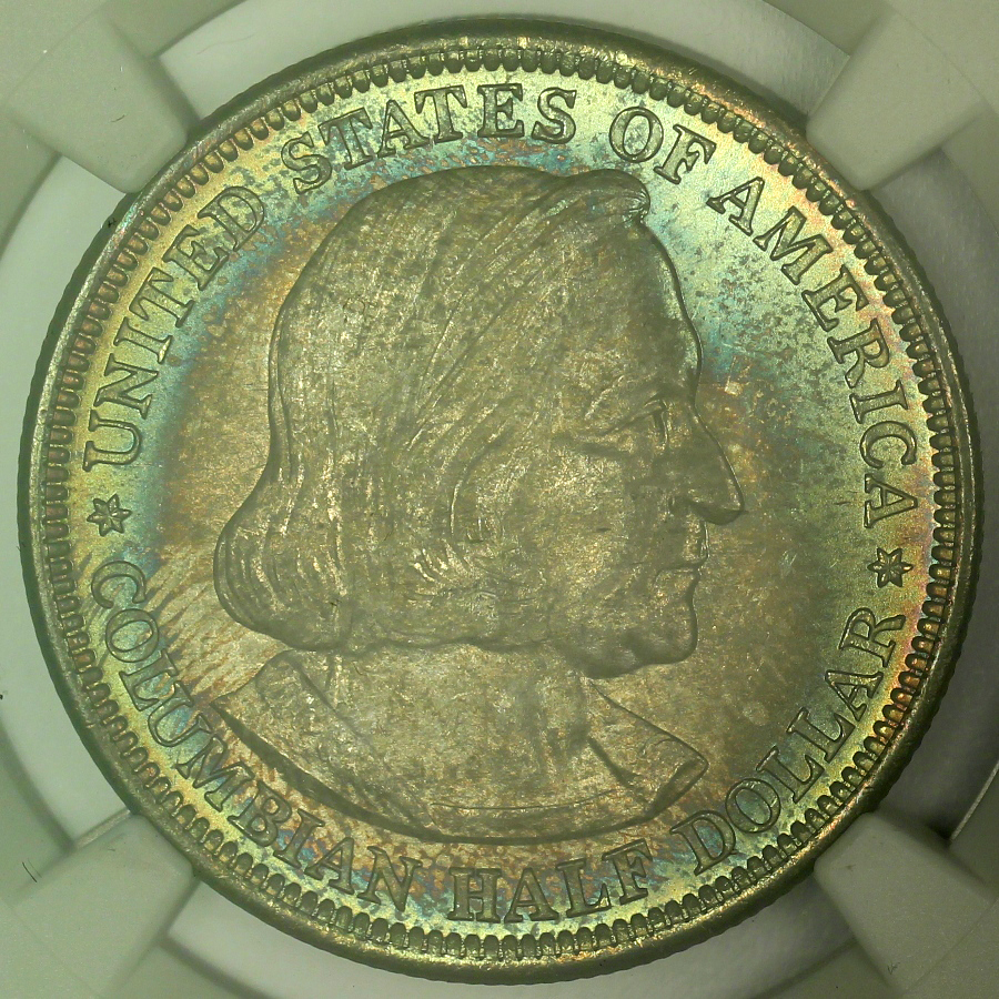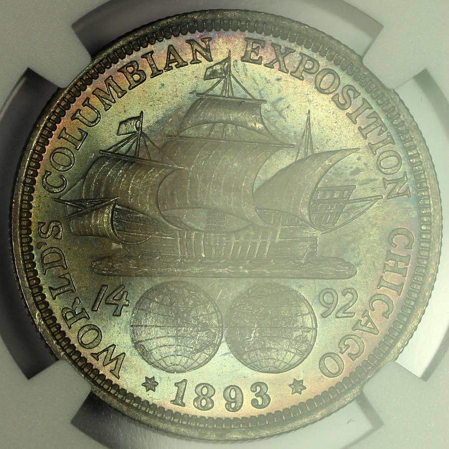 | The World's Columbian Exposition Commemorative Half Dollars are widely accepted as the first U.S. commemorative and the first in the widely collected classic commemorative series. However, some argue that the 1848 CAL. quarter eagles were really the first U.S. commemoratives. The Columbian Exposition Half Dollars were also the first United States coin of regular issue to depict an actual historical person, Christopher Columbus. The silver used to coin many of the Columbian Half Dollars came from the melting of then uncurrent coins which were pulled from circulation and held by the Treasury, many of which were half dimes last minted in 1873. The Columbian Half Dollars were minted for two years, 1892 and 1893. This example is an 1893 Columbian Half Dollar which has been graded MS67+ by NGC and is encapsulated in one of the newer-style edge-view holders. While the Columbian Half Dollar is a fairly common classic commemorative issue, it is certainly not common in a grade of MS67+. In fact, this is the ONLY MS67+ example graded to date by NGC and only two (2) examples have ever graded higher at NGC; a single MS68 and a single MS68* coin. This coin has very strong luster on both sides and attractive rainbow color as well. When tilted out of the light, there is a light haze over the center of each side of the coin, but it is almost unnoticeable under a strong light and is a testament to the originality of the piece. Just a couple of tiny marks can be found on this ultra high grade piece under a close inspection. For reference, the NGC Coin Price Guide lists a value for this coin of $21000 and the PCGS Price Guide lists a value of $22500 for MS67+ examples. Again, Columbian Half Dollars are not rare, but an eye appealing Columbian in the MS67+ grade is a very special coin.