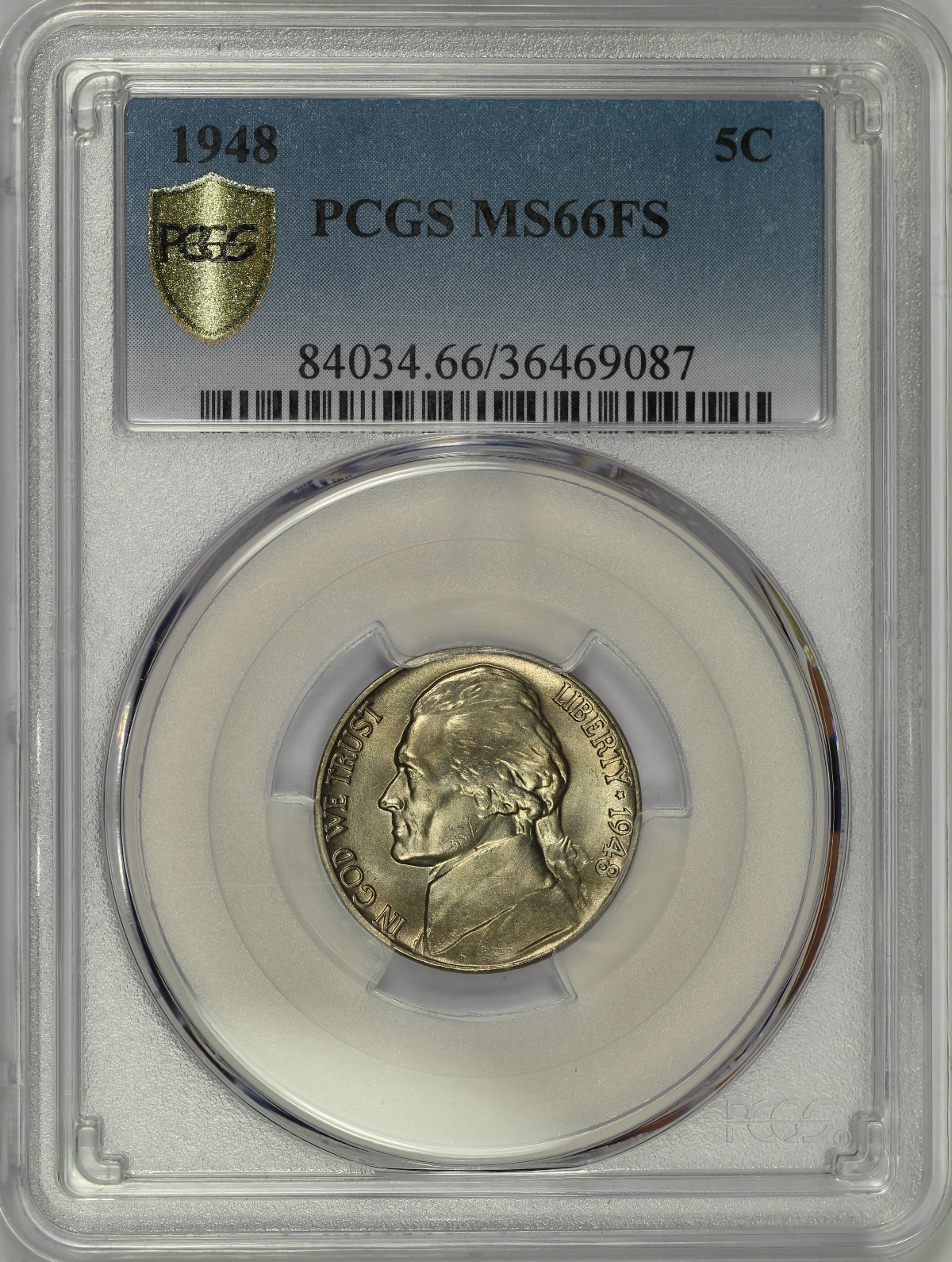 This 1948 Jefferson Nickel has been graded MS66FS by PCGS and is encapsulated in the newer-style edge-view holder. The FS designation has been given as the coin exhibits fully struck steps of Monticello on the reverse which is evident of a strongly struck example. A TrueView photo was taken by PCGS which captures the beauty of this coin in the best light. Only twenty-seven (27) examples of this date have earned the MS66FS grade at PCGS, with just two (2) examples grading higher, both just slightly higher at MS66+FS. The coin is untoned and very well struck. Just a few light marks are noticed under a close inspection. |