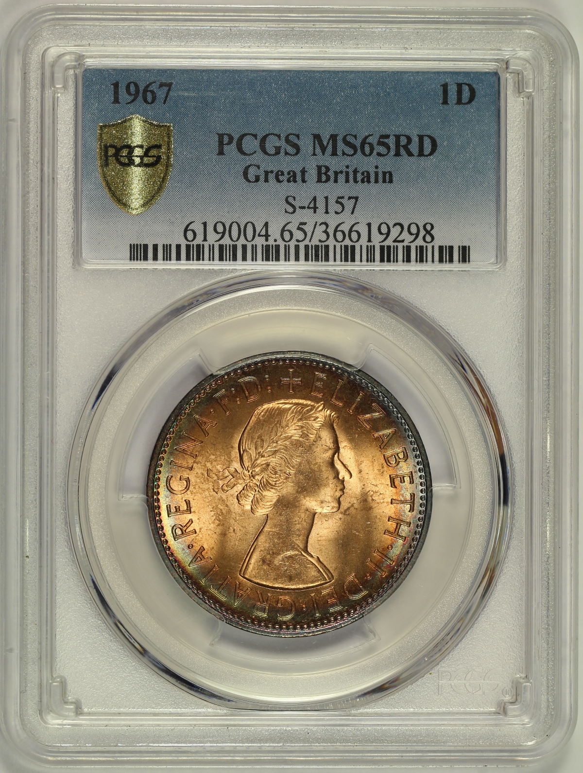 | Here is a 1967 Great Britain Queen Elizabeth II Penny that has been graded MS65RD by PCGS and is encapsulated in the newer-style edge-view holder. A TrueView photo was taken by PCGS which captures the beauty of this coin in the best light. This coin has spectacular rainbow rim toning on both sides that fully encircle the design. This style of colorful target toning is particularly eye appealing. An attractive gem example of the type. |