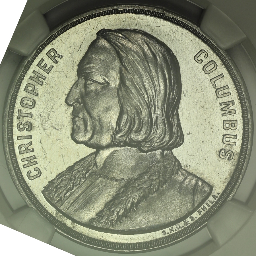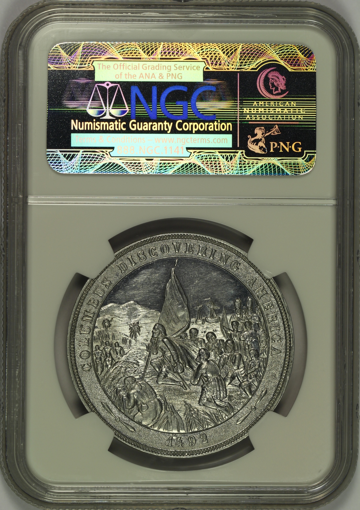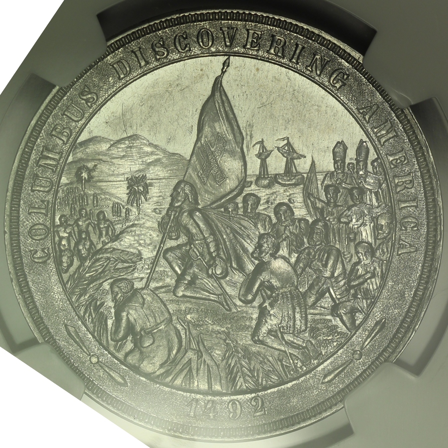 | The 1893 World Columbian Exposition held in Chicago to commemorate the 400th anniversary of the voyage of Christopher Columbus to the New World was one of the largest and most popular World’s Fairs in history. Many numismatic items were struck in connection with the Columbian Exposition from the first commemorative coins of the United States to nearly a hundred different so-called dollars. This is one of the so-called Columbus Bust Dollars from the Columbian Exposition listed as HK-232 in the Hibler-Kappen book on So-Called Dollars which has been graded MS62PL by NGC and is encapsulated in one of the newer-style edge-view holders. The obverse is a high relief depiction of Columbus and the reverse has a detailed depiction of Columbus Discovering American in 1492. The medal has strong prooflike fields on both sides with bright white cartwheel luster. There are several small marks in the fields which likely account for the relatively low mint state grade. An impressively mint state example of this detailed Columbus Bust Dollar from the Columbian Exposition. |