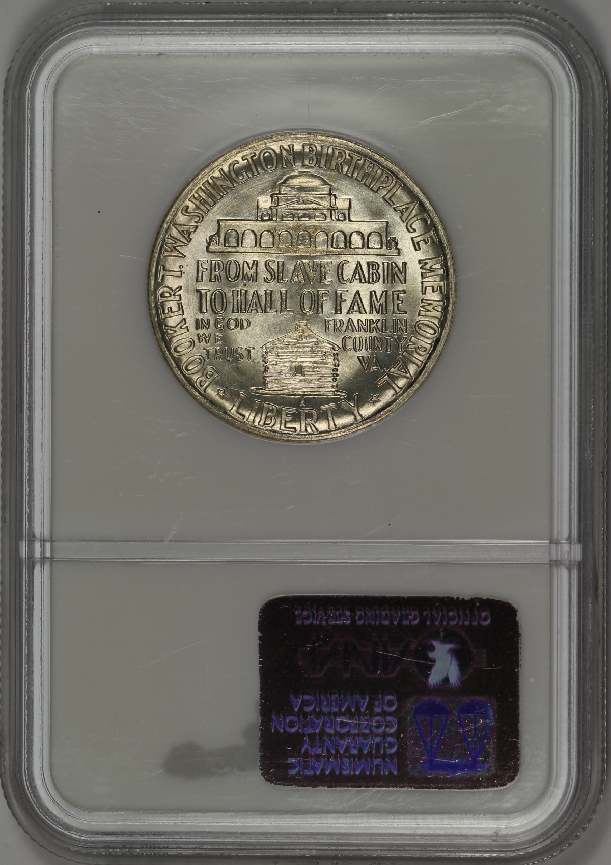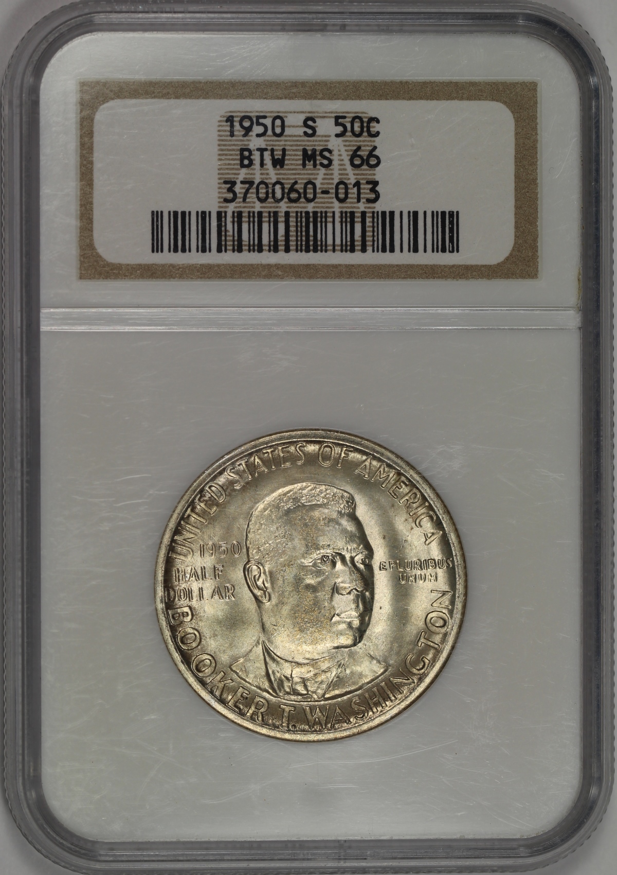 The Booker T. Washington Memorial Half Dollar was the first United States coin to bear the likeness of an African-American and was also the first United States coin to be designed by an African-American, Isaac Scott Hathaway. This 1950-S Booker T. Washington Commemorative Half Dollar has been graded MS66 by NGC. The coin quite lustrous on both sides and is mostly untoned. There are some marks on the obverse side preventing the piece from receiving a higher grade, but the overall eye appeal is still strong. A nice high grade example of the Booker T. Washington half dollar. |