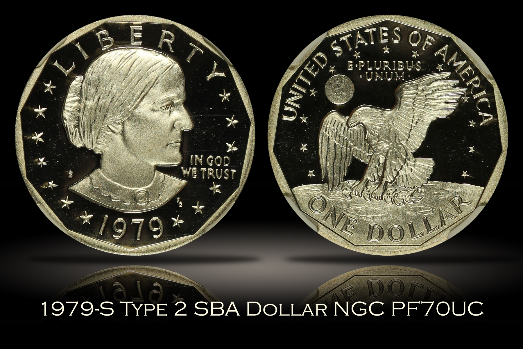 | In 1979, there were two major varieties of Proof Susan B. Anthony Dollars issued. The main difference is with the S mintmark. The Type 1 variety has a so-called “filled” S mintmark, while the Type 2 has a clear S mintmark. The Type 2 is the more scarce of the two varieties. This example of the 1979-S Type 2 Proof Susan B. Anthony Dollar has been graded PF70 Ultra Cameo by NGC and is encapsulated in one of the newer-style edge-view holders. The coin is untoned with deep black mirrors and frosty white devices. There are no noticeable marks, hits or other issues and as the PF70 grade suggests, the coin appears to be a perfect example of the first year proof SBA Dollar as issued by the Mint. |