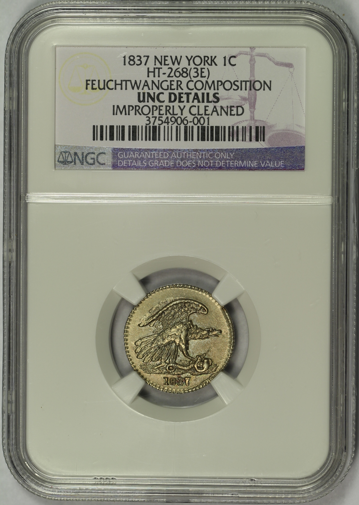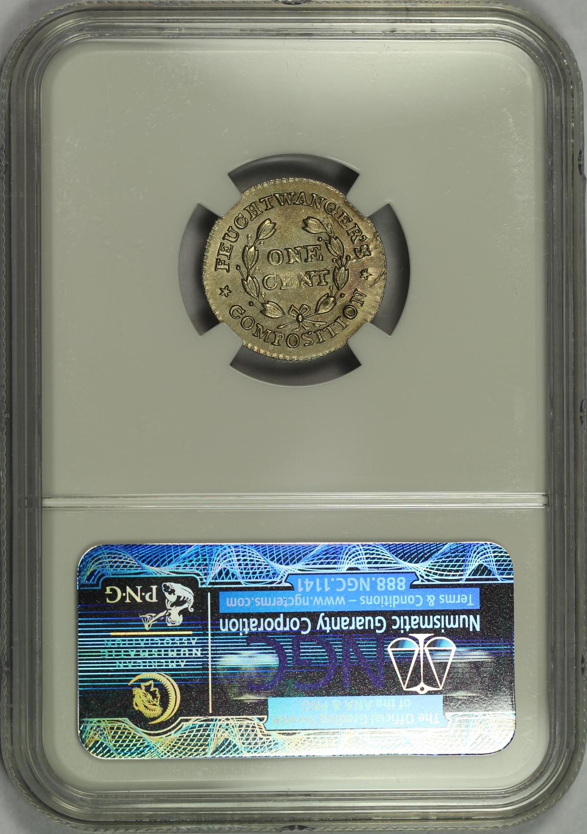 There are 14 known varieties of the 1837 Feuchtwanger Cent. Some are extremely common and some are extremely rare. This example offered here has been certified by NGC as Genuine with Uncirculated Details and is the 3E die pairing. The 3E die pair is a Rarity-2 variety meaning that it is a relatively common die pairing, but certainly not the most common. NGC believes this coin is ineligible for a numerical grade because of improper cleaning. I disagree with NGC and feel the coin should be gradable as the coin does not show hairlines or other signs of an improper cleaning. That said, the coin is a very beautiful uncirculated example of the Feuchtwanger Cent. The coin has nice original luster and is mostly a bright golden color but some light iridescent colorful toning is also present on the surfaces. Only a few small planchet defects on the right reverse and the typical slight weakness in the center of the reverse keeps this coin from being a ultra high-end example. Otherwise, the coin is virtually free of hits, marks or other issues. Despite the opinion of NGC that the piece has been improperly cleaned, this is a very pretty uncirculated example of the Feuchtwanger Cent. |