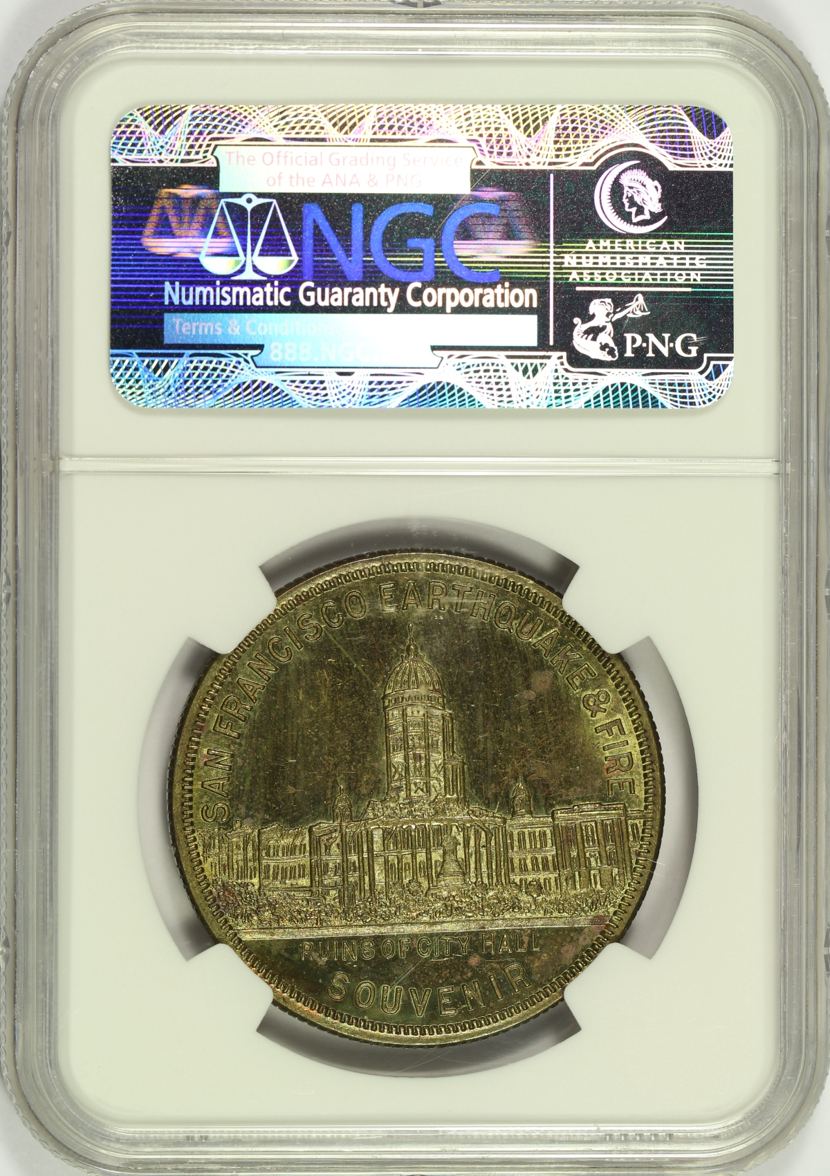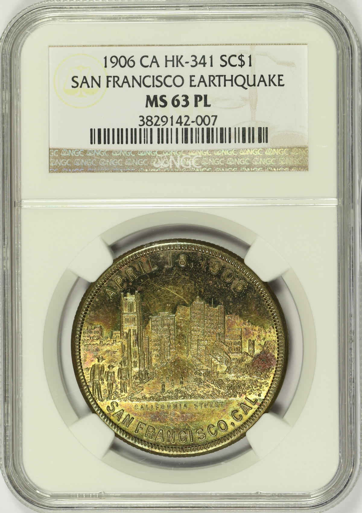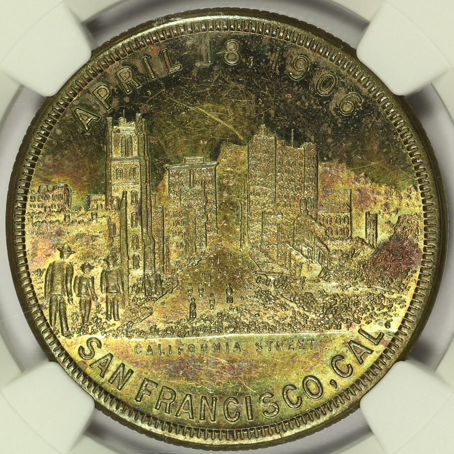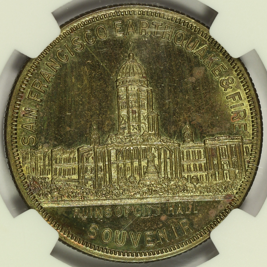 | On April 18, 1906, a very large earthquake and subsequent fire destroyed much of the City of San Francisco. While it is unclear who produced these medals, they were likely made for commercial purposes shortly after the disaster and remain very popular with collectors today. This example of the 1906 San Francisco Earthquake & Fire Souvenir Medal was struck in brass and is listed as HK-341 in the Hibler-Kappen reference on So-Called Dollars. This 1906 HK-341 medal has been graded MS63PL by NGC and is encapsulated in a newer-style edge-view holder. As the PL designation suggests, has strong prooflike fields which are very eye appealing, but very difficult to image. Multiple images have been provided to better show the full look of this piece. Not only are the fields prooflike, but there is some attractive pink and purple toning present when tilted into the light. Several light scratches and minor handling marks are present and exaggerated by the PL fields. That said, this is one of the very finest examples of the HK-341 that you will likely find. This is the sole finest known PL designated example of the HK-341 graded by NGC, with only a single MS63DPL grading higher. Do not miss your chance to obtain one of the finest known examples of this so-called dollar. |