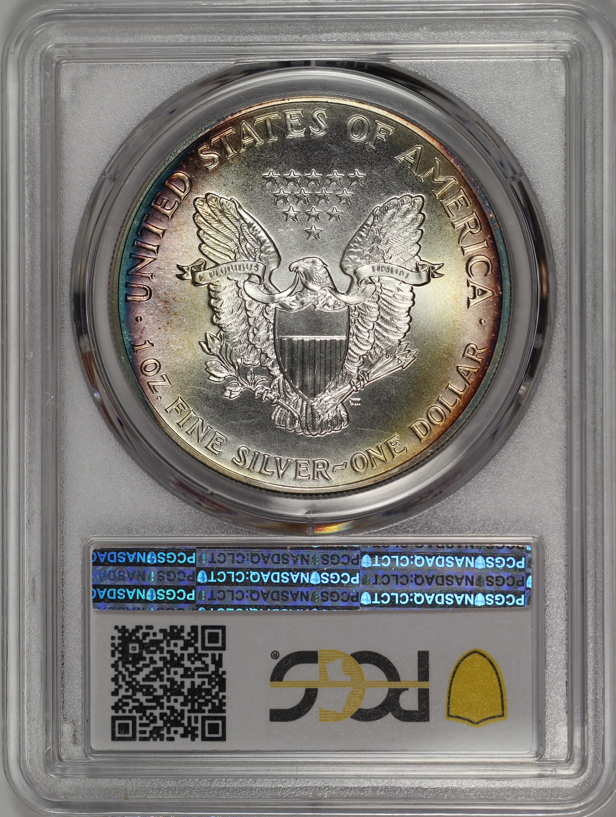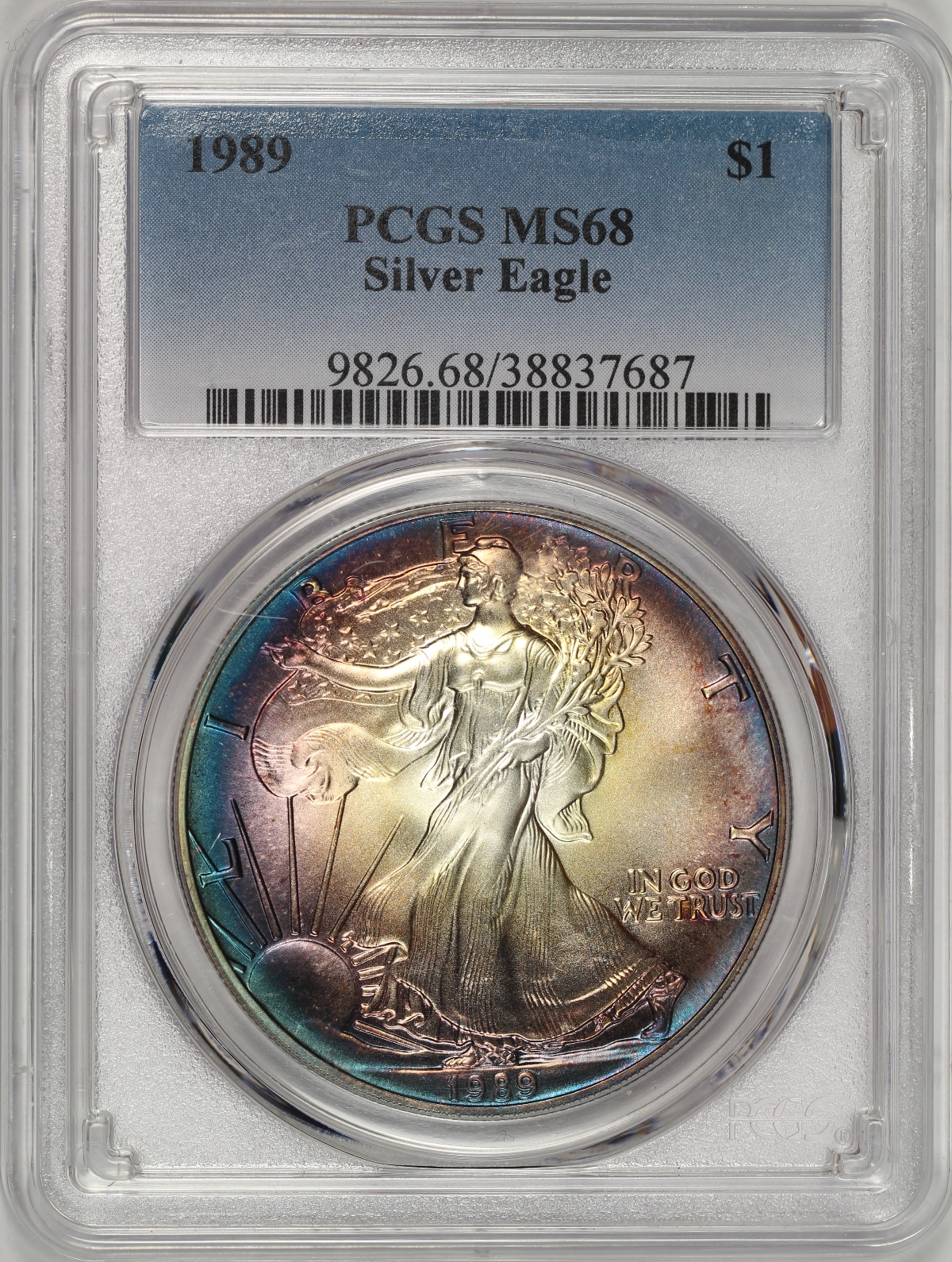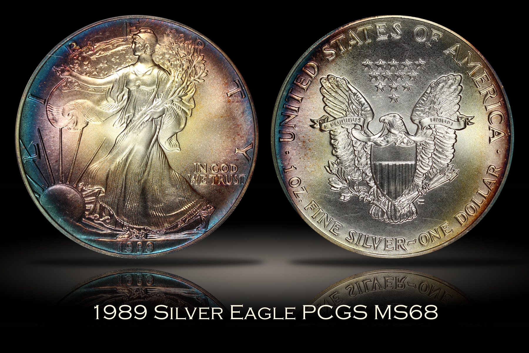 Here is a wonderfully toned 1989 Silver Eagle which has been graded MS68 by PCGS. American Silver Eagles are one ounce .999 fine silver and are known around the World. Colorfully toned Silver Eagles can be found as pure silver is quite susceptible to toning. However, finding an example with eye appealing color on both sides of the coin is somewhat more difficult. The example here has attractive purple and blue colors that surround the rims on both sides, but which are more concentrated on the obverse. The coin has extraordinary eye appeal and is an amazing example of the date. |