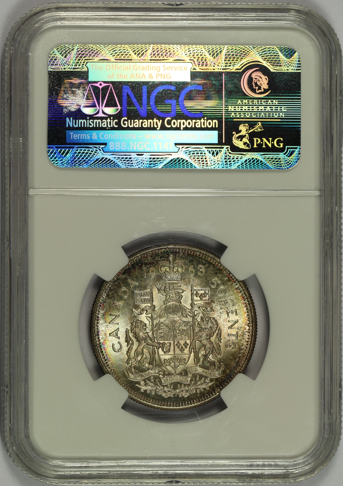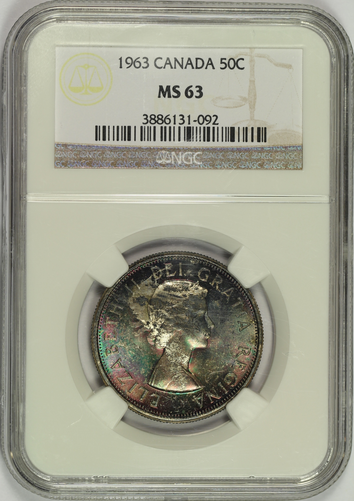 | Here is a 1963 Canada Half Dollar which has been graded MS63 by NGC and is encapsulated in one of the newer-style edge-view holders. The coin is deeply toned on the obverse with purple, pink and green colors. The reverse is much more lightly toned with a narrow band of rainbow color which rests near the rim. The luster of the coin’s slightly prooflike surfaces is very strong, and when combined with the toning, creates nice eye appeal. The coin shows several hits and marks on the obverse in particular, accounting for the relatively low mint state grade. A very interested toned Canadian Half Dollar. |