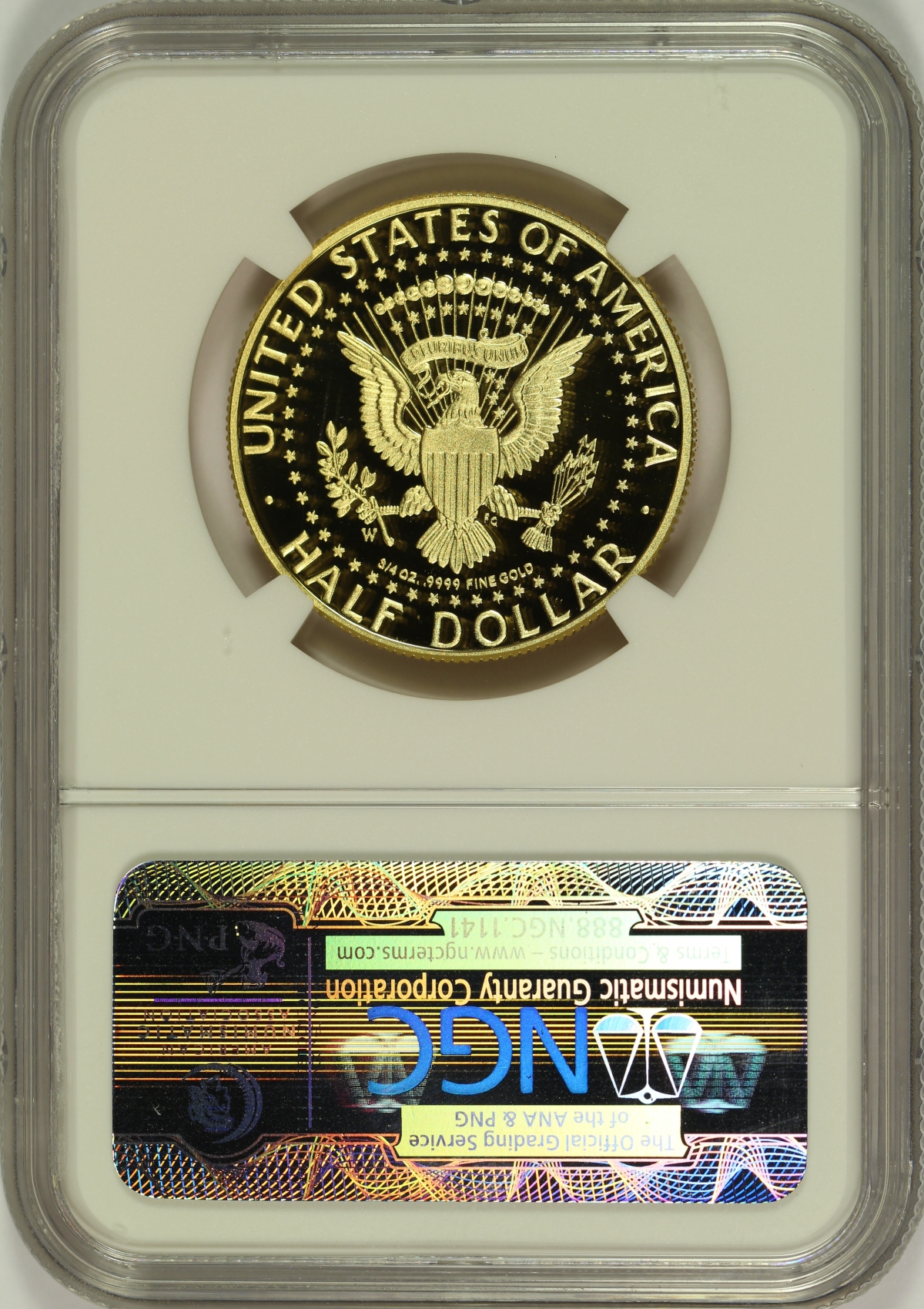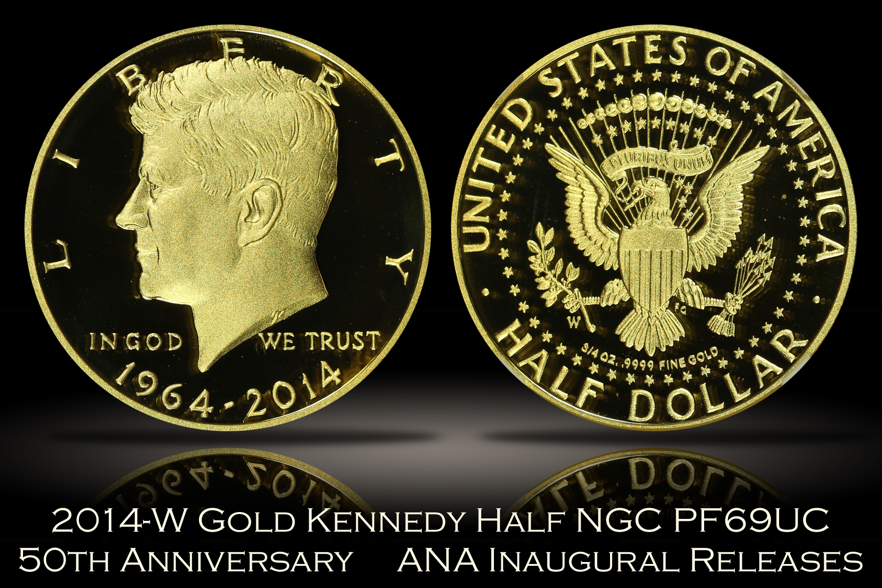 | To celebrate the 50th anniversary of the Kennedy Half Dollar, the United States Mint struck some Kennedy Half Dollars in 3/4 oz. .9999 Fine Gold in 2014 with a dual 1964-2014 date. Upon their release, these coins were extremely popular. They were first released at the Chicago ANA World’s Fair of Money in August 2014 where they were in so much demand that the Mint was forced to cut off sales part way through the show for public safety reasons. Examples of the coin that were purchased at the show and graded at the show were eligible for special labeling by the major grading services. This example of the 2014-W Gold Kennedy Half Dollar has been graded PF69 Ultra Cameo by NGC and is encapsulated in a newer-style edge-view holder. The NGC label also has the special “ANA Inaugural Releases” designation meaning this was one of the few examples bought at the 2014 Chicago ANA World’s Fair of Money and graded at the show. The coin itself is a beautiful piece with amazing eye appeal. The coin is virtually perfect and the only issues of note are a couple of microscopic spots in the reverse field. This coin also comes with the original United States Mint box for the coin and the certificate of authenticity. A beautiful .9999 fine gold Kennedy Half Dollar with the special ANA labeling.