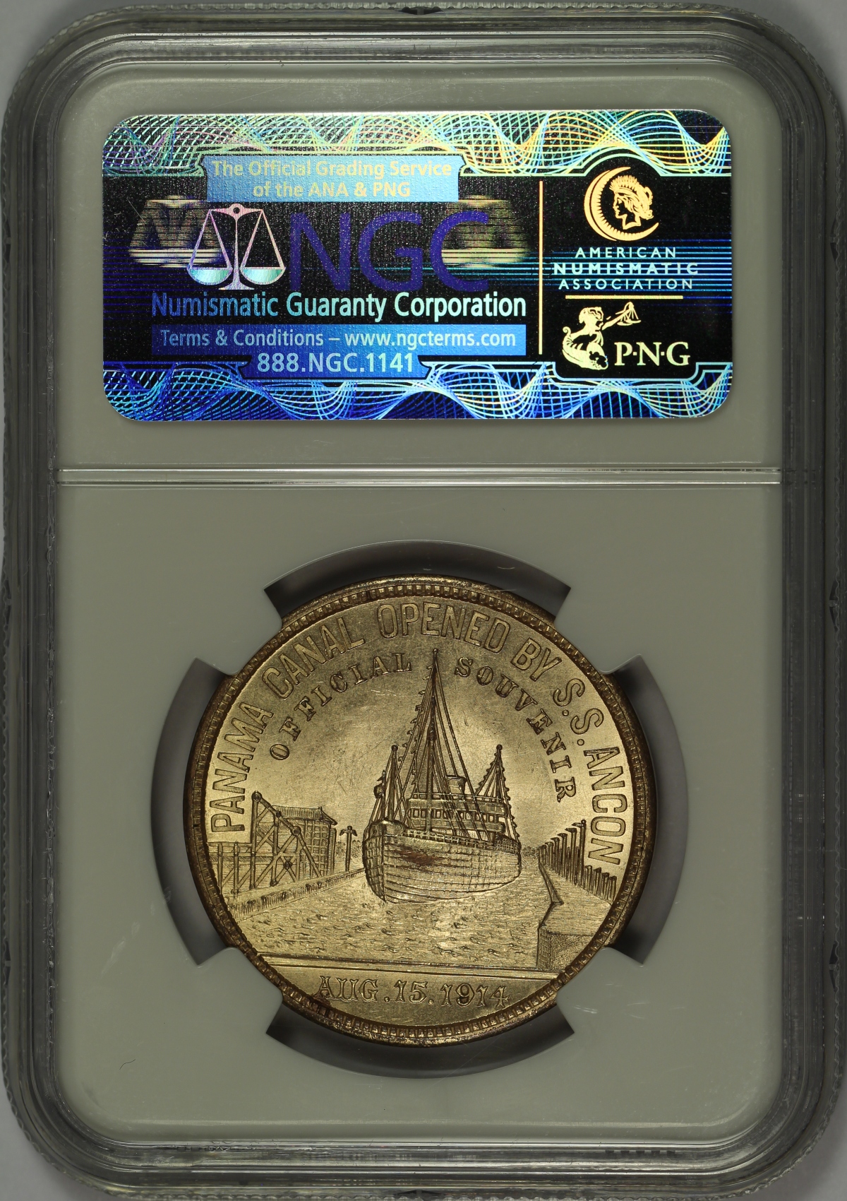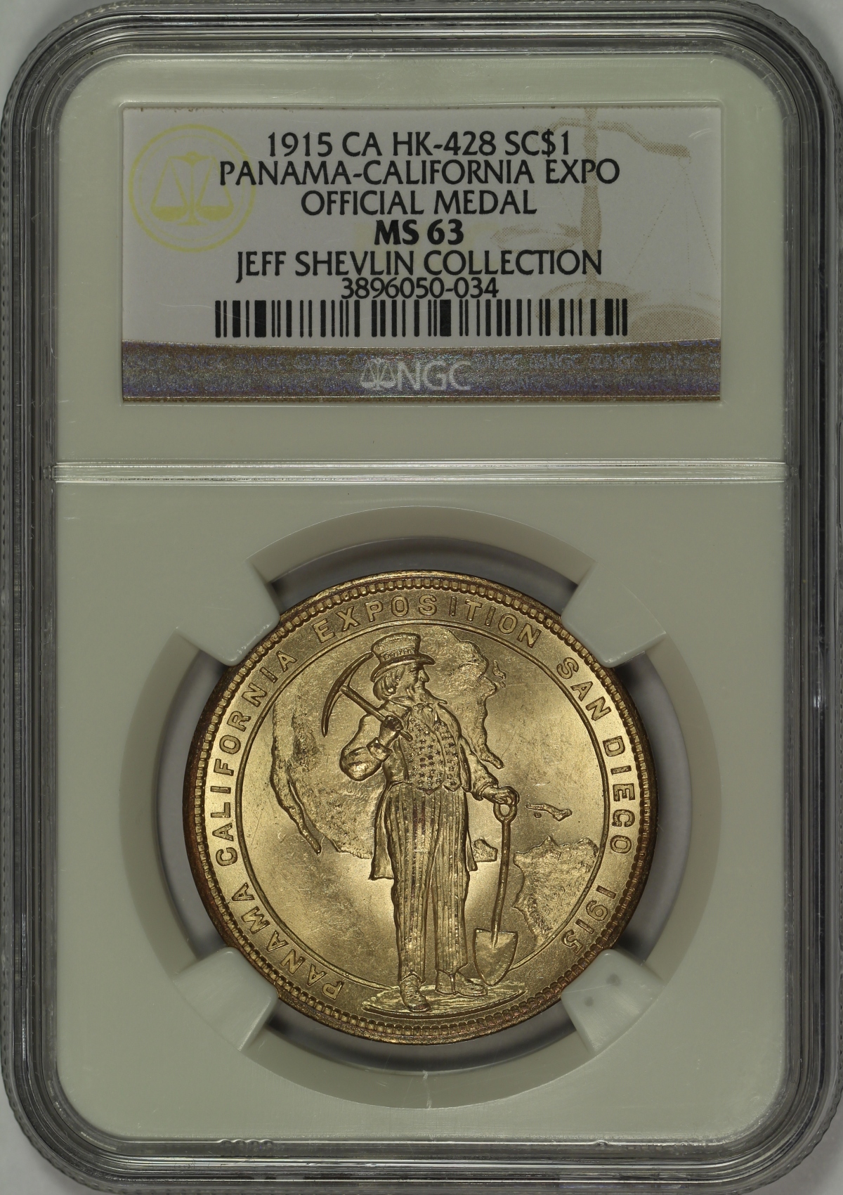 Francisco during 1915, the Panama-California Exposition was well attended. Official medals were produced for the exposition and struck at the United States Mint exhibit on the fair grounds. These official medals were designed by C.K. Berryman, then a cartoonist for the Washington Star, and were engraved by Charles Barber. The medals feature the very popular obverse design of Uncle Sam with his shovel lying across the Panama Canal. The reverse design of the first ship to pass through the Panama Canal, the S.S. Ancon, is also well executed. The official medals were struck in silver, bronze and gilt and examples dated both 1915 and 1916 were minted. This example of the 1915 Panama-California Expo Gilt Official Medal is listed as HK-428 in the Hibler-Kappen book on So-Called Dollars and has been graded MS63 by NGC and is encapsulated in one of the newer-style edge-view holders. The piece is also pedigreed to the Jeff Shevlin Collection on the NGC label. The medal has a bright