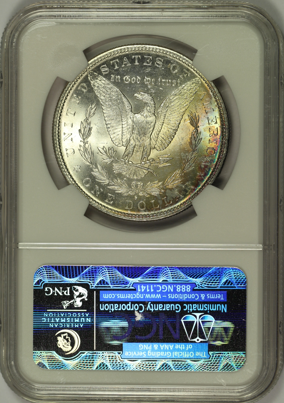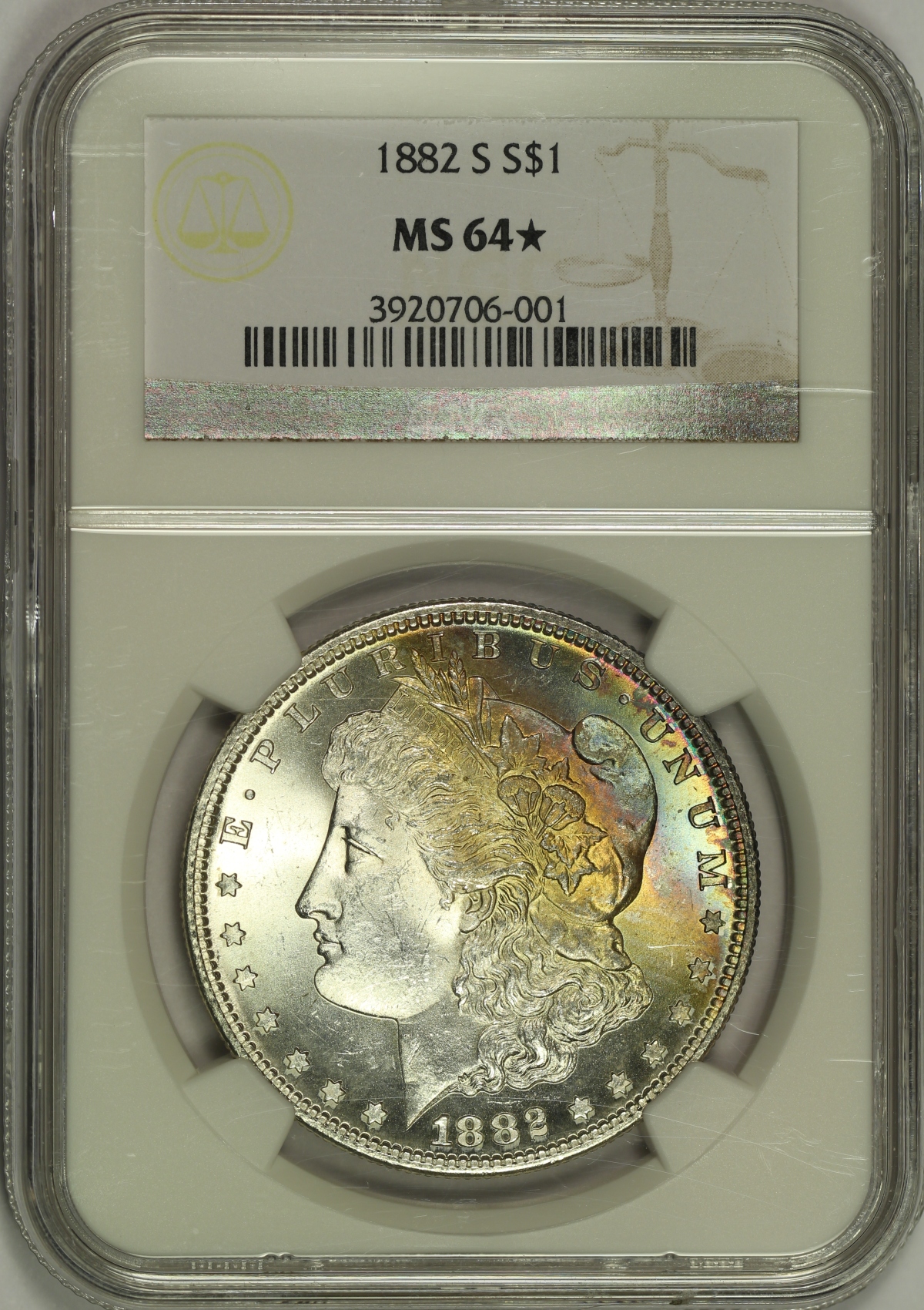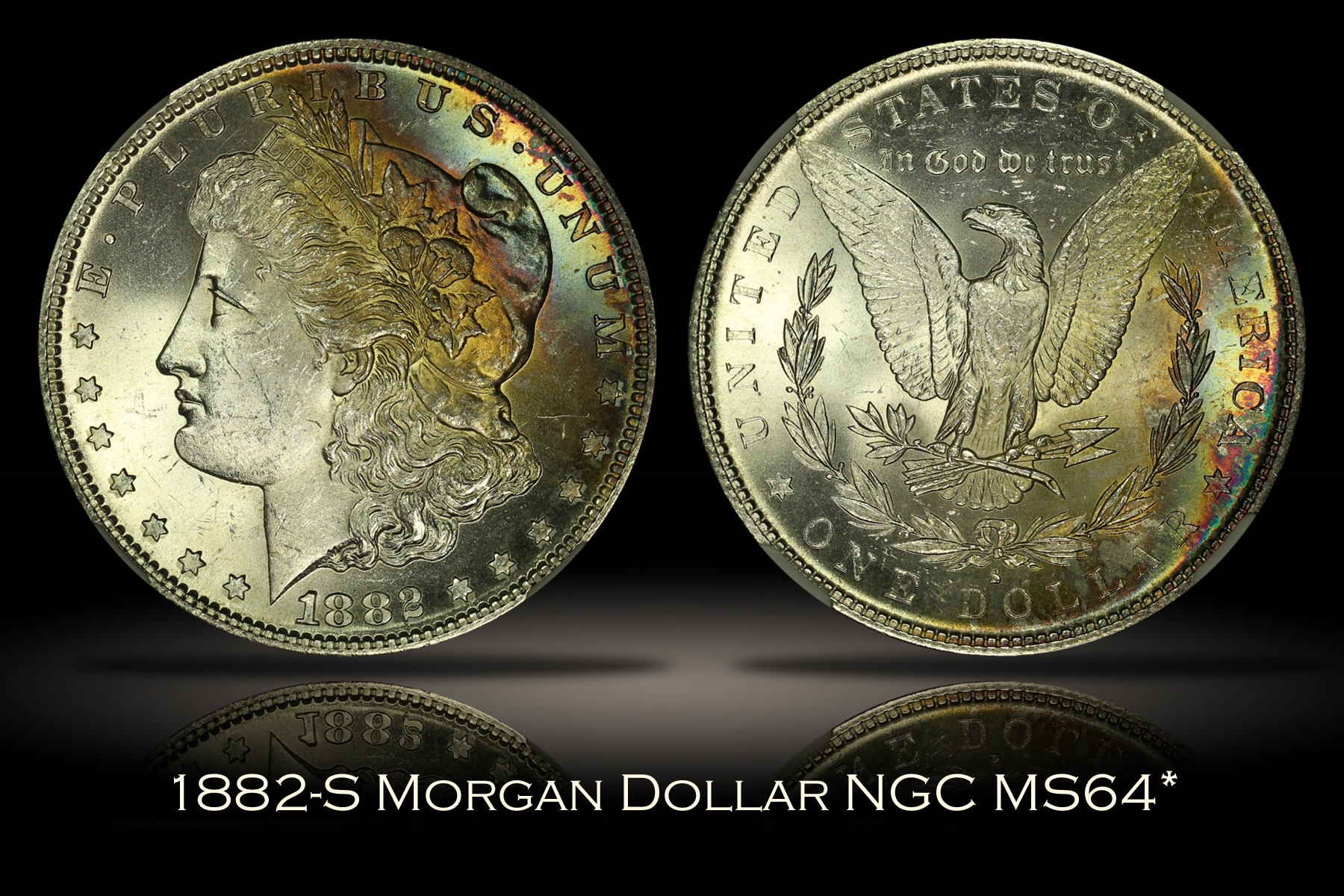 | This 1882-S Morgan Silver Dollar has been graded MS64* by NGC and is encapsulated in one of the newer-style edge-view holders. The star designation is given by NGC to coins with exceptional eye appeal. This coin shows strong mint luster on each side and is quite flashy, as is typically the case of mint state dollars of this date. Both the obverse and the reverse of the coin each has a patch of colorful rainbow toning which covers roughly 20% of each side. The piece does have several small scuffs and marks, mostly focused on the high points of the obverse, which limit the numerical grade of the coin. Overall, this is a flashy mint state Morgan Dollar with a bit of pretty color on each side. |