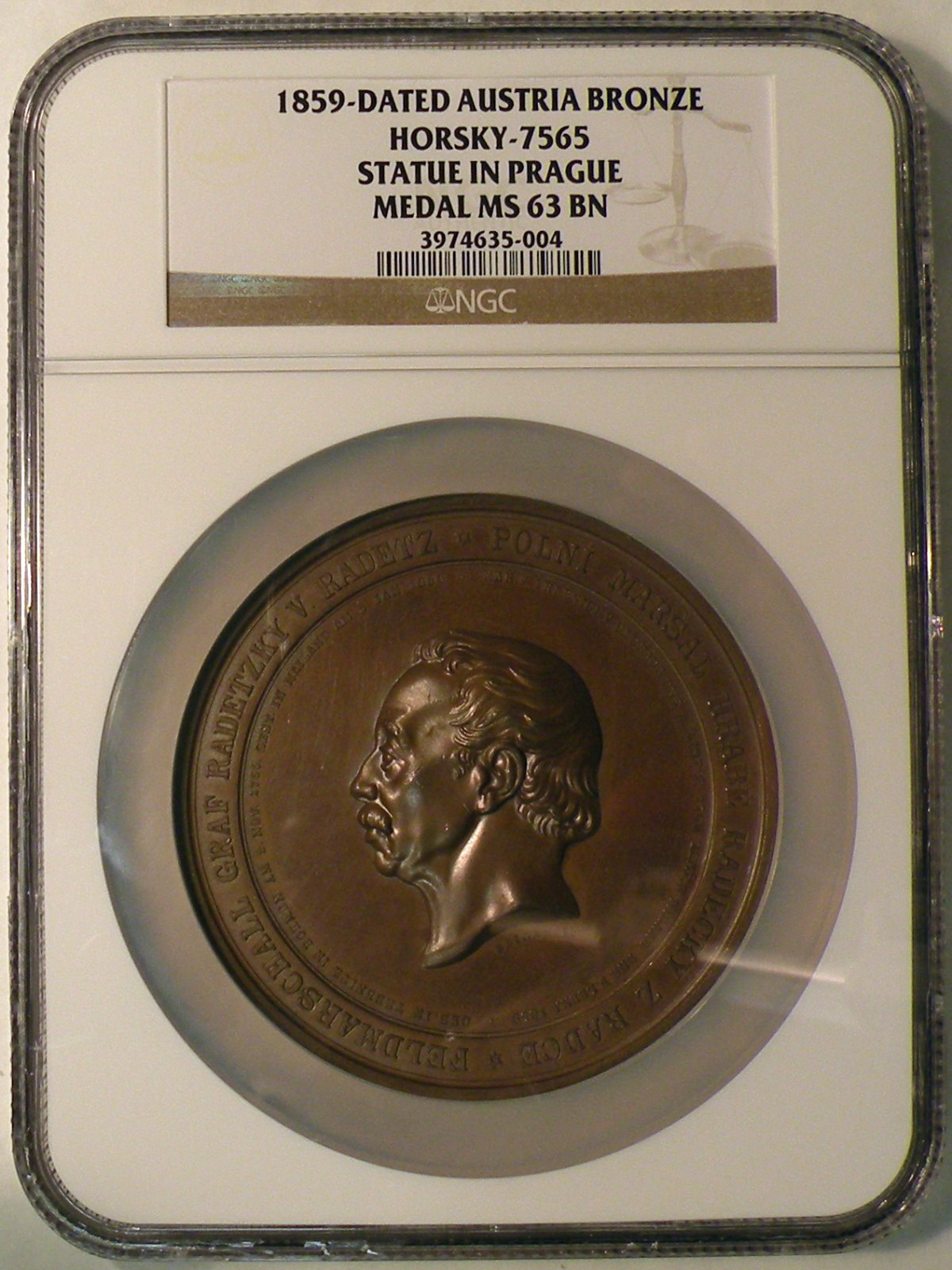 This 1859 Austria Bronze Statue in Prague Horsky-7565 Medal has been graded MS63BN by NGC and is encapsulated in one of their large-sized holders. The medal appears to have been issued following the death of Joseph Radetzky von Radetz to commemorate a statue in his honor in Prague. This is a very high relief medal that measures just over 3 inches in diameter and is in excellent overall condition. The obverse features a detailed and high relief image of General Radetzky. The reverse features an image of the Radetzky Memorial in Prague. There are a few minor blemishes on each side, but none are significant or major. The fields of the piece are also slightly prooflike and the medal is very well struck. An interesting high relief medal of Count Radetzky with a great overall look. |