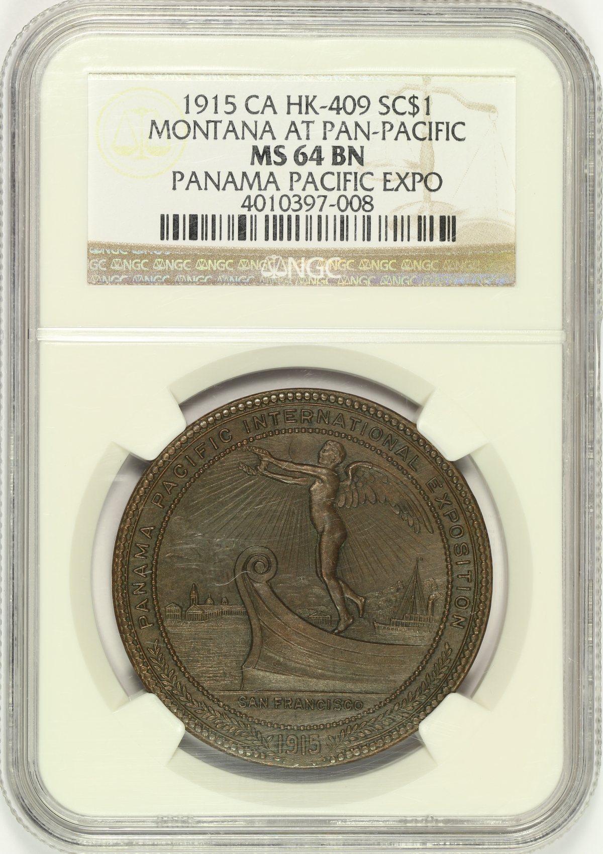 | The 1915 Panama-Pacific International Exposition was held in San Francisco, California to celebrate the opening of the Panama Canal. In addition to the coins and official medals of the Exposition which were produced by the United States Mint, many medals were made by others related to the PPIE, including medals commissioned by various States to help raise funds for their exhibits at the Exposition. This medal is the Montana Exposition Fund Dollar issued at the 1915 Panama-Pacific Expo listed as HK-409 in the Hibler-Kappen book on So-Called Dollars which has been graded MS64BN by NGC and is encapsulated in one of the newer-style edge-view holders. This bronze medal is well struck with considerable detail in the design. The obverse has a Winged Victory standing on the bow of a ship with the Exposition fairground in the background. The reverse shows a stream with mountains and trees in the background and tools in the foreground. This is a very nice chocolate brown example of this detailed so-called dollar from the 1915 Pan-Pac Expo that seems better than the assigned grade would otherwise suggest. |