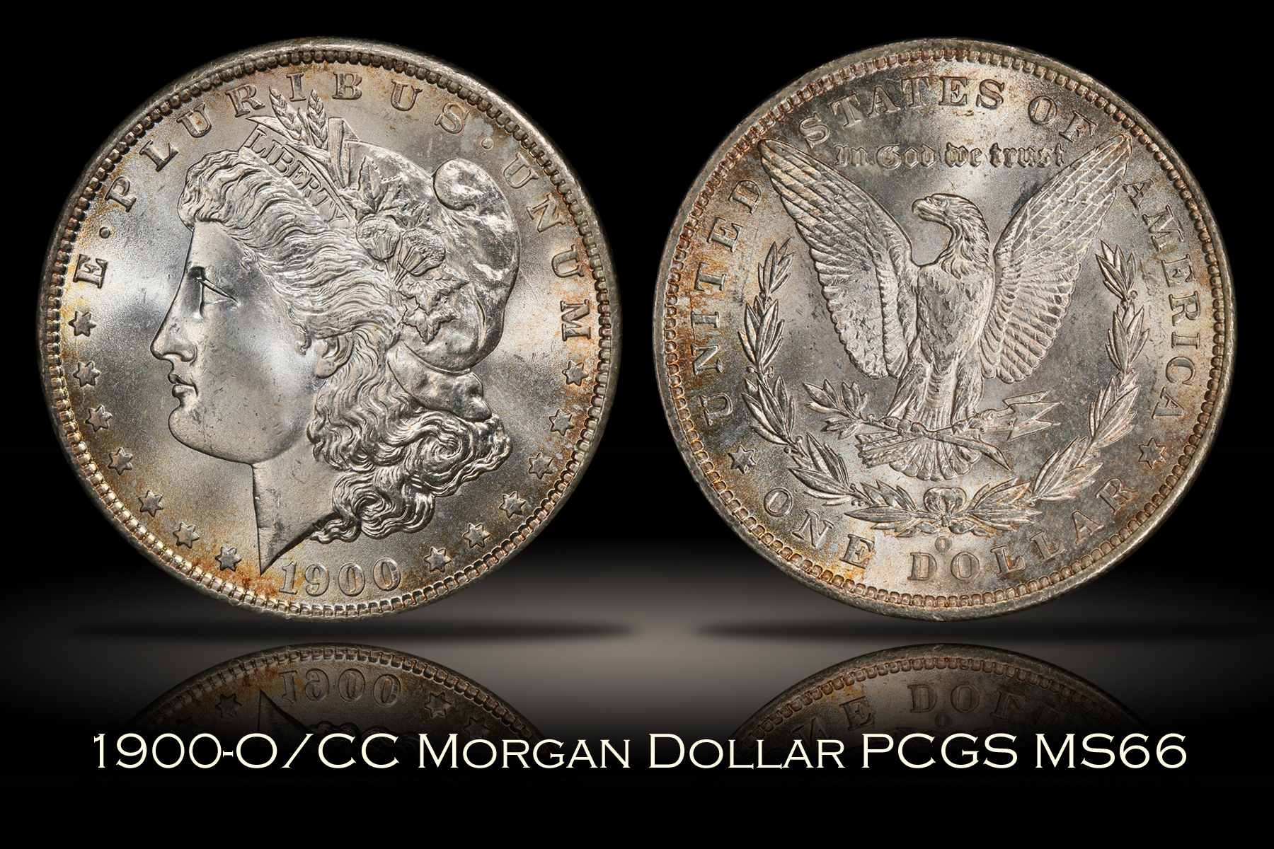 | The 1900-O/CC Morgan Silver Dollar is an interesting over mint mark variety. Presumably, an old reverse die with a CC mint mark was reworked and given an O mint mark for New Orleans. By 1900, the CC reverse dies were no longer needed as the Carson City Mint had stopped minting coins several years prior in 1893. However, after the reverse dies had been reworked with the new O mint mark, clear remnants of the underlying CC mint mark still remained. This example of the 1900-O/CC Morgan Dollar has been graded MS66 by PCGS and is encapsulated in one of the newer-style edge-view holders. This coin is a beautiful high-end example with just a touch of toning along the rims. Very difficult to find examples of this popular variety in such amazing condition. |