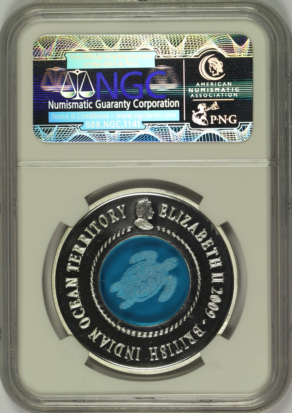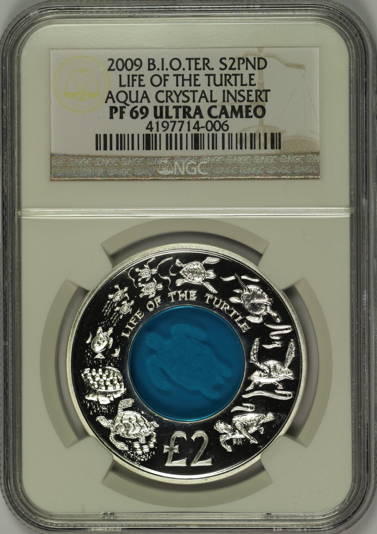 | Here is a 2009 British Indian Ocean Territory Silver Two Pounds Life of the Turtle coin which has been graded PF69 Ultra Cameo by NGC. With a mintage of only 5000, this relatively scarce coin is very interesting with its two part composition. The outer ring of sterling silver shows several images of turtles at various stages of life from eggs up through full adulthood. The inner portion of the coin is a piece of blue crystal which has another turtle etched into the surface. The coin was struck by the Pobjoy Mint and was originally sold at an issue price of $129. To date, this is the only example of this issue graded PF69UC by NGC with no examples grading higher. A very interesting top pop graded coin for the collector of interesting coins or for the fan of turtles! |
