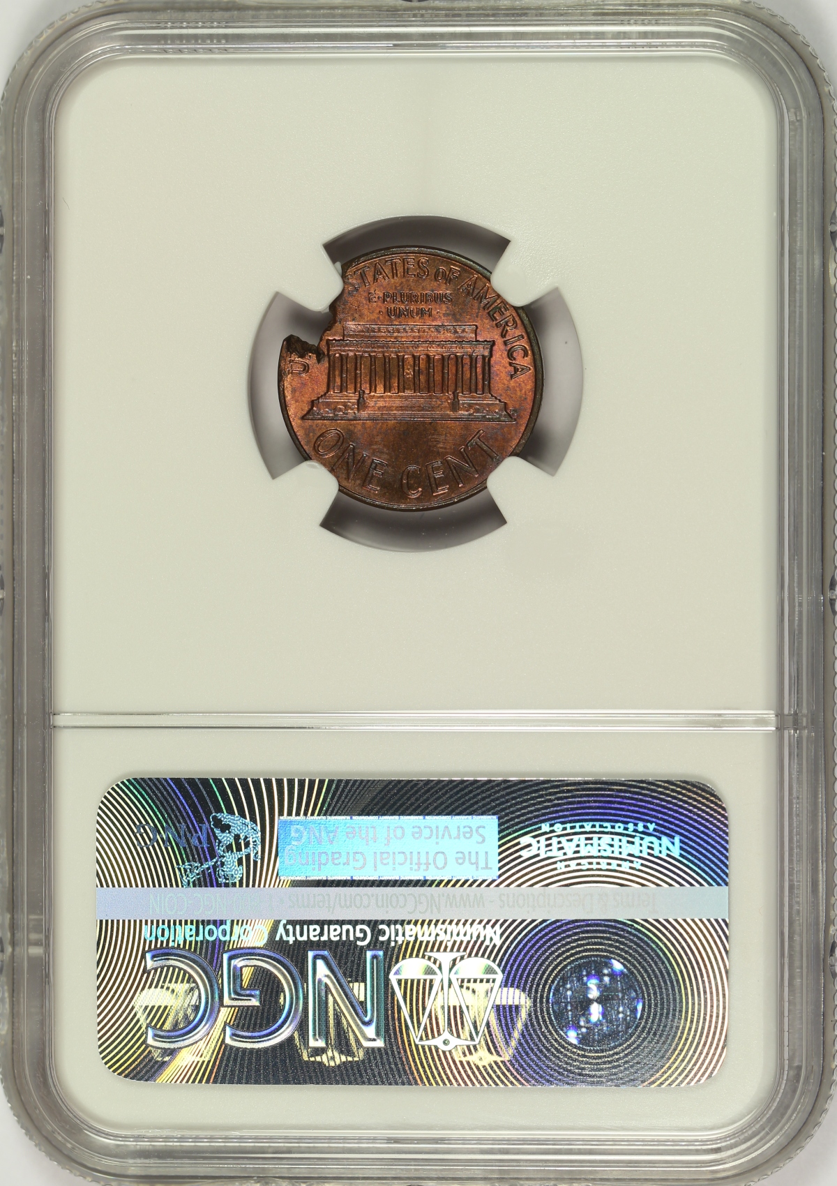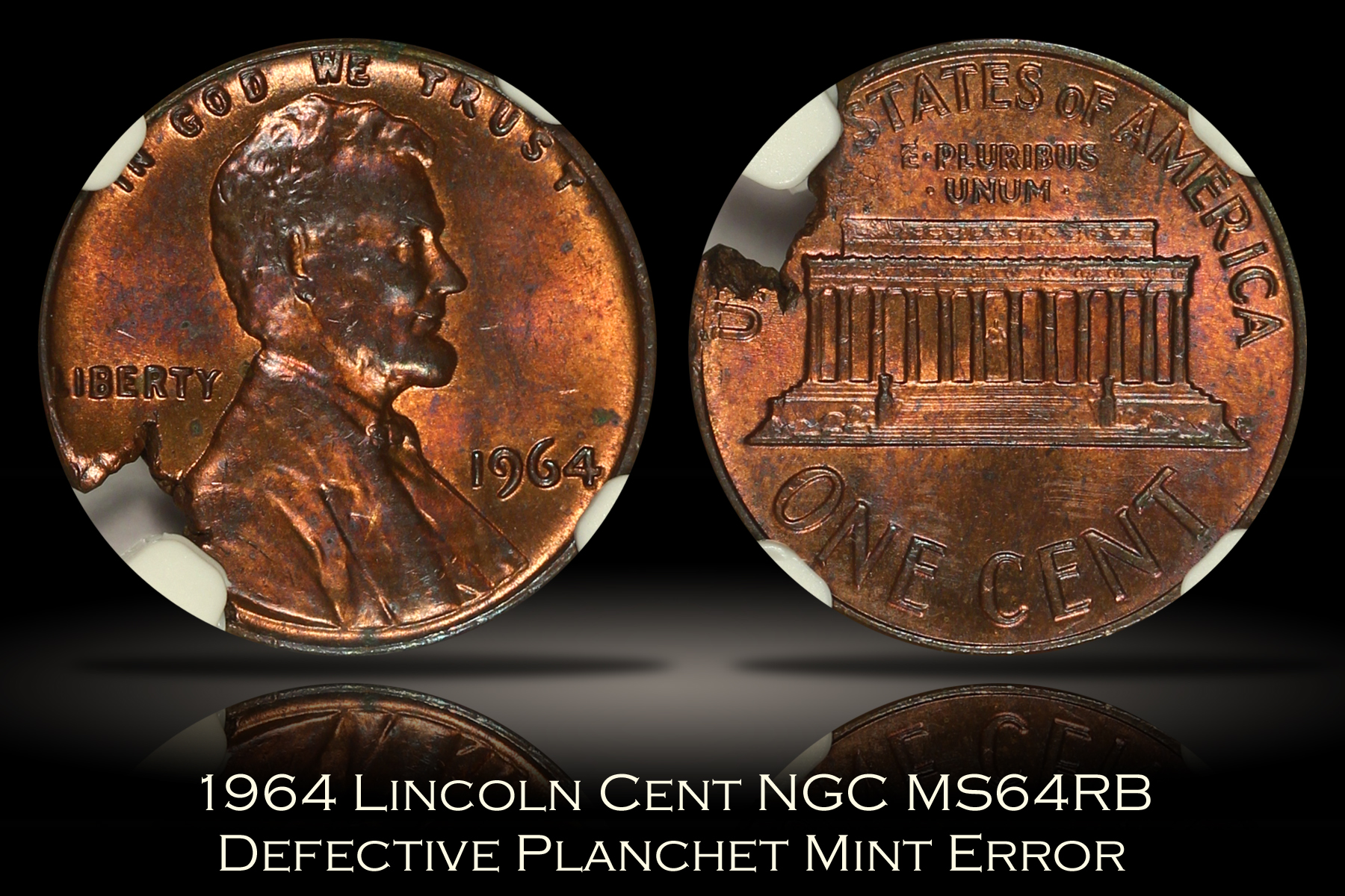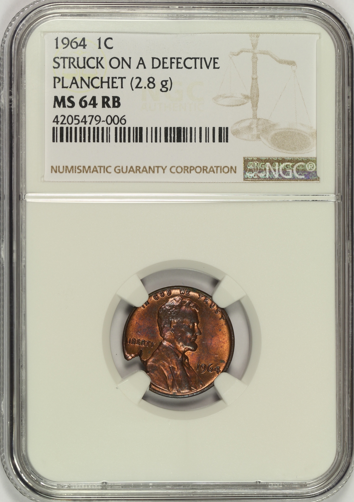 | This 1964 Lincoln Cent Error Coin has been graded MS64RB by NGC and is encapsulated in one of the newer-style edge-view holders. The coin was struck on a defective planchet in which the lower left portion of the metal was broken away. This error is denoted on the NGC label as well as the 2.8 gram weight of the piece. This is an interesting error with excellent eye appeal. The coin is otherwise well struck and the details show nicely. Some original mint red color remains on the uncirculated piece. A pleasing mint state Lincoln Cent minting error that is fun to display.