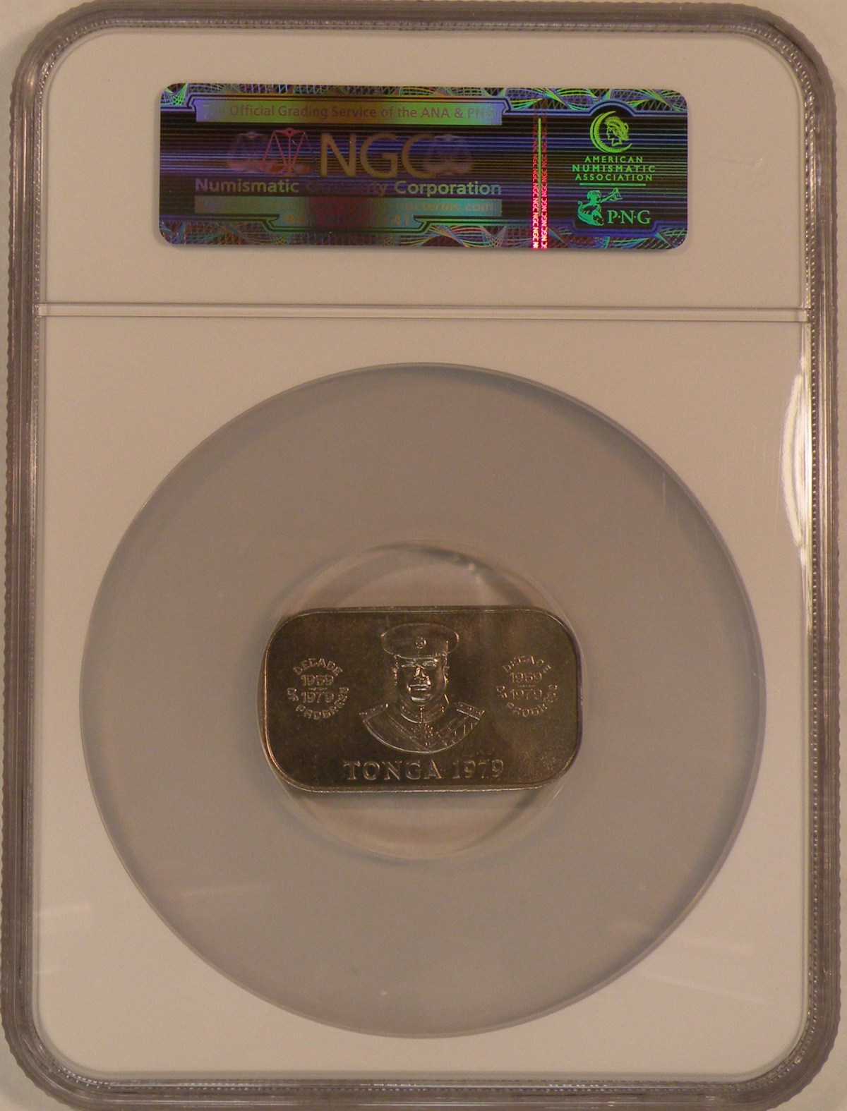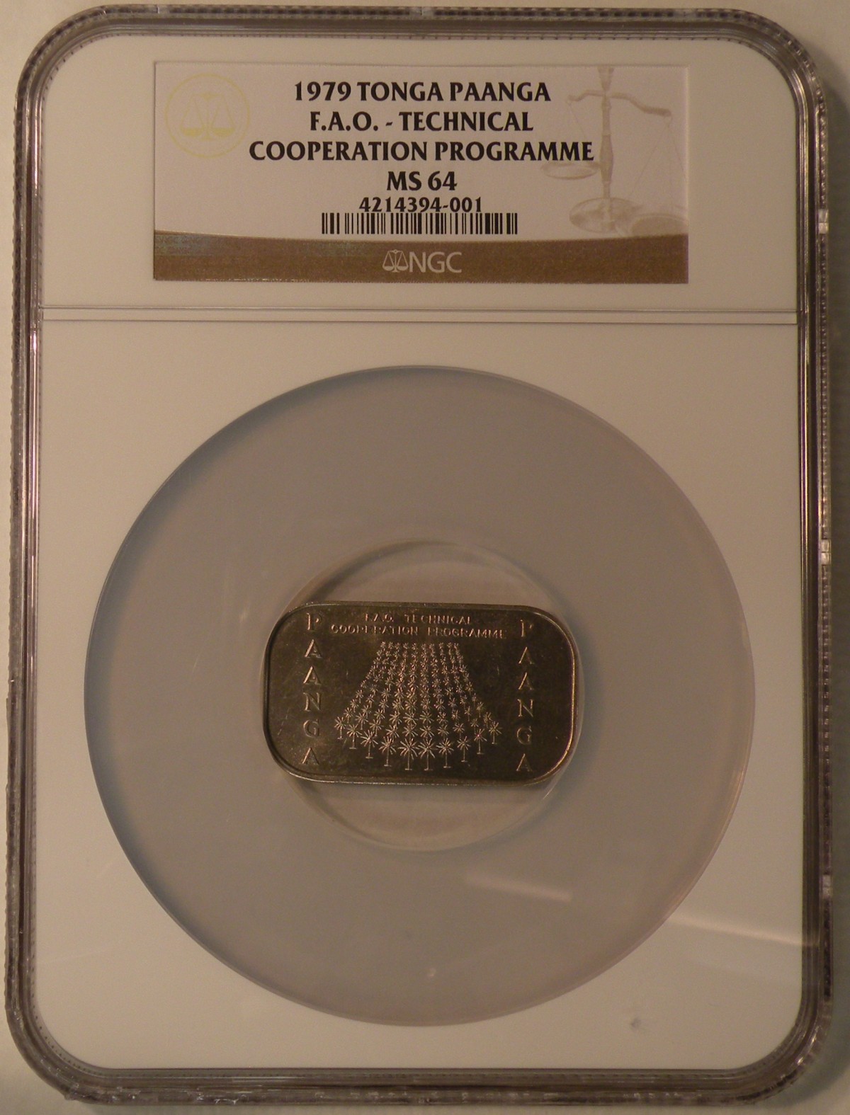 | This 1979 Tonga Paanga has been graded MS64 by NGC and is encapsulated in one of their large-sized holders. This Tonga Paanga, or Pa’anga, is an interesting rectangular shaped coin that measures 48mm by 27mm. The obverse features the image of Taufa’ahau Tupou IV and the reverse features 100 palm trees and references the F.A.O. Technical Cooperation Program. Only 26,000 of these coins were minted and this is a relatively nice example with just a few minor hits and no major issues. An interesting rectangular coin from Tonga. |