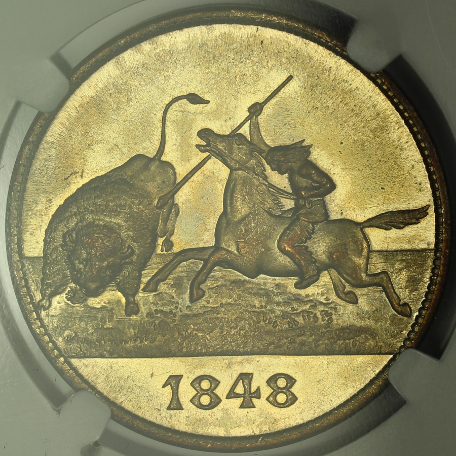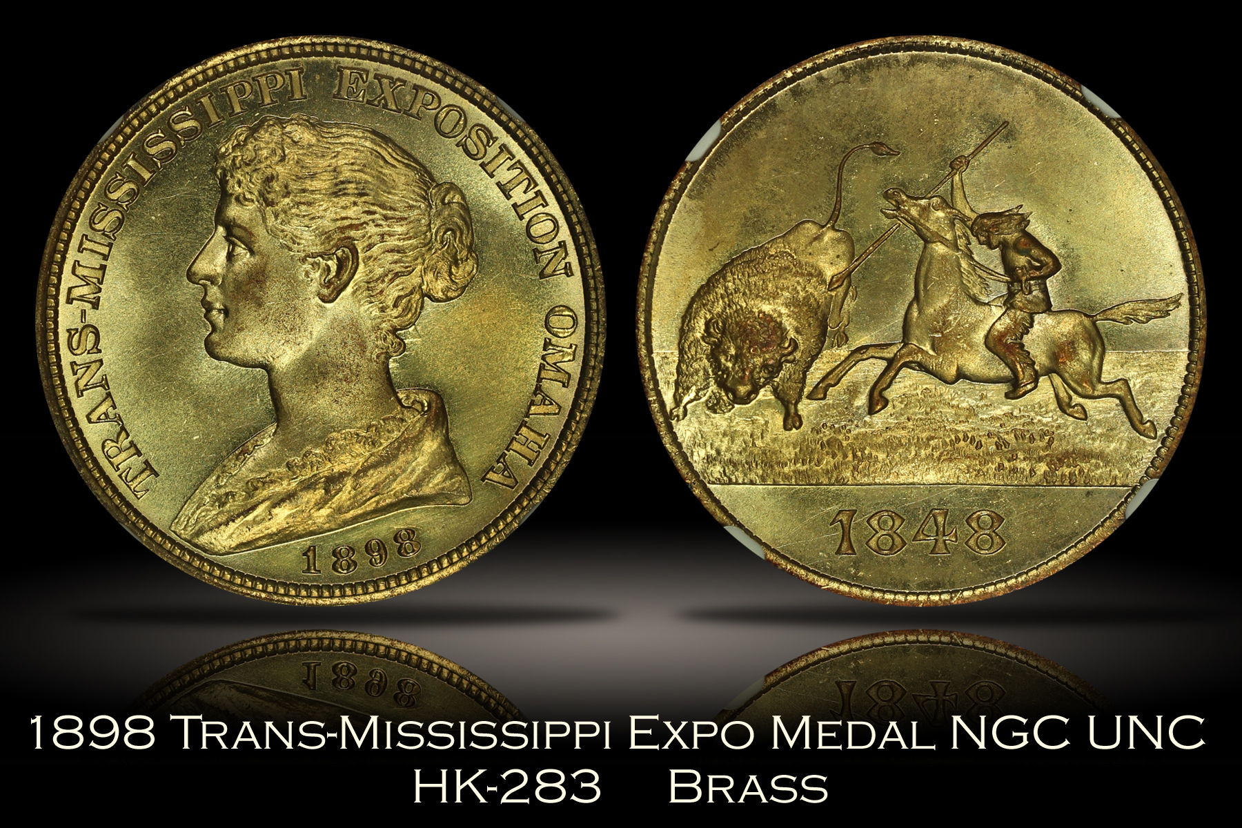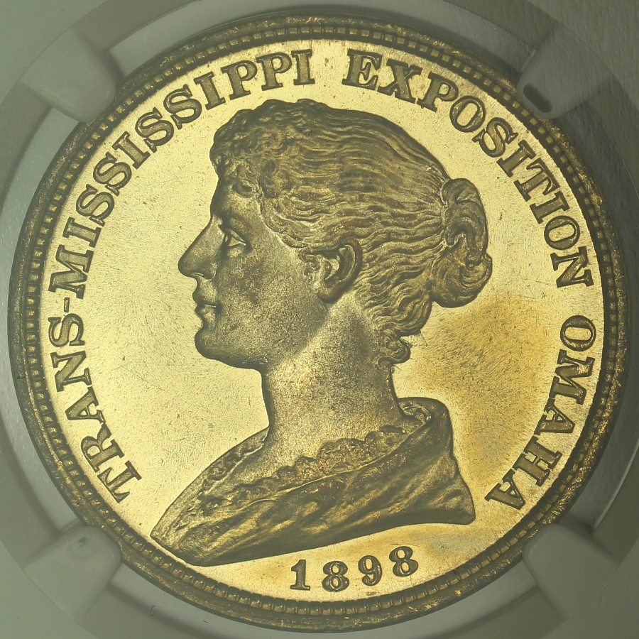 | The Trans-Mississippi and International Exposition was a World’s Fair held in Omaha, Nebraska in 1898. Official medals for the Exposition were struck by the United States Mint at the Exposition in various metal compositions. This example of the 1898 Trans-Mississippi Exposition Official Medal was struck in brass and is listed as HK-283 in the Hibler-Kappen reference on So-Called Dollars. This 1898 HK-283 medal has been certified as genuine with UNC Details by NGC and is encapsulated in a newer-style edge-view holder. The piece is clearly uncirculated and has the look of a very high grade specimen with amazing luster, minimal marks and strong prooflike fields. Gilt versions of the HK-283 medal are also known and it appears this example may be one of those given the bright golden color. Unfortunately, the right obverse fields do show some hairlines that are indicative of a past cleaning and prevented the assignment of a numerical grade by NGC. The design of the Native American riding on horseback hunting a buffalo is well-detailed and very impressive. Overall, this popular so-called dollar has tremendous overall eye appeal and is a relative bargain given the minor issues. |